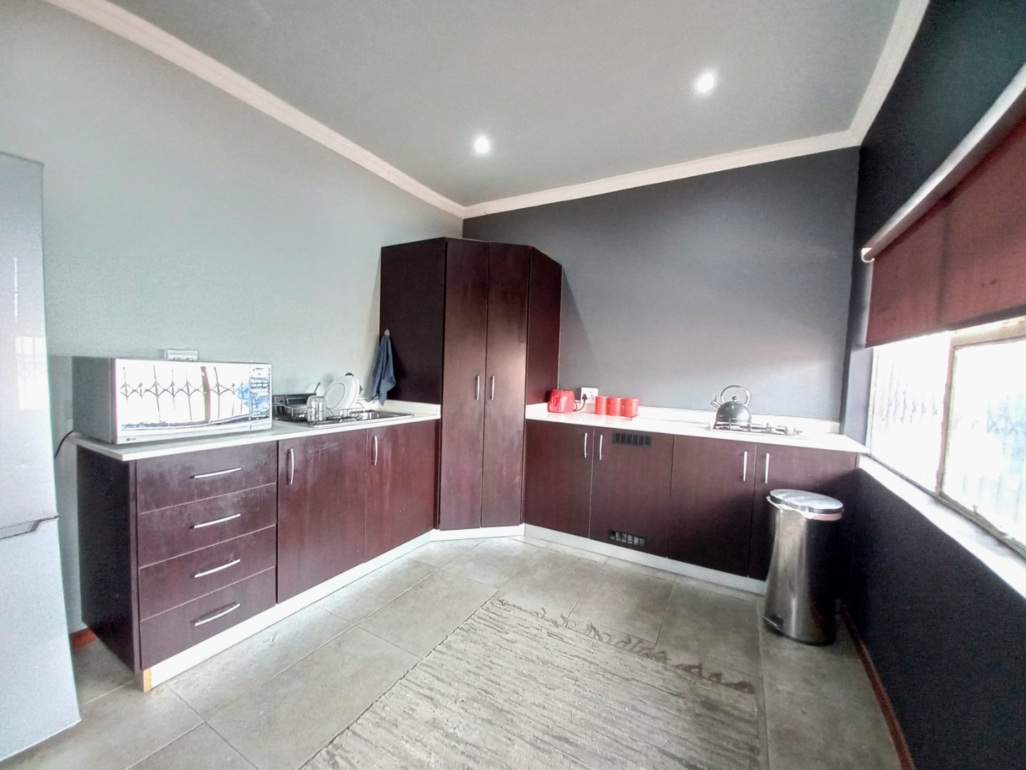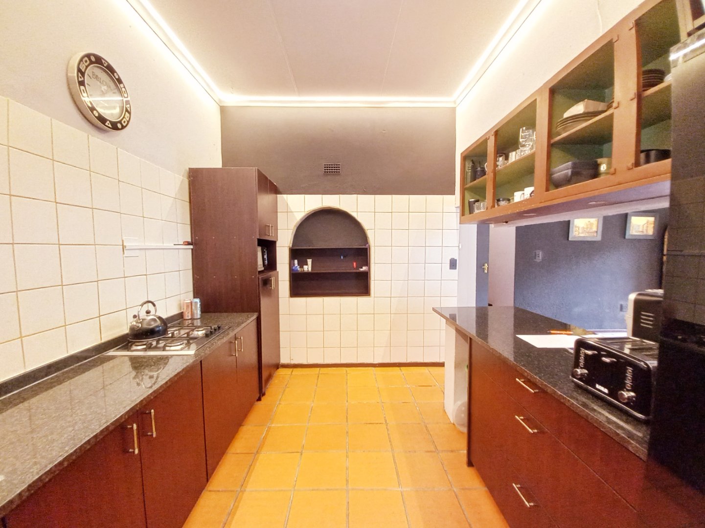 Modern tiled kitchen with granite tops, ample cupboards, gas hob, and breakfast nook