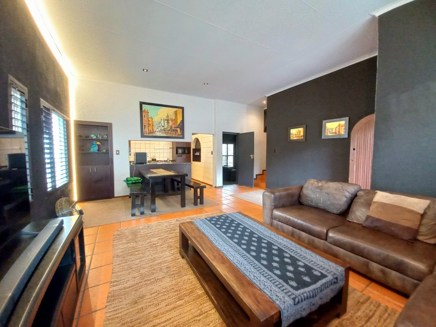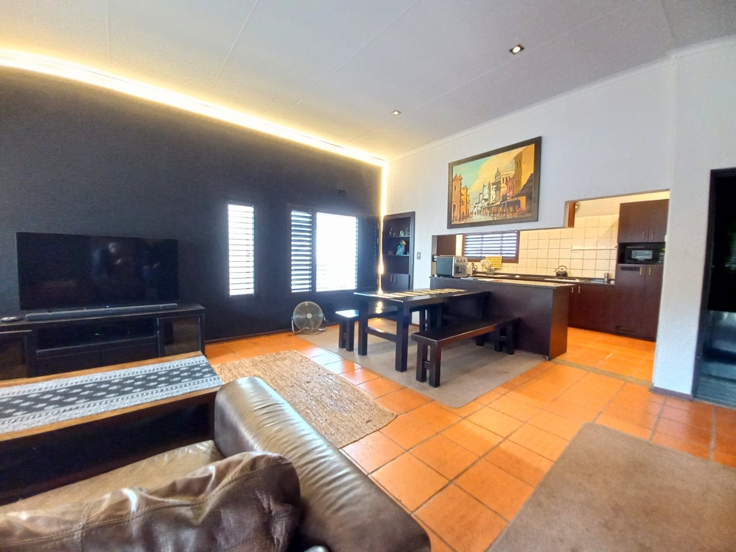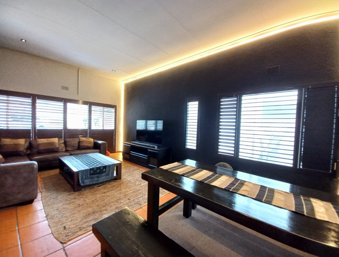 Spacious tiled lounge with blinds and dining area