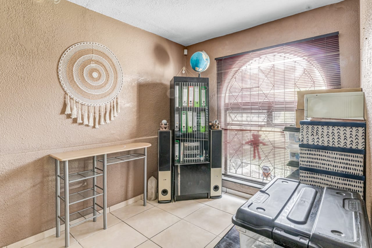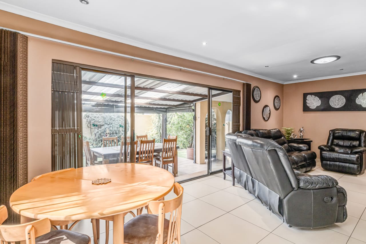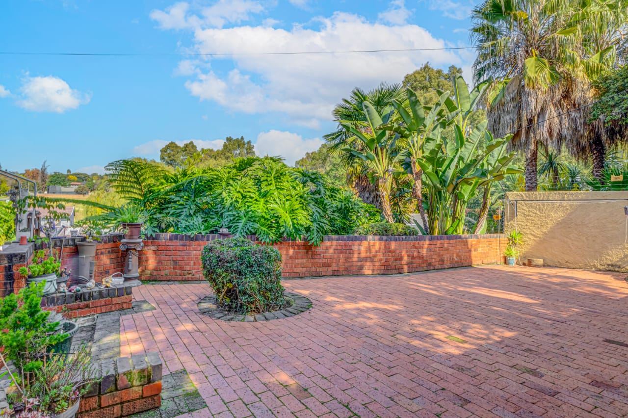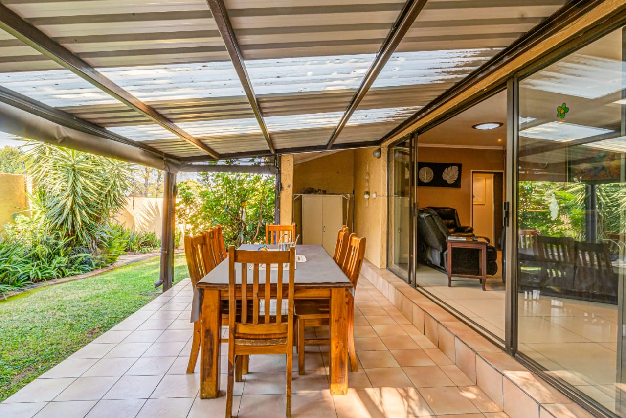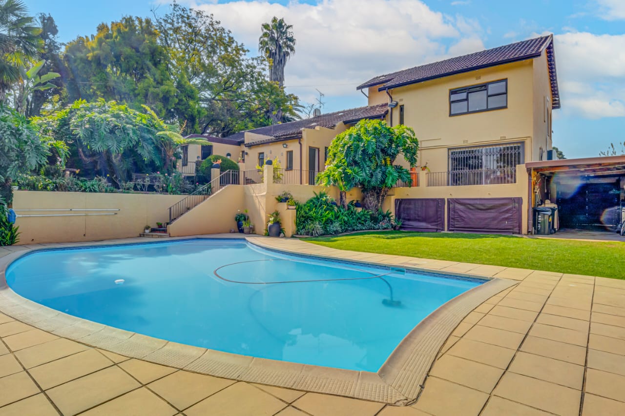 This gem offers you 3 bedrooms, 2 bathrooms (main-en-suite). On entering this unique house you have the first tiled lounge (with a gas fireplace) which is currently used as an office that also boasts a balcony and an extra room which could serve as a study. Moving on up the stairs you have the first bedroom plus a full bathroom. Another few stairs and you have the main bedroom with bathroom en-suite and a third bedroom. This home also boasts a second lounge with an outside private patio. This lounge leads into the kitchen that offers granite tops, breakfast nook and a super sunroom which opens out onto the serene and beautiful garden, pool and an enclosed braai area, an absolute entertainers delight!