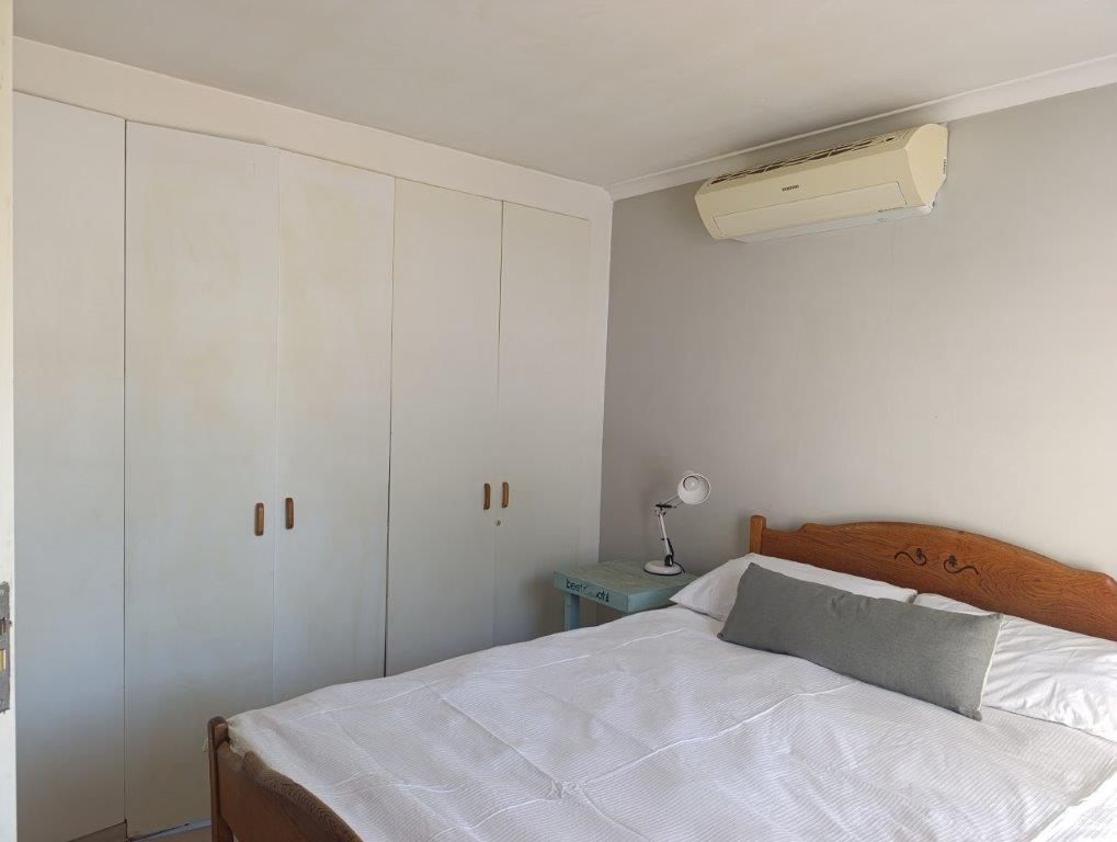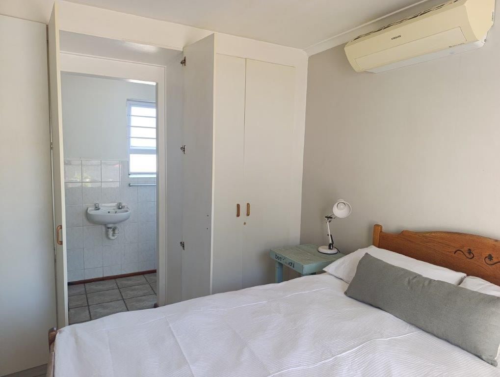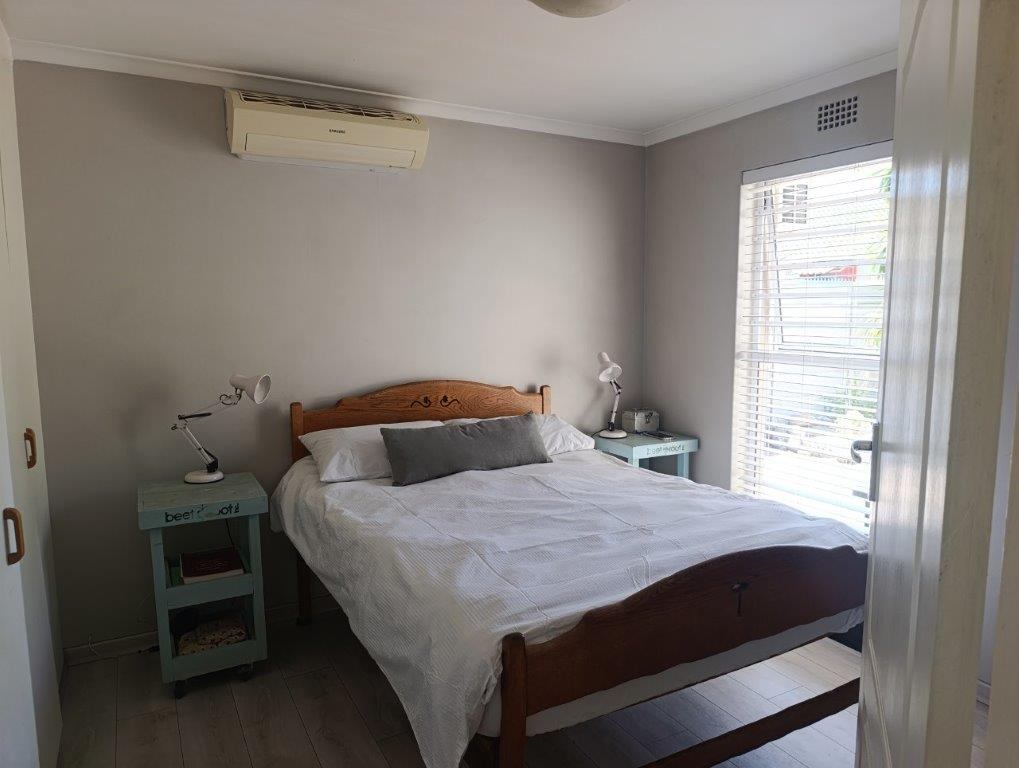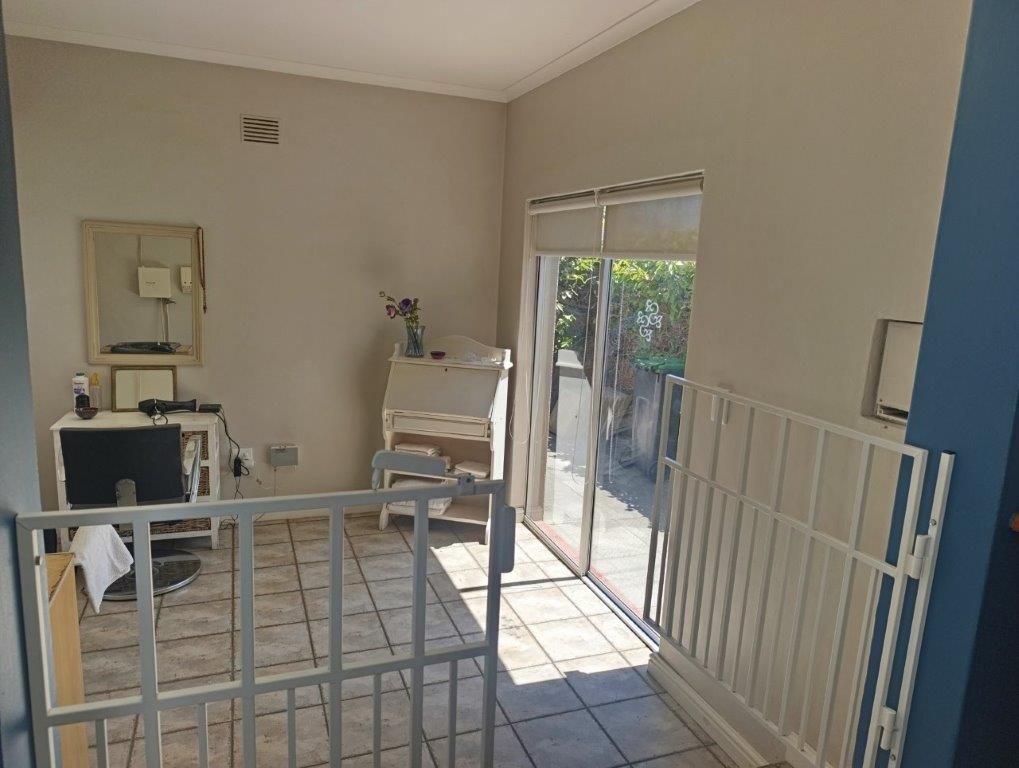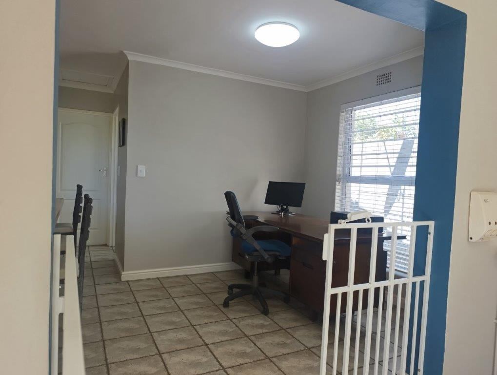 The main bedroom features an en-suite bathroom and air-conditioning for added comfort. A second bedroom, guest bathroom, and a dedicated home office provide flexibility and practical living. All windows have been upgraded to aluminium, and burglar bars offer peace of mind.