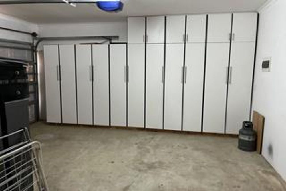 A garage that allows for two cars to park. Space in front of the garage to park cars.