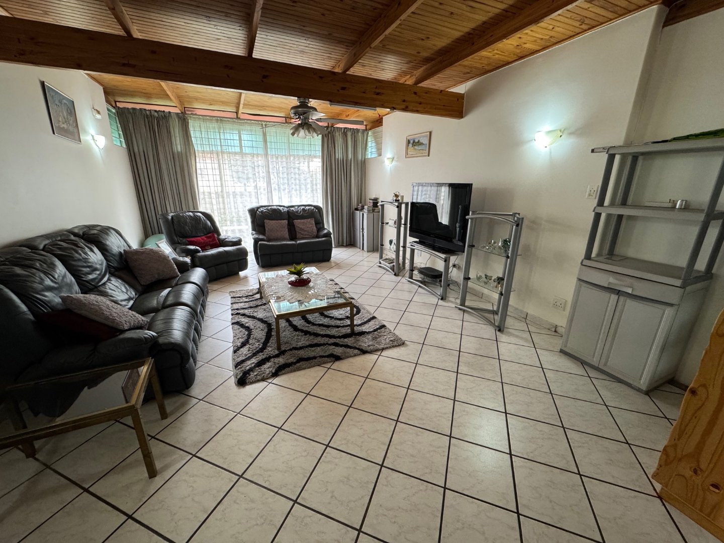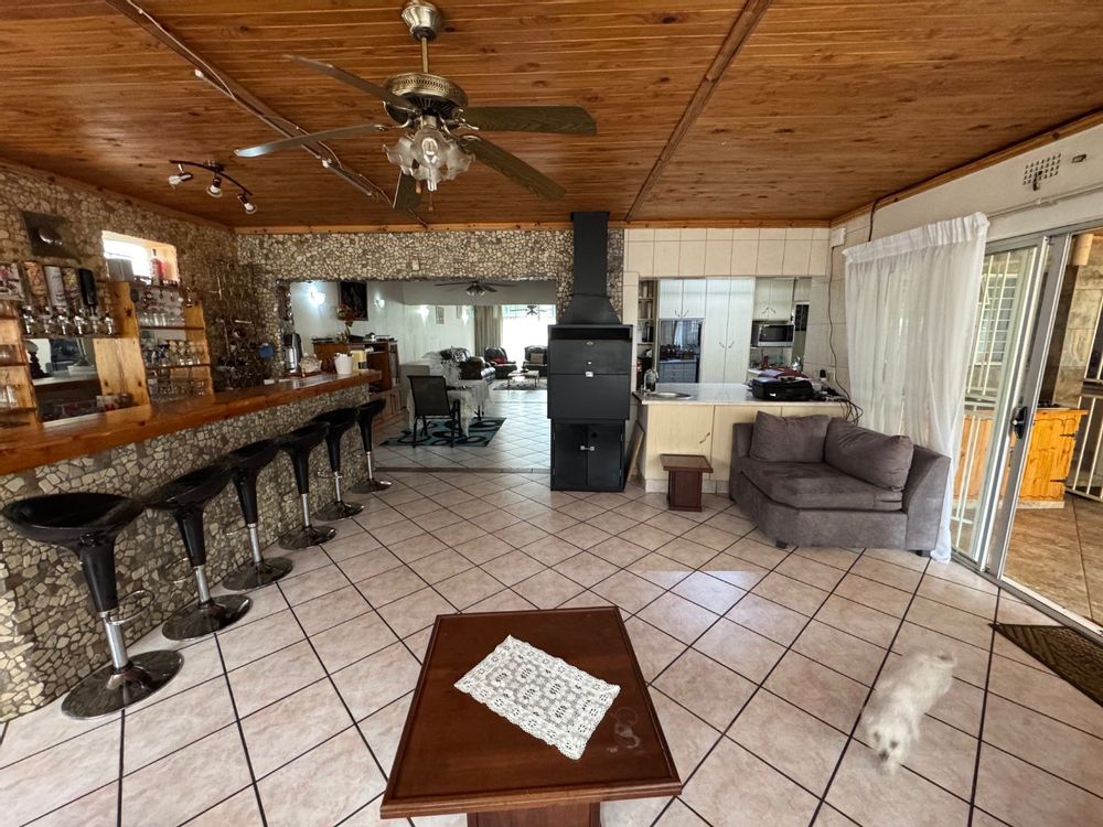 The well-appointed kitchen, complete with a pantry and scullery, ensures effortless meal preparation. With two bathrooms, an en-suite, and a guest loo, convenience is guaranteed. The home also includes two staff quarters, two granny flats, and ample parking with a double garage and four carports. Outdoor living is a delight with a sparkling pool, perfect for entertaining.