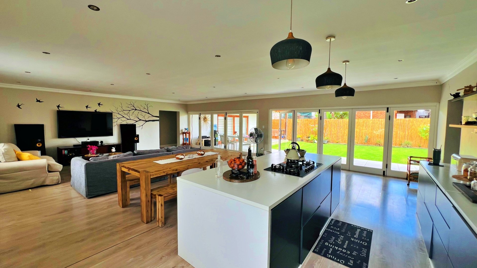 The home offers a bright open-plan layout with clean lines and a sleek, modern aesthetic. The stylish kitchen features a gas stove, quality appliances, and seamless flow into the living and dining areas—perfect for everyday living and entertaining.