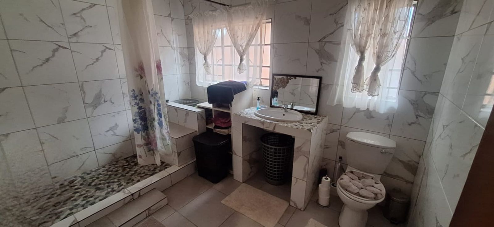 The home features 3 spacious bedrooms with plenty of built-in cupboards. The main bedroom includes an en-suite bathroom, while a second full bathroom with shower, toilet, and basin serves the rest of the home.