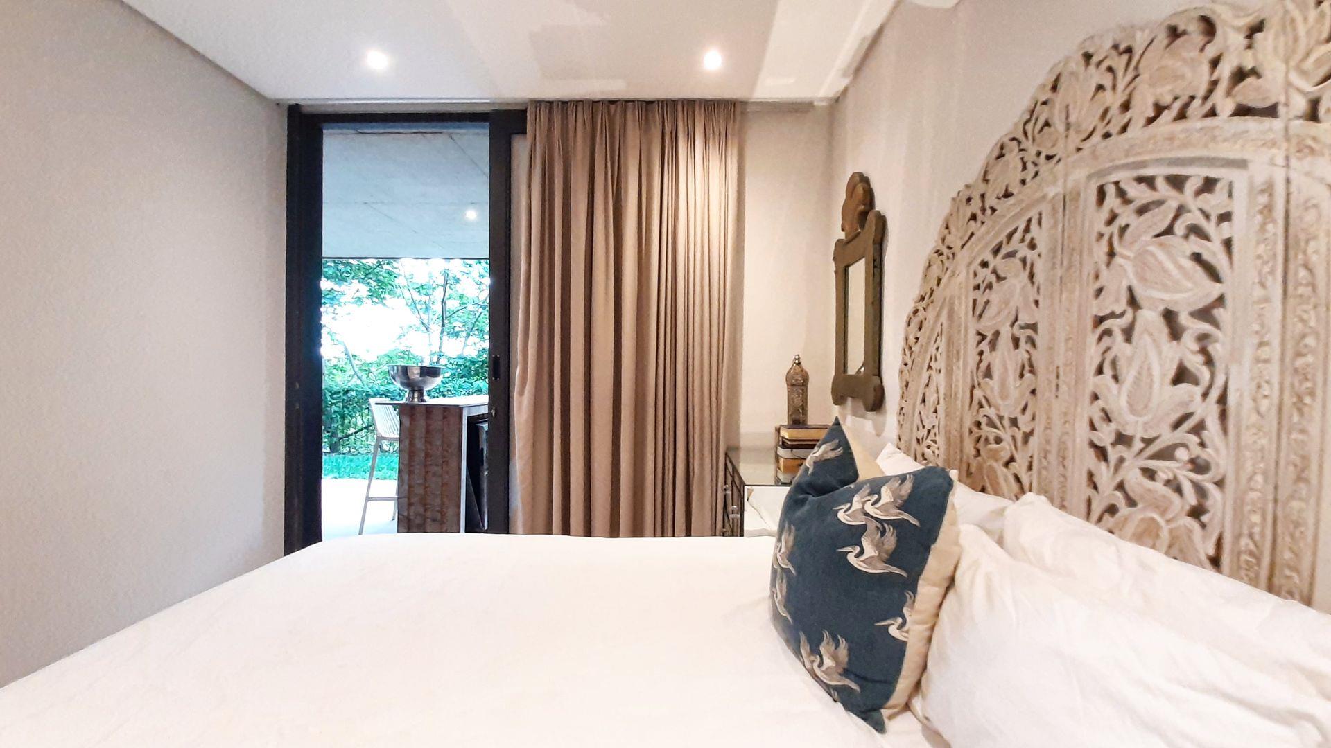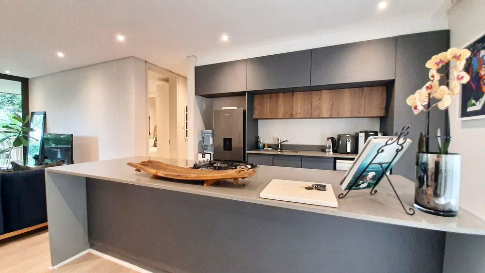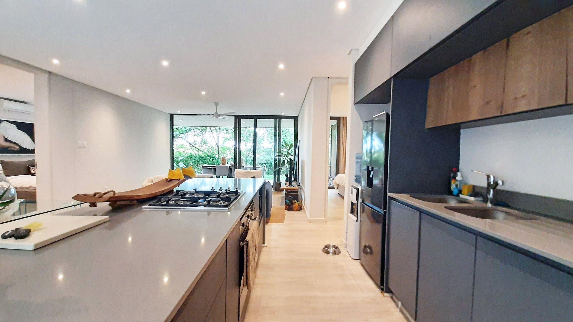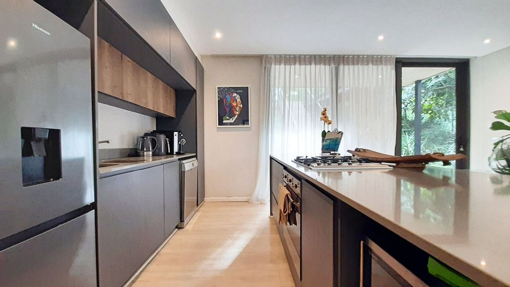 The kitchen is a masterpiece of luxuryImmerse yourself in the captivating embrace of the Elaleni Coastal Forest Estate. This sophisticated two-bedroom apartment blends modern elegance with a nature-centric lifestyle. As you step through the door, you'll be greeted by a thoughtfully designed layout where the kitchen, dining area, and lounge flow effortlessly, leading to a covered patio and expansive enclosed garden. Sunlight floods the space through floor-to-ceiling glass doors, creating a warm and inviting atmosphere.