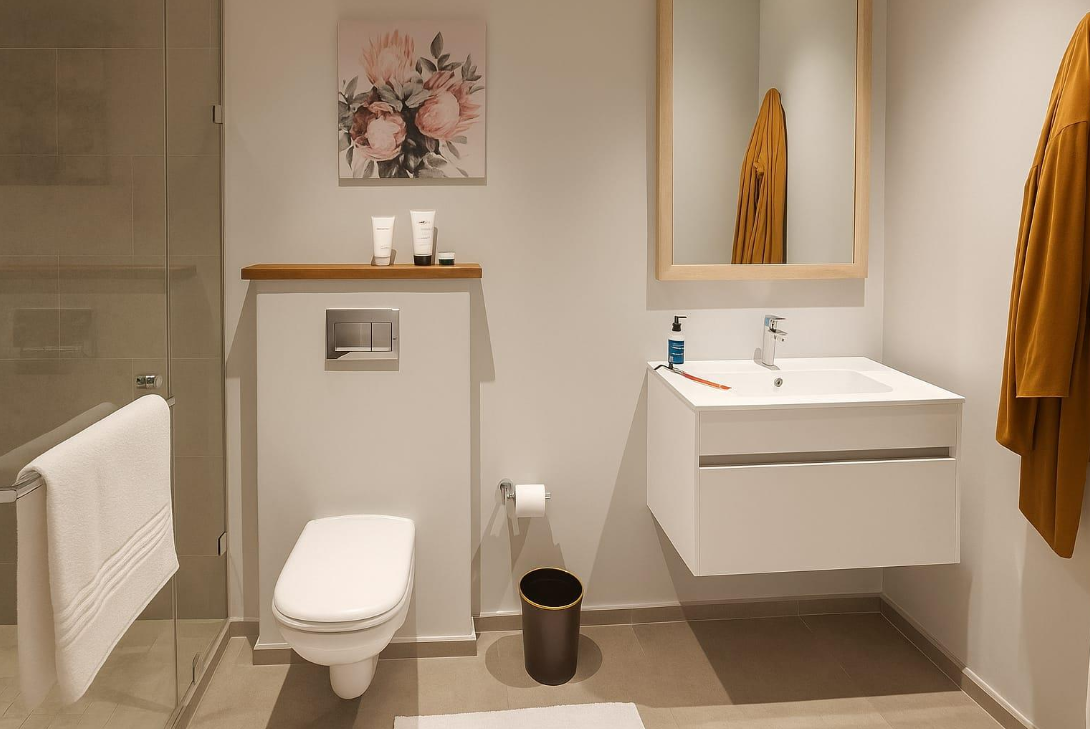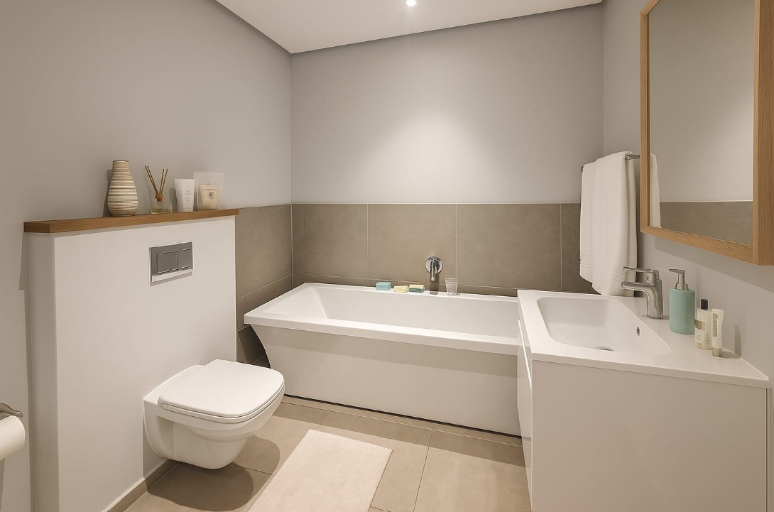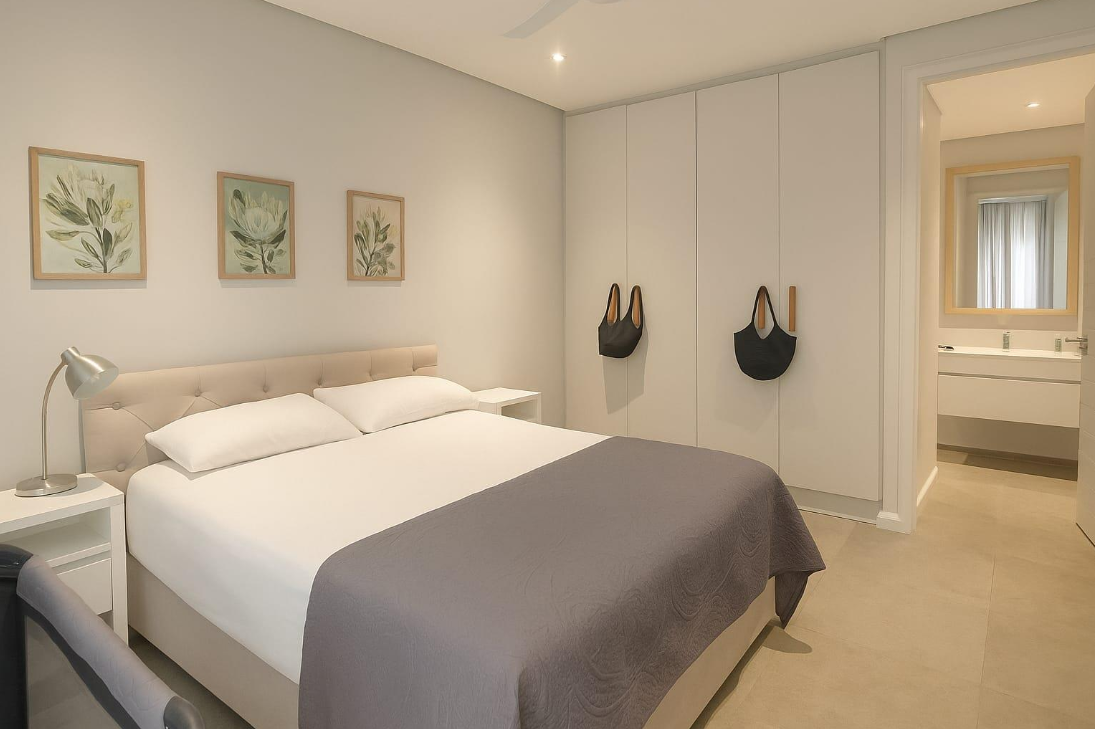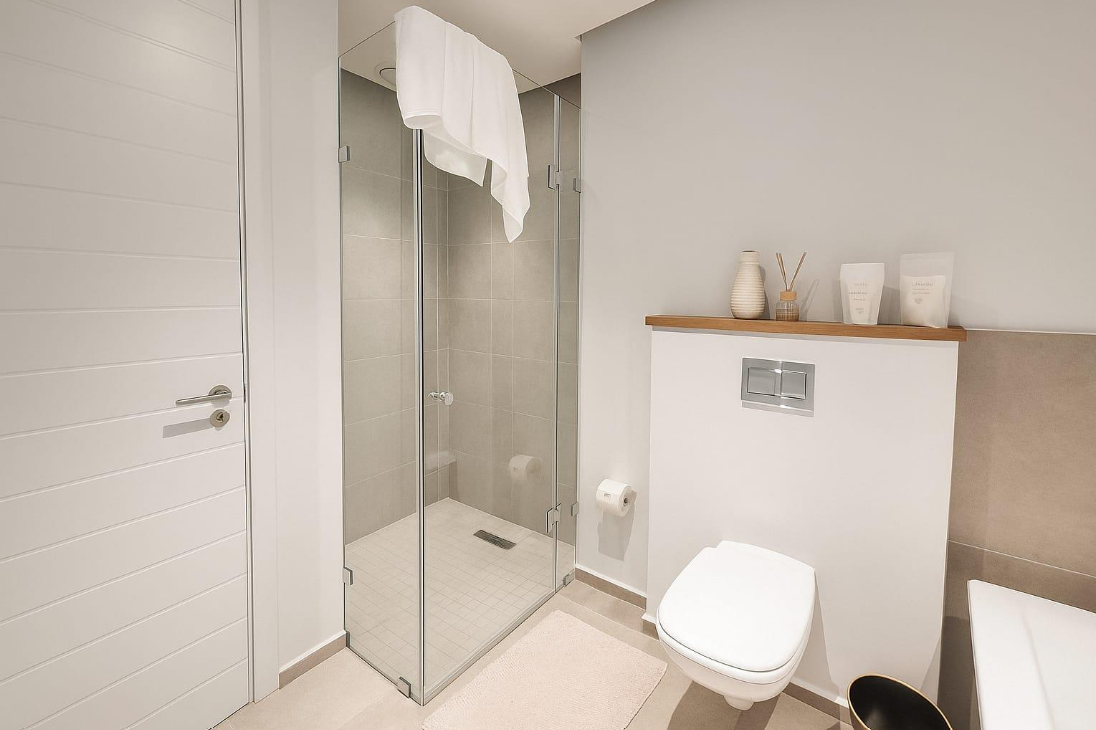 Both bedrooms are comfortably proportioned and designed as peaceful retreats. The main bedroom benefits from soft natural light and a private en suite bathroom, while the second bedroom is versatile enough to accommodate guests, a home office, or a small family. The additional bathroom is fitted with contemporary finishes and includes both a bath and a walk-in shower for practical convenience.