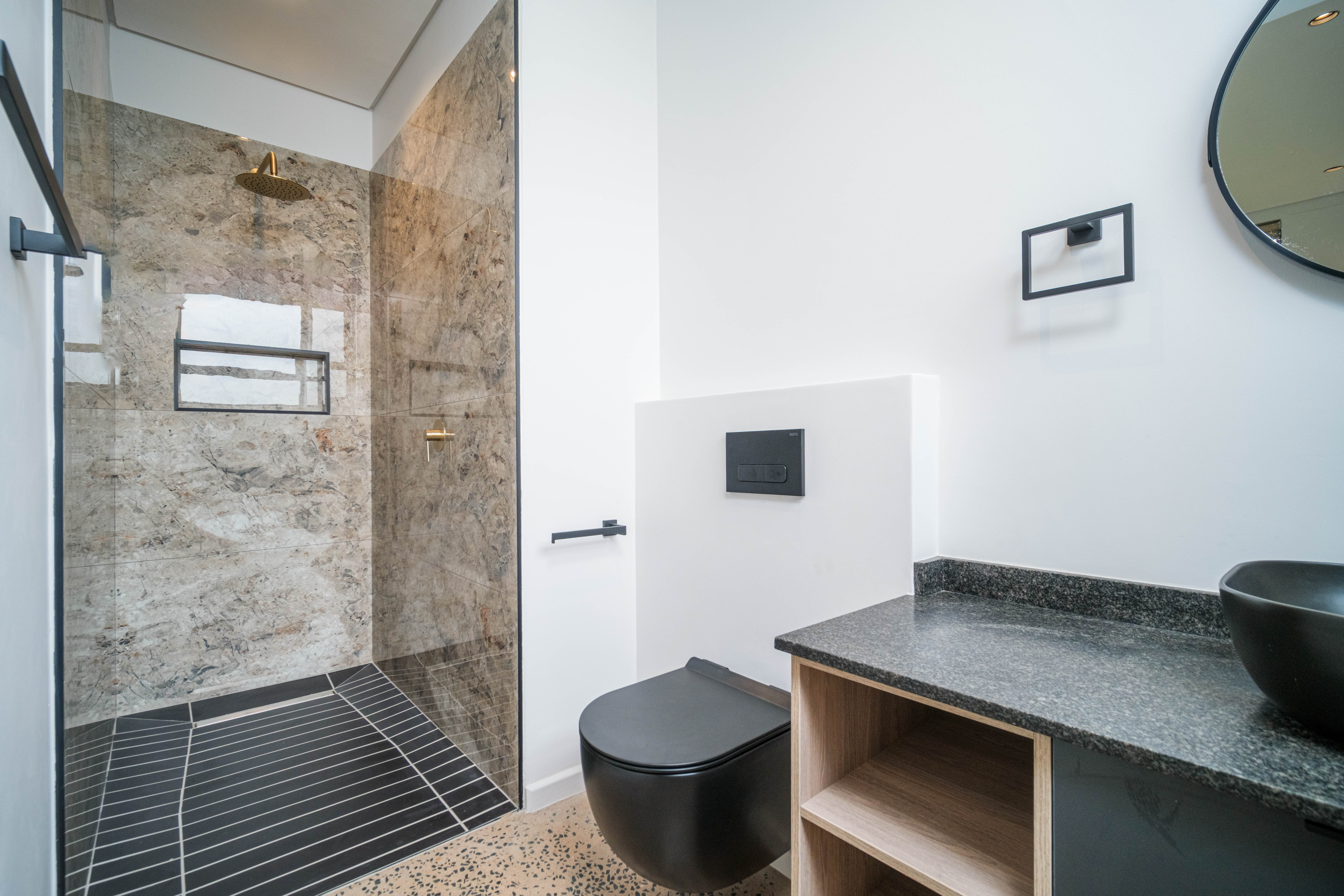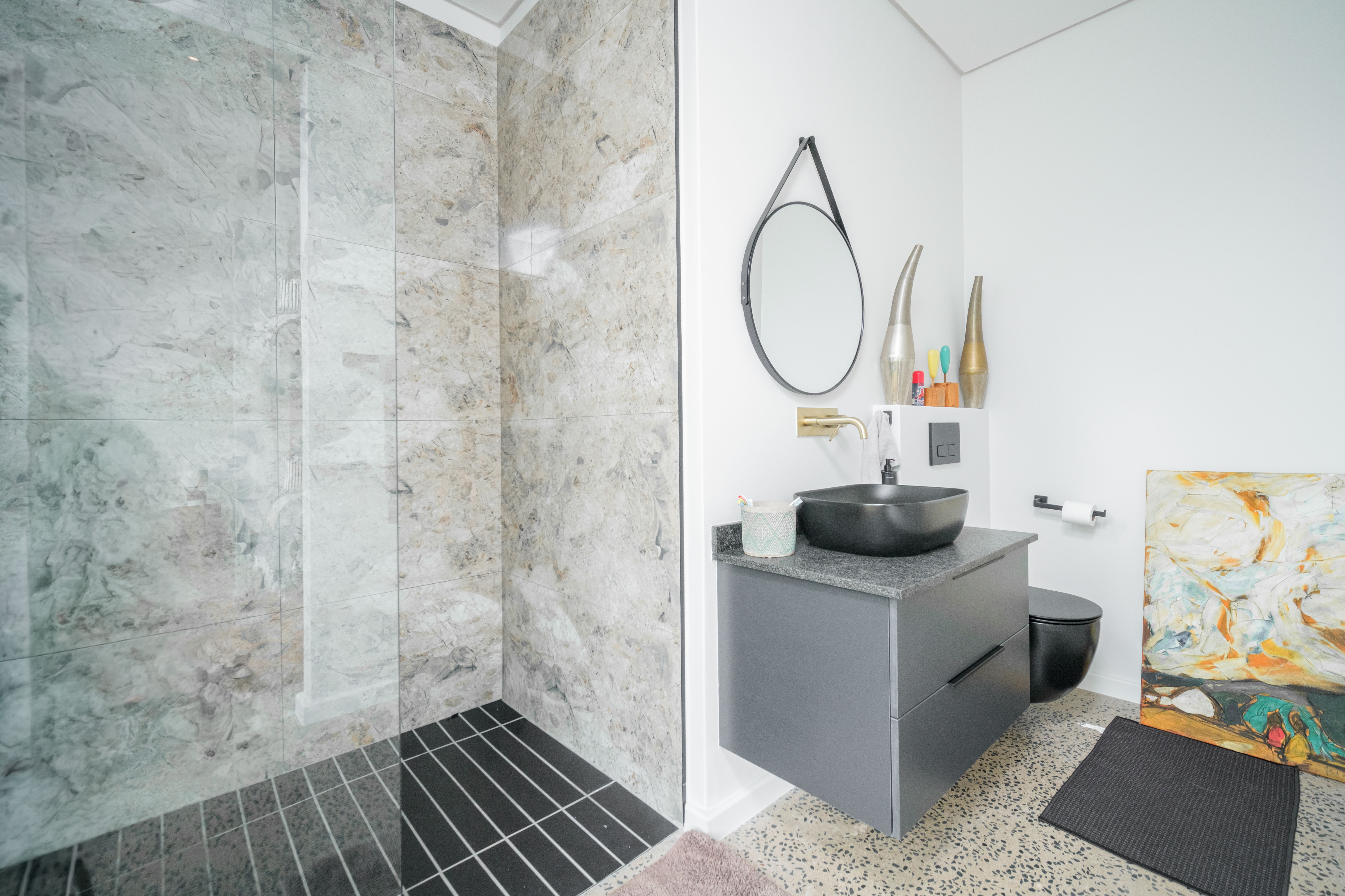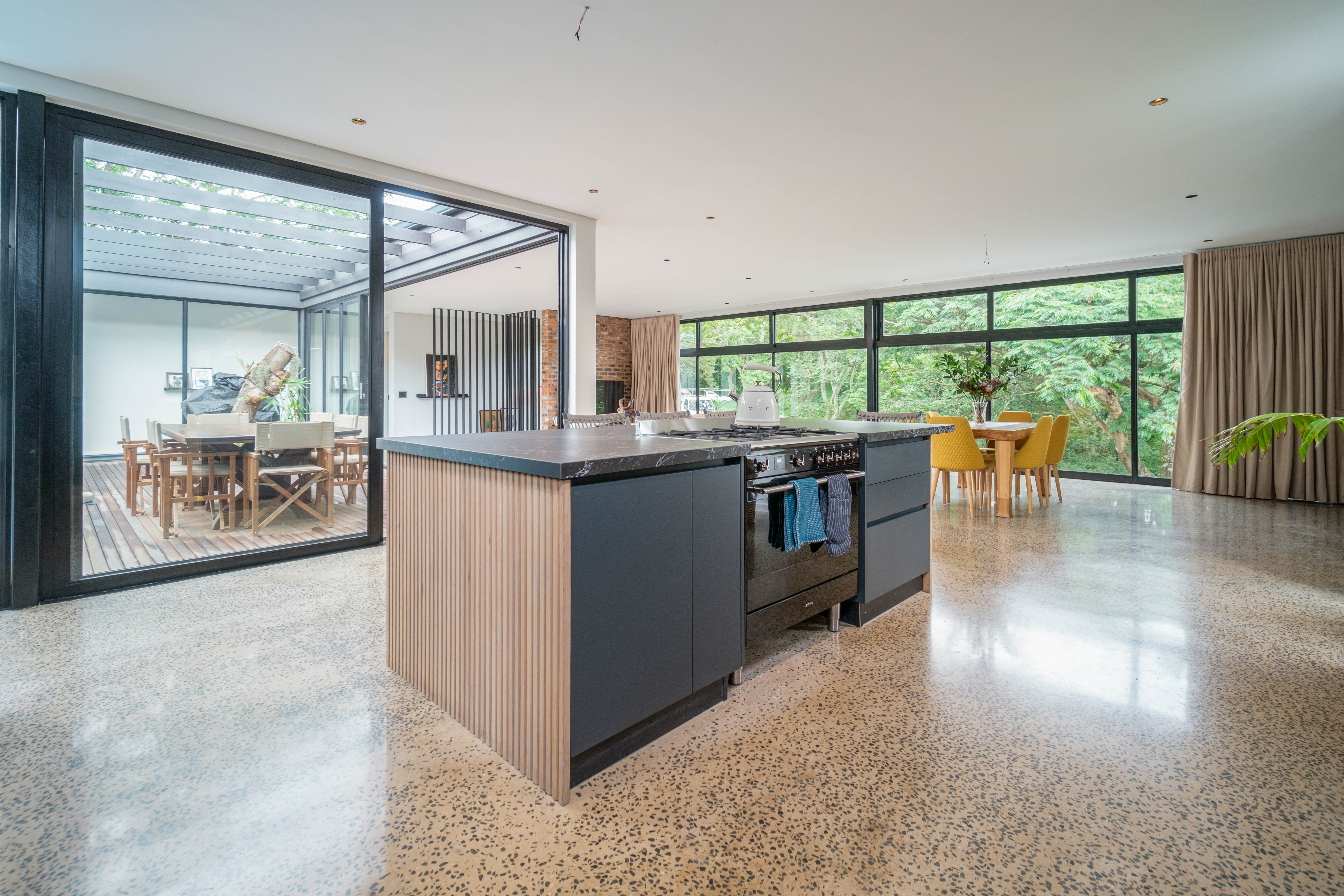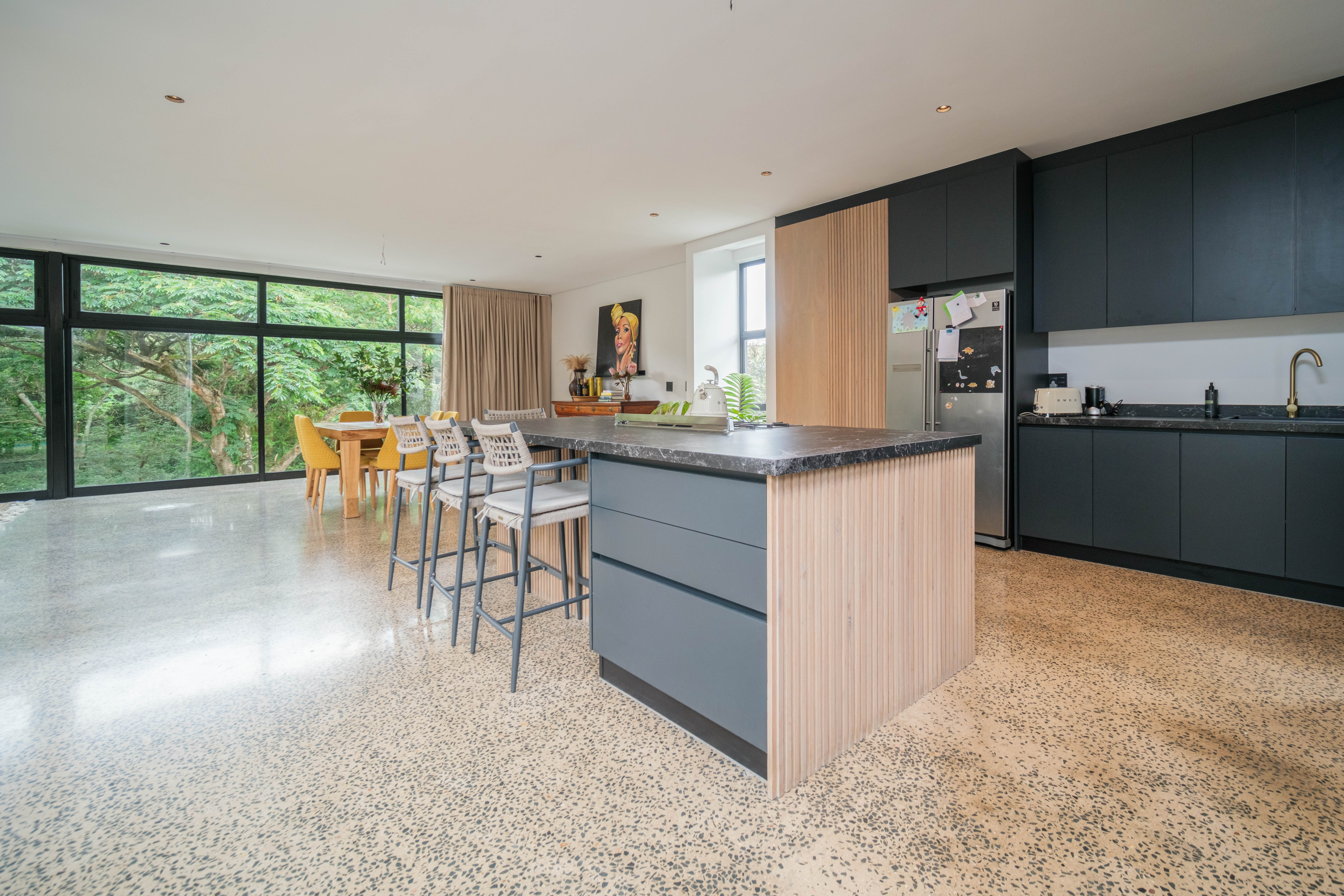 The home’s design is both striking and functional, with a double-story section positioned above the spacious double garage, while the opposite wing remains level with the ground, enhancing accessibility and balance. At the heart of the home lies a stylish open-plan kitchen and dining area, finished with stunning marble countertops that create a sense of refined sophistication. The modern kitchen is ideal for entertaining or enjoying quiet family moments, connecting effortlessly to the living spaces and outdoor areas.