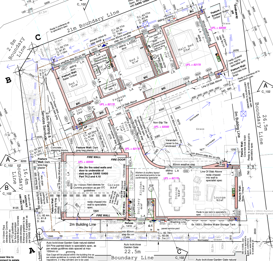 The property has been designed with sustainability at its core, incorporating a gas geyser, rainwater harvesting provisions and solar-ready infrastructure. Durable construction details — such as concrete slab roofing, aluminium doors and windows, enclosed eaves, and a dedicated service yard — ensure low maintenance and long-term resilience. A spacious 36m2 double garage adds secure parking and extra storage capacity.