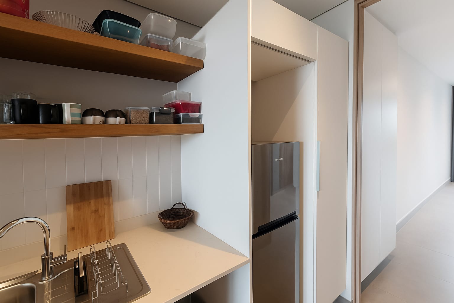 The living and sleeping area blend seamlessly, creating a harmonious space that feels open yet intimate. The modern kitchenette is compact yet functional, designed with sleek cabinetry, quality fittings, and space for essential appliances, perfect for those who appreciate smart, efficient living.