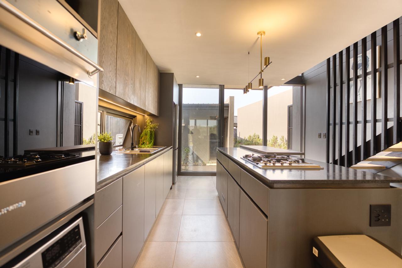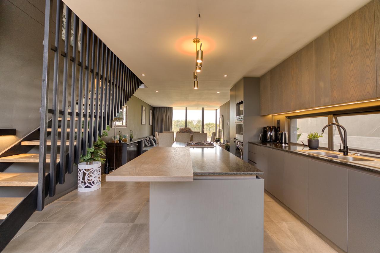 The modern kitchen is equipped with high-quality appliances and generous storage, combining style and functionality for everyday living.