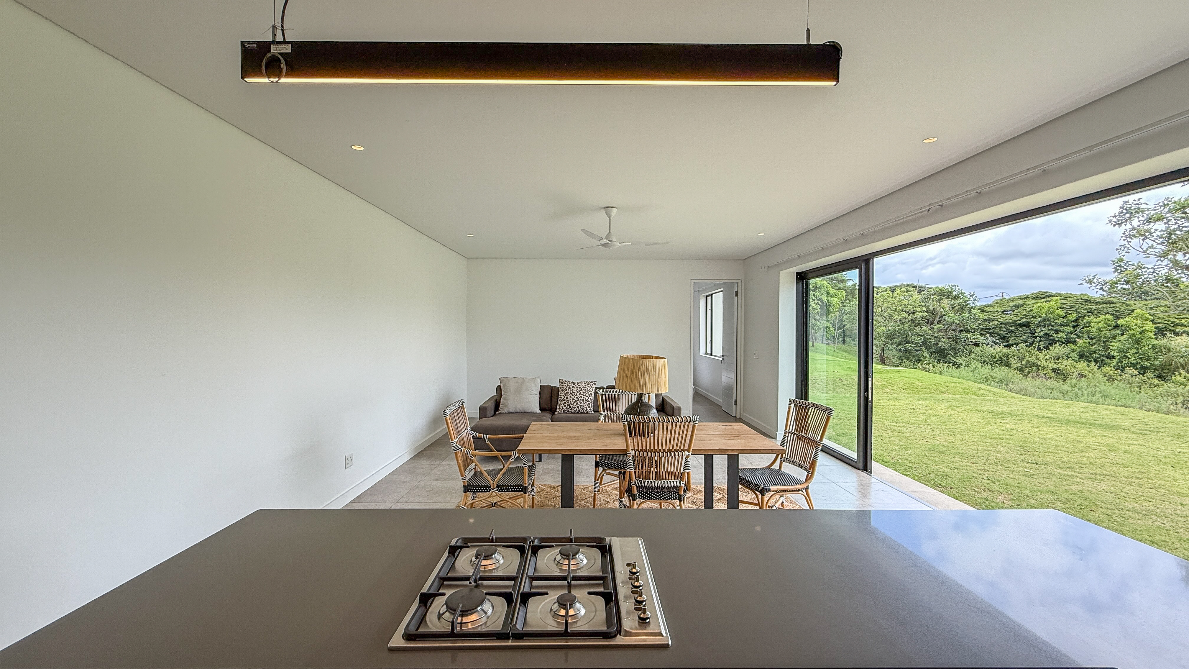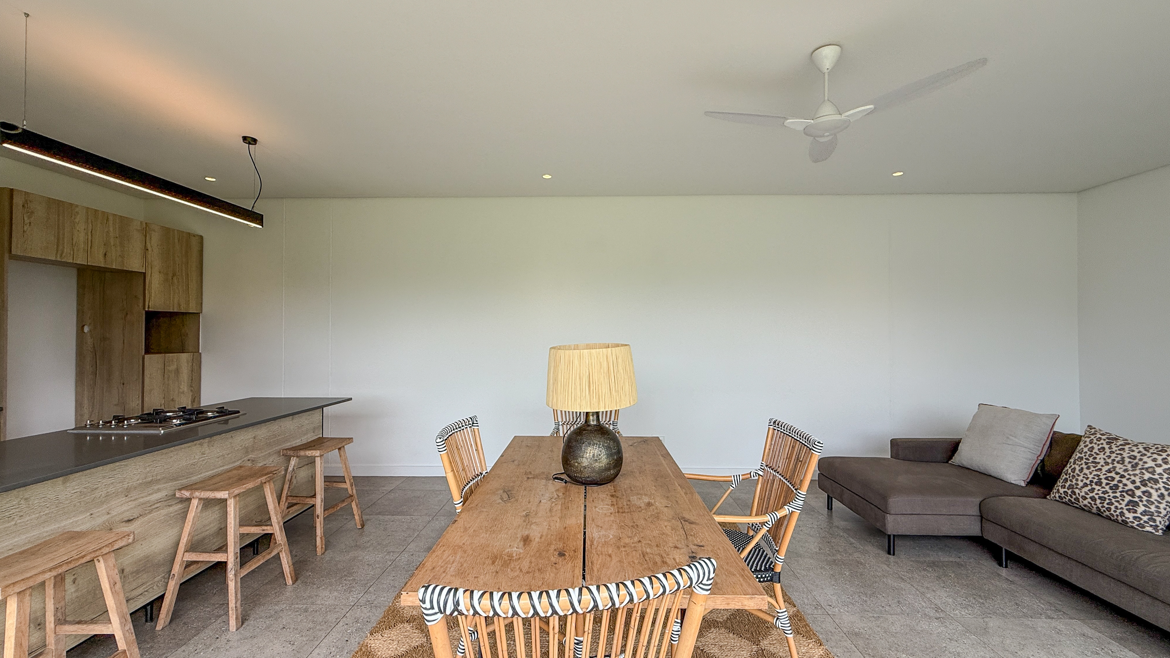 The open-plan layout connects the kitchen, dining area and lounge into a bright, seamless living space. The kitchen includes a gas hob, ideal for those who enjoy cooking. Sliding doors extend the living area onto a private patio and garden, creating a peaceful outdoor space perfect for relaxation or entertaining.
