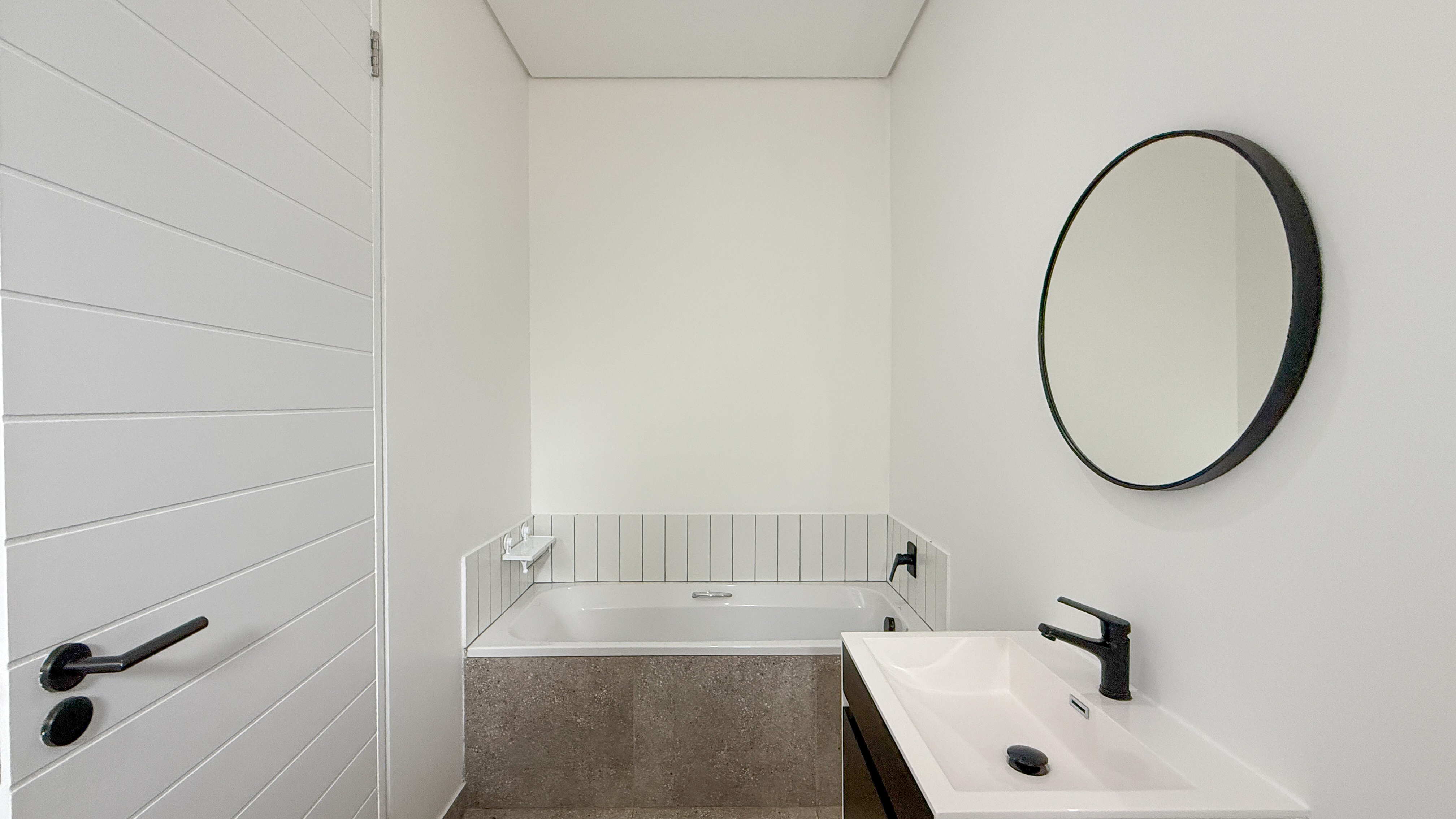 The townhouse features three well-proportioned bedrooms, with the main bedroom enjoying its own en-suite bathroom. The home includes two full bathrooms in total, with the main en-suite offering both a bathtub and shower, while the second bathroom features an oversized shower.