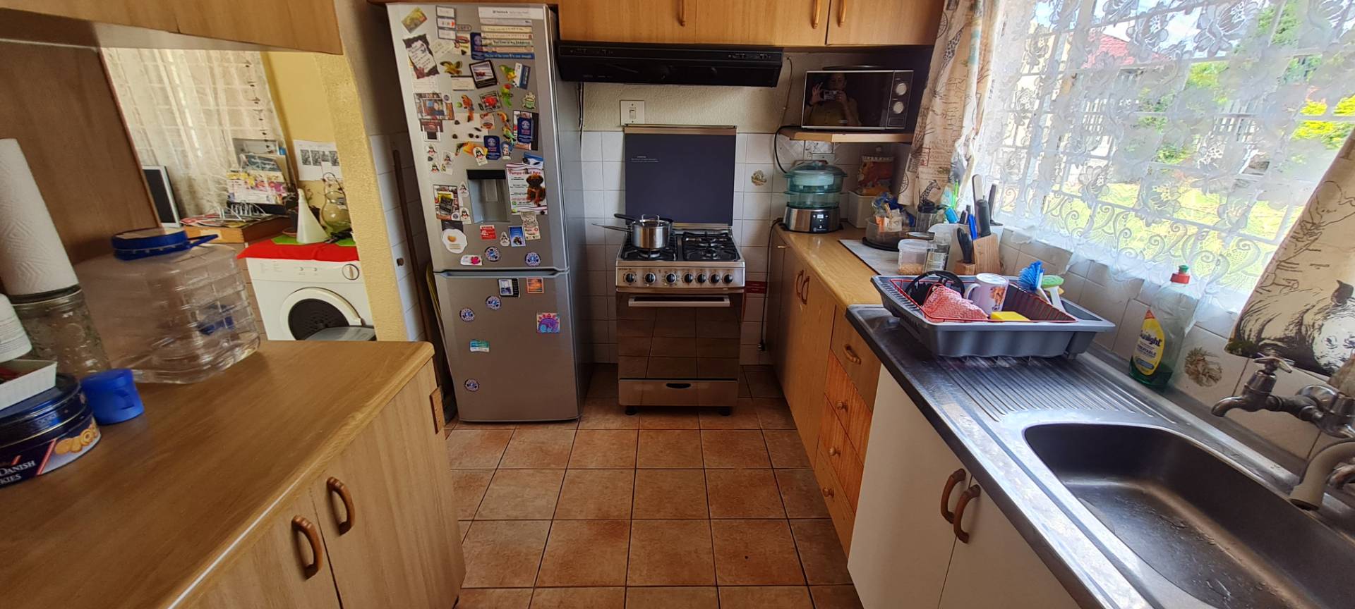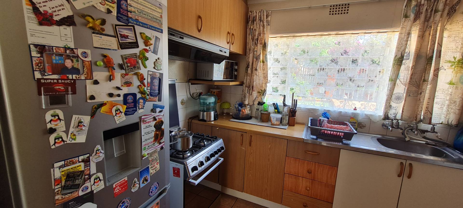 Reasonably sized kitchen with a gas stove, convenient during power outages.