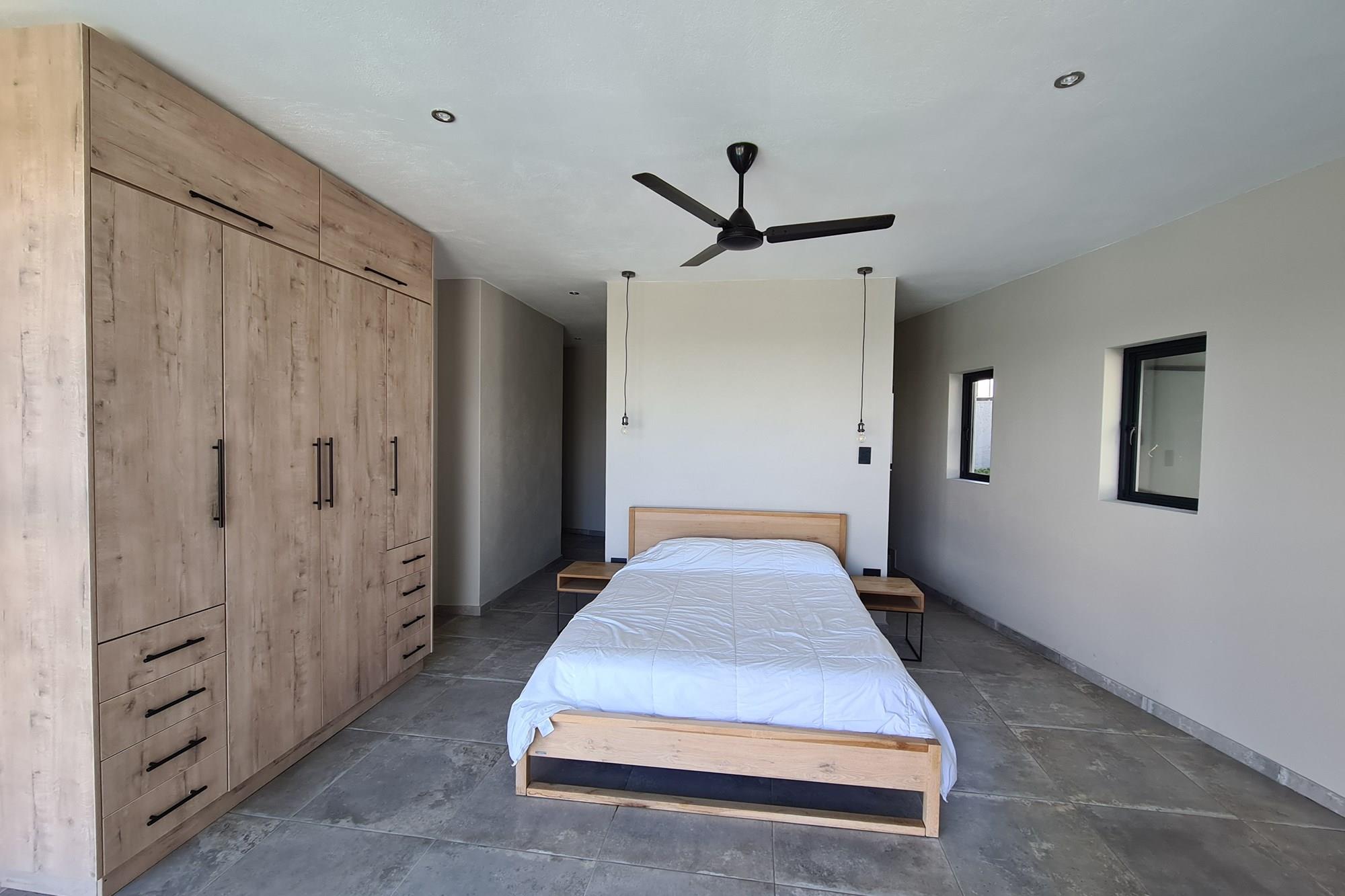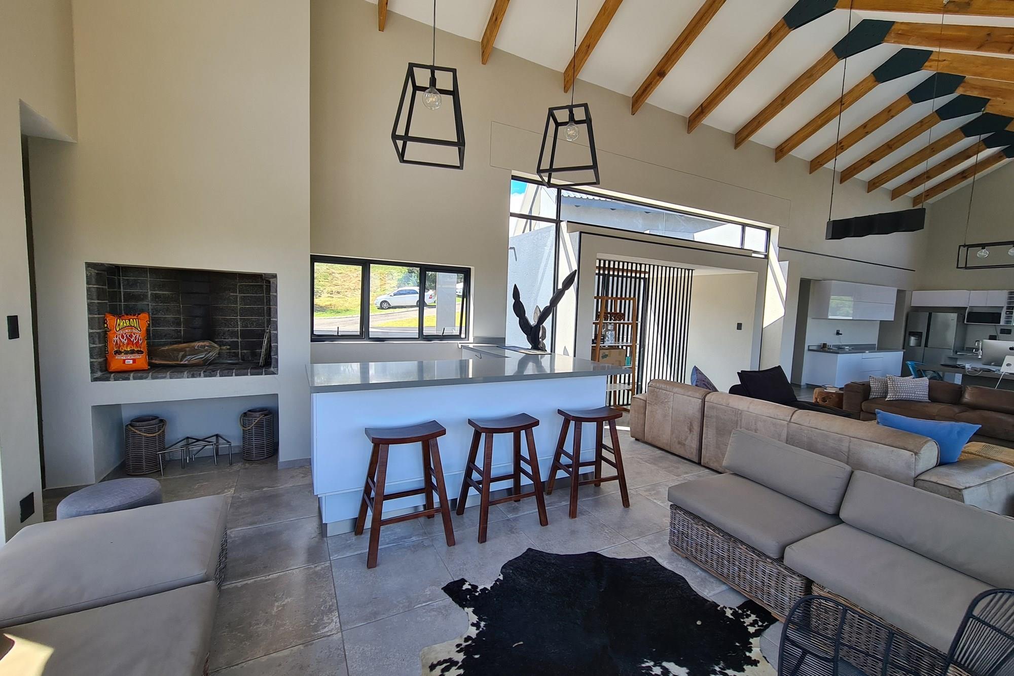With meticulous attention to detail, the house features an open-plan kitchen and living area, complete with a built-in bar and braai.