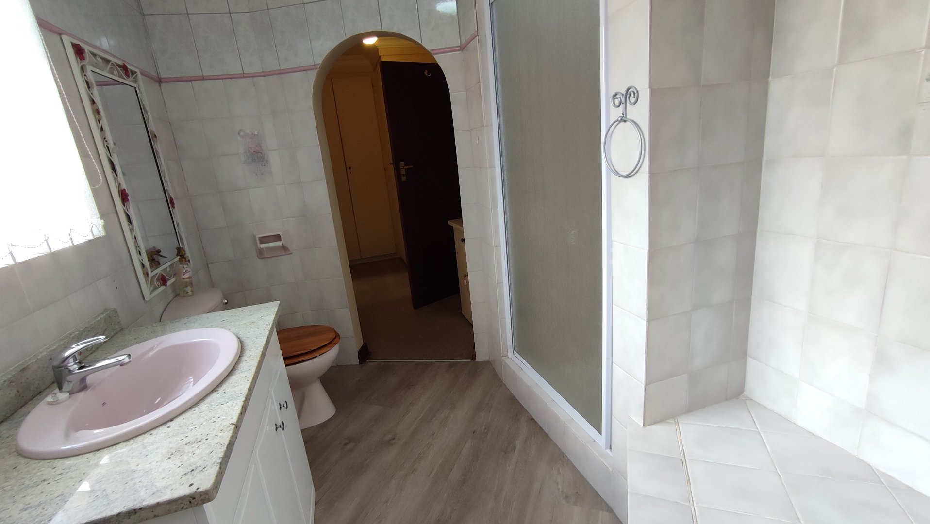 The sleeping wing comprises three generously sized bedrooms with built-in cupboards, a guest toilet, and two bathrooms, with the master bedroom featuring an en-suite bathroom with both bath and shower. A fourth bedroom, located on the first floor, offers versatility as an office or separate lounge and opens onto a balcony.
