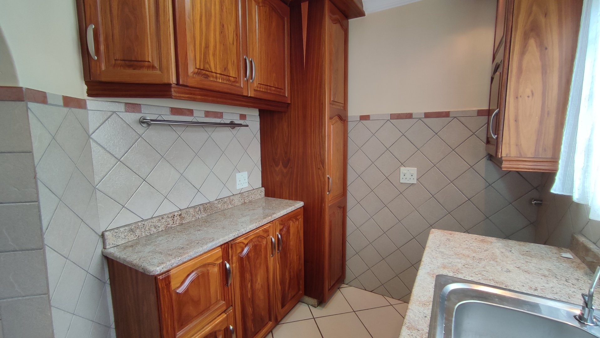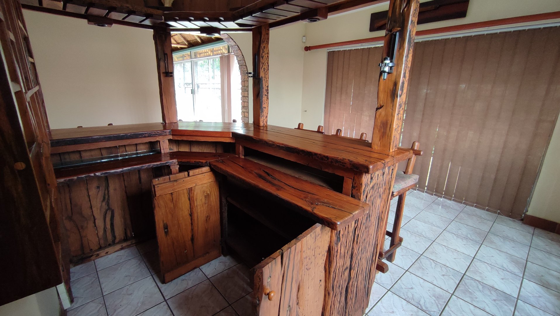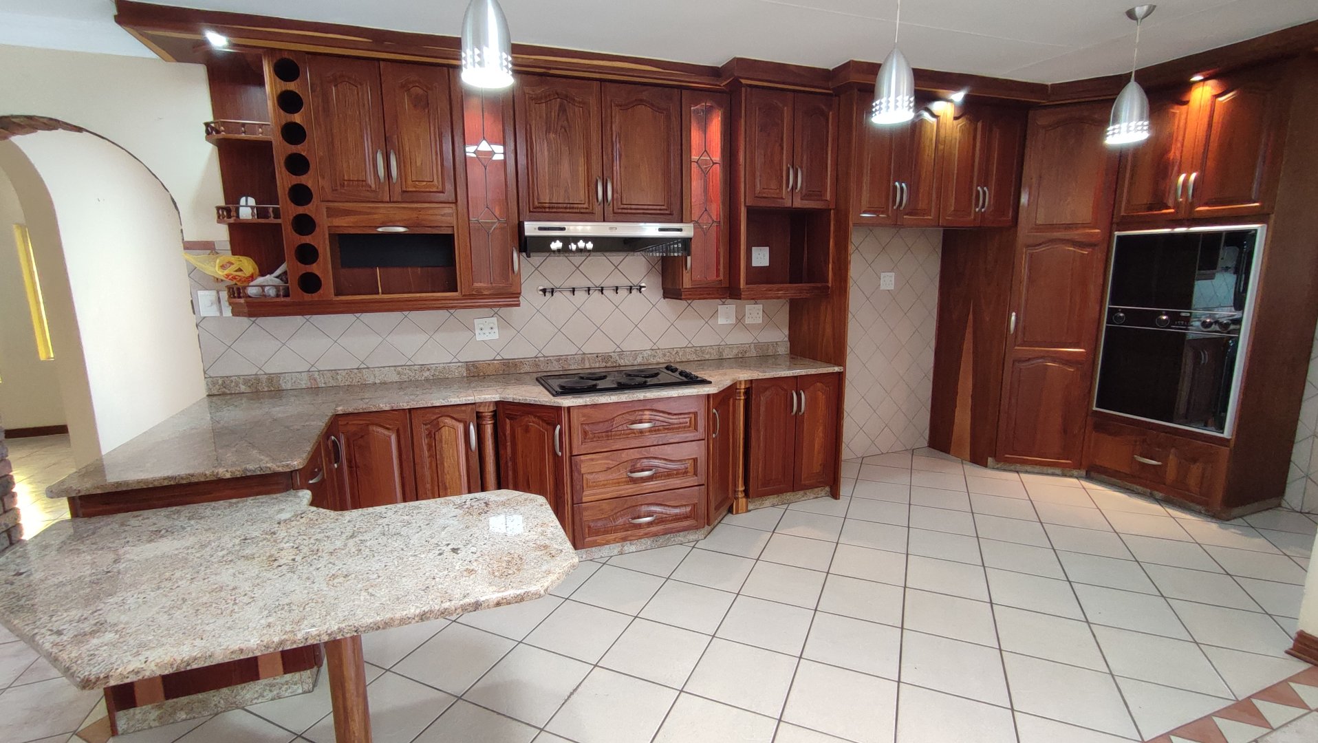 The kitchen is a highlight, boasting teak wood cabinets, granite countertops, an electric hob and eye-level oven, water filtration system, scullery, and a spacious pantry. The home is equipped with a 10kw solar power system, solar geyser, fresh water storage tanks, and a garden sprinkler system – demonstrating a commitment to sustainability.