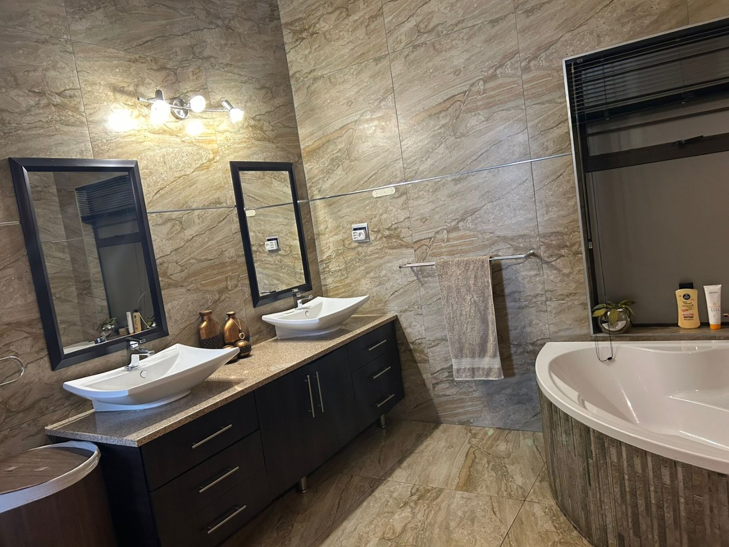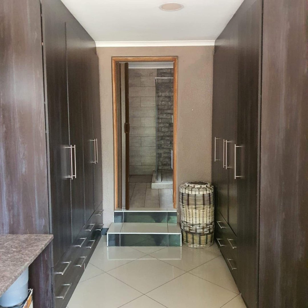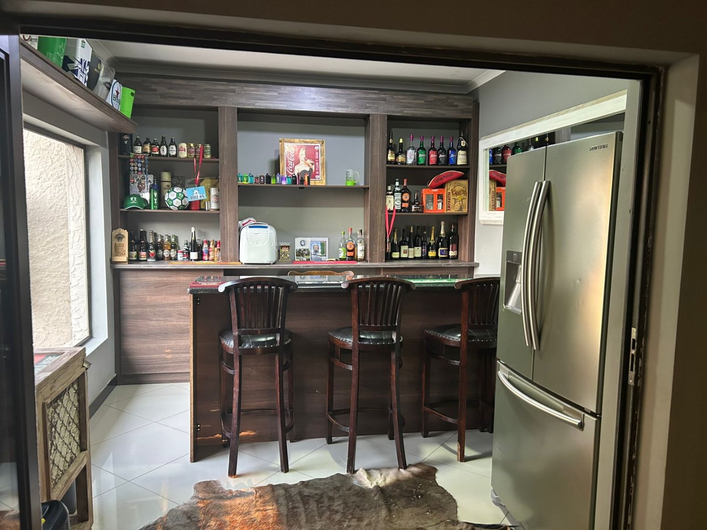 The modern open-plan kitchen is a dream for passionate chefs — boasting ample cabinetry, gas hob and stove, extractor fan, and space for a double-door fridge. A breakfast nook flows to your left into a large dining room perfect for 8- to 12-seater hosting. The spacious lounge seamlessly opens to a covered patio, ideal for entertaining or relaxing while overlooking the manicured garden and sparkling pool. A cosy private pub area adds to the charm — perfect for weekend gatherings or quiet evenings.