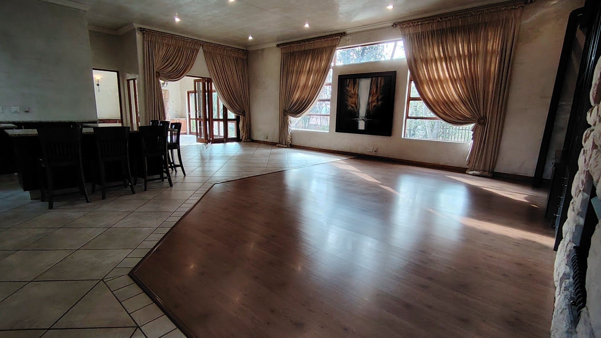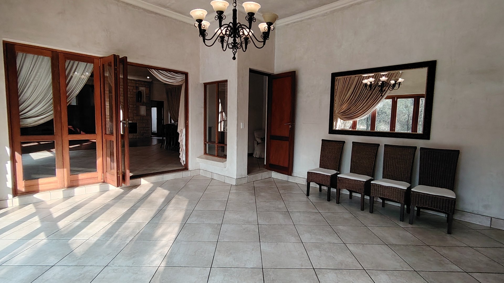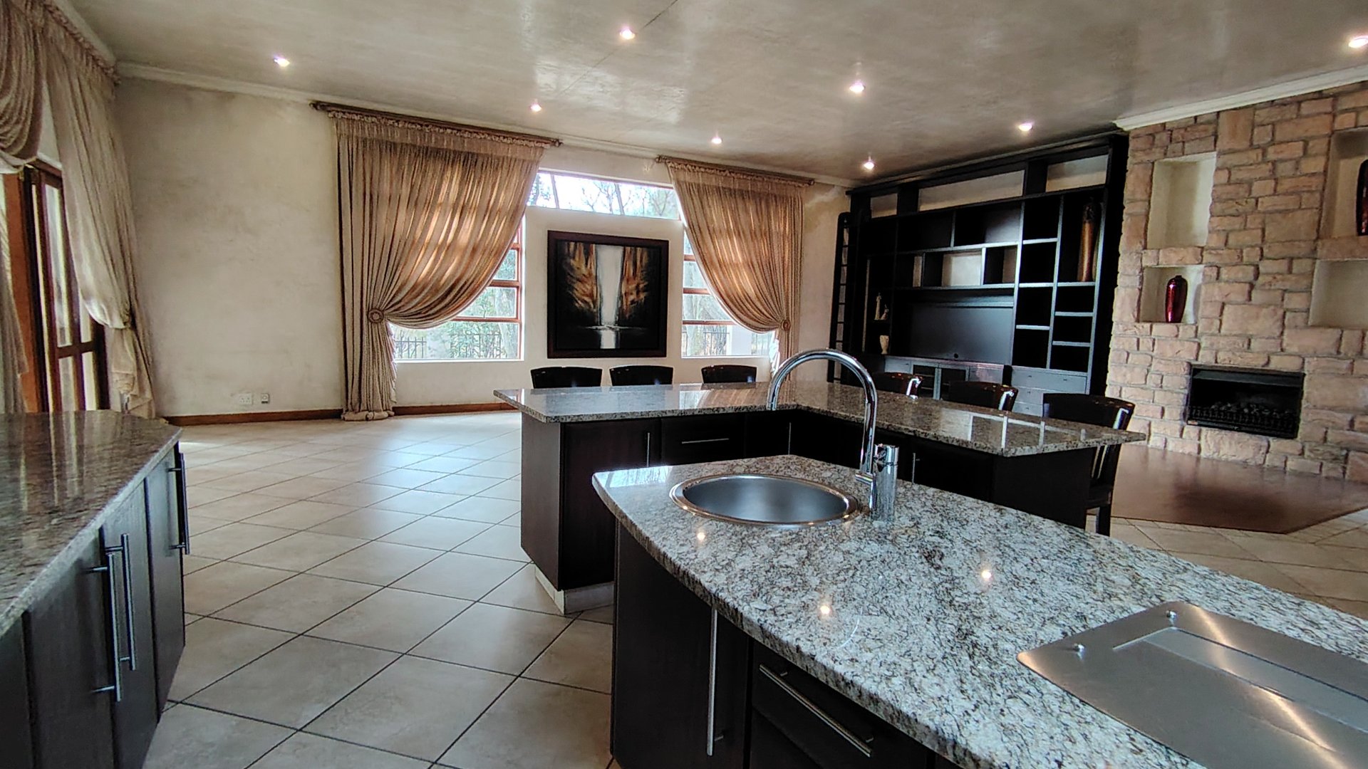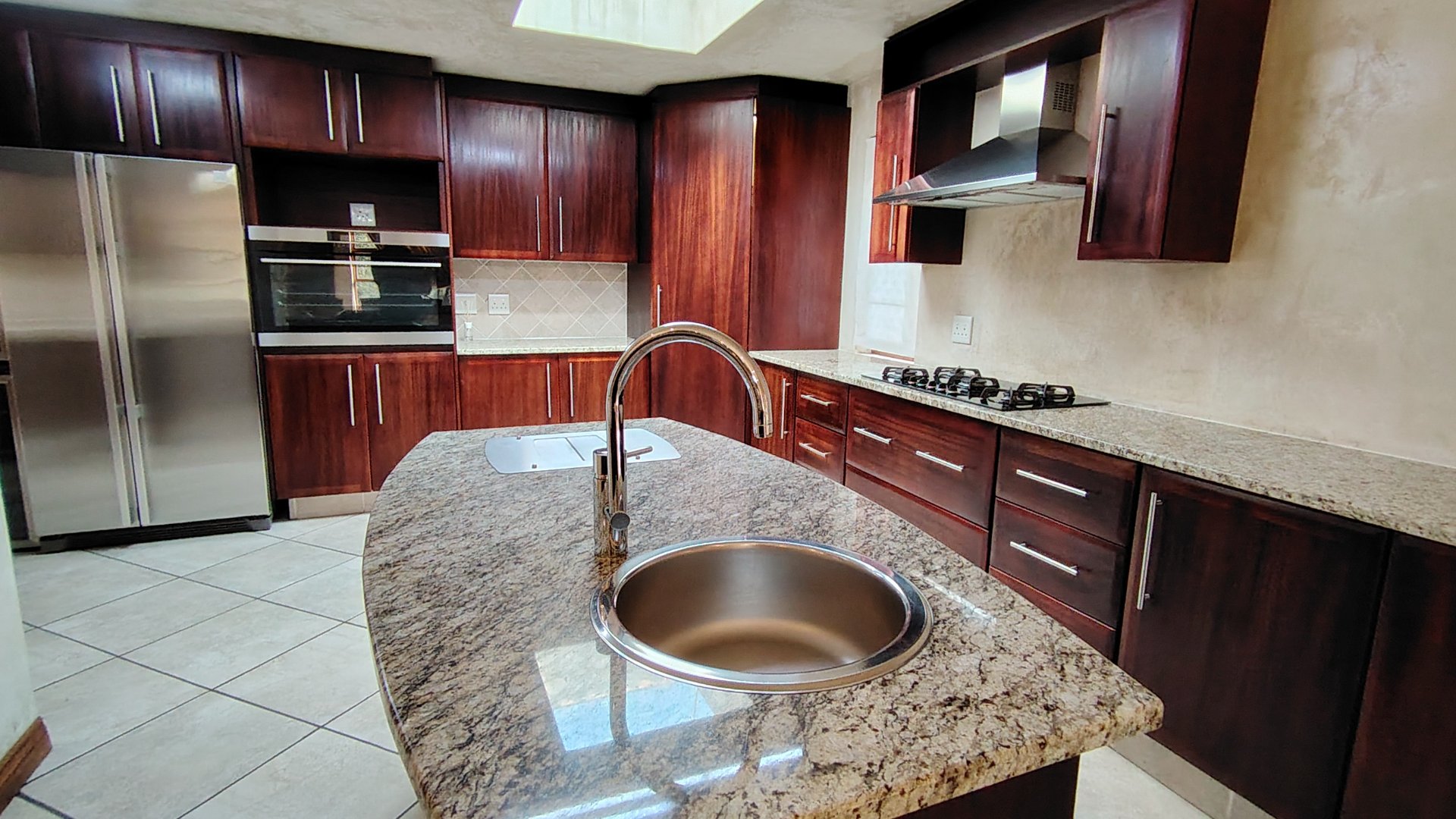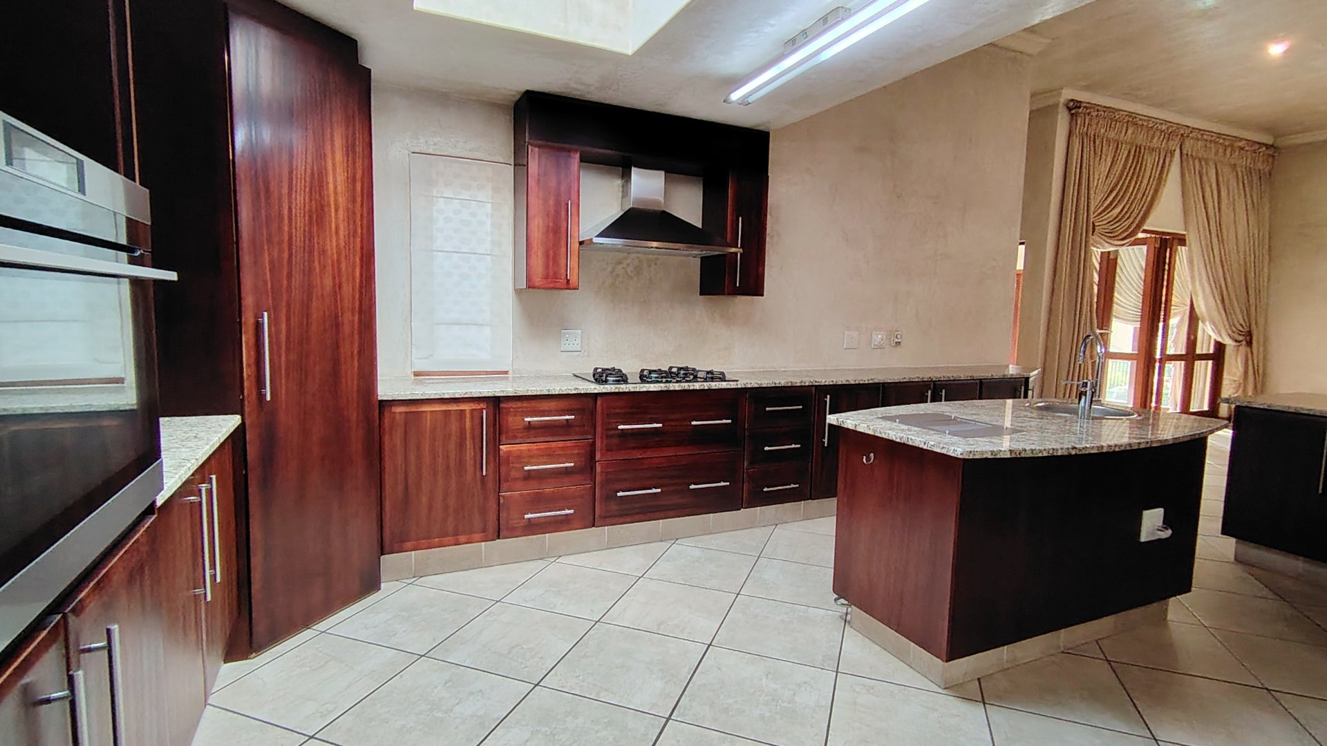 The custom mahogany and granite kitchen is a chef’s dream, featuring a gas hob, breakfast island, prep bowl, and an expansive scullery with space for all appliances. A pantry adds practicality, while the open-plan design ensures the cook remains part of the conversation.
