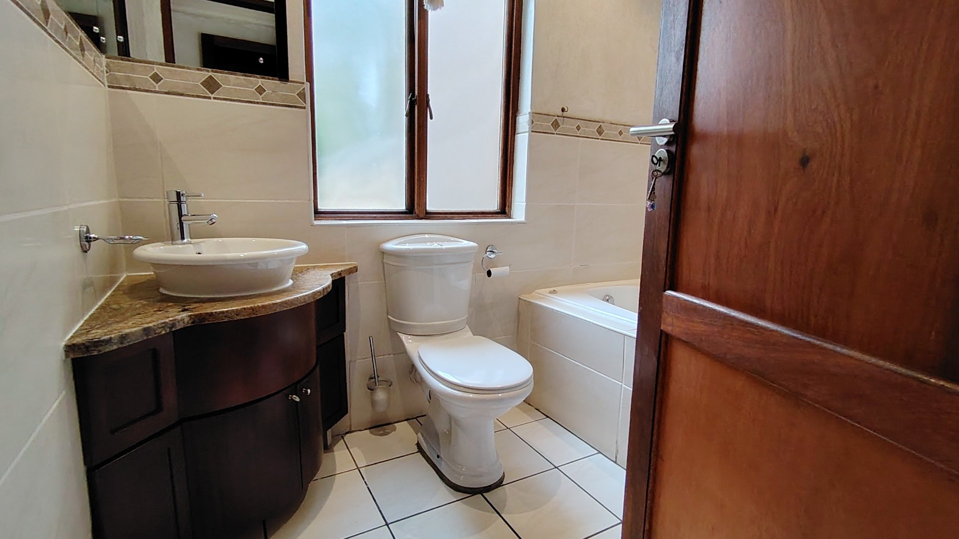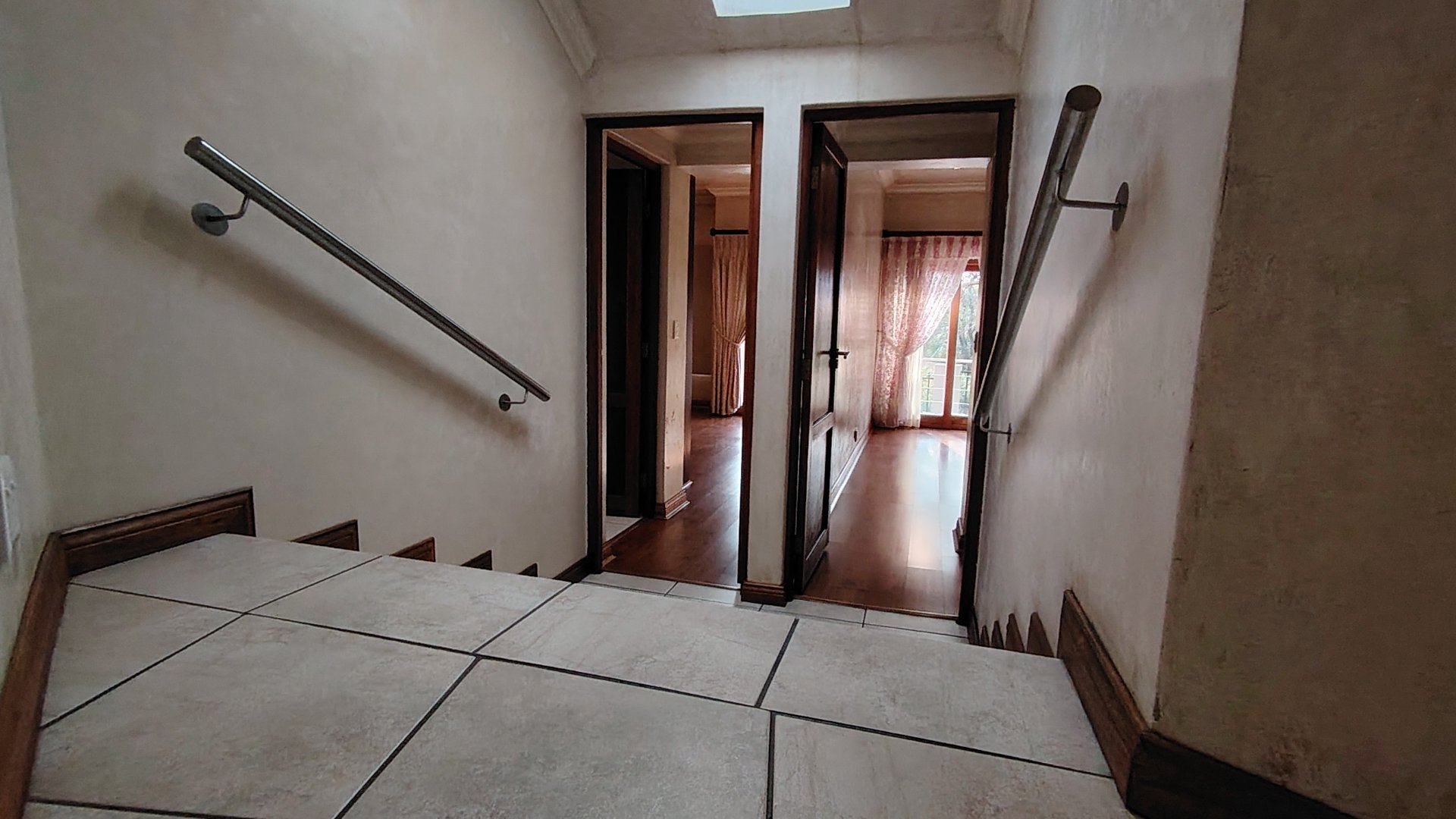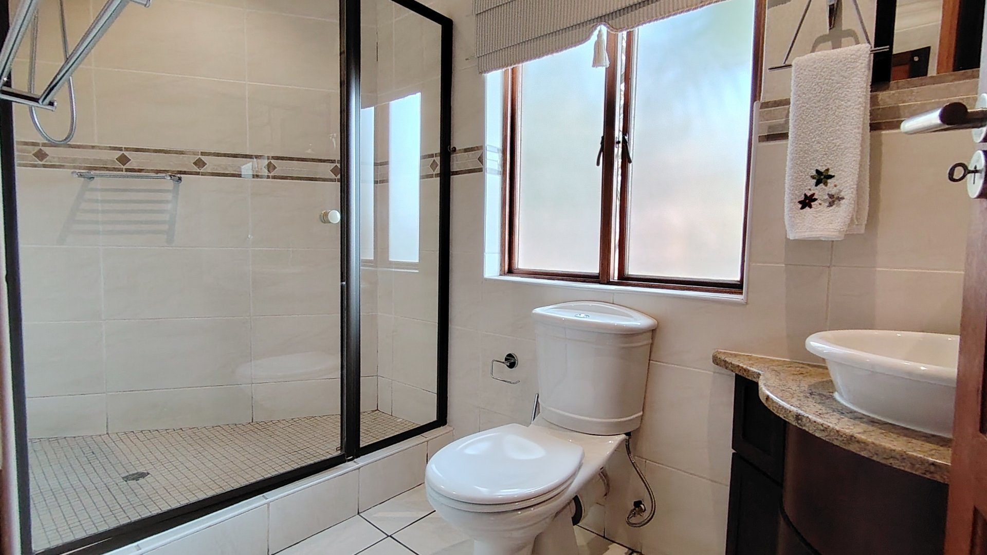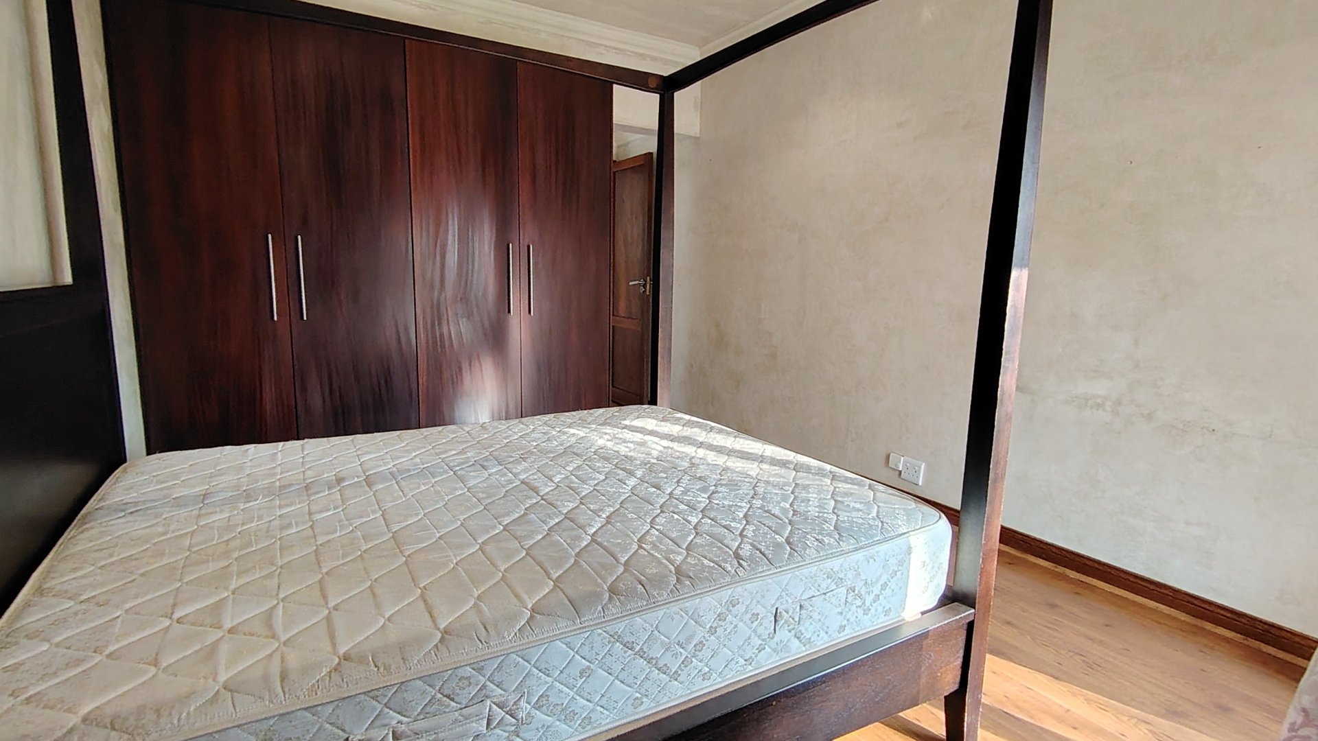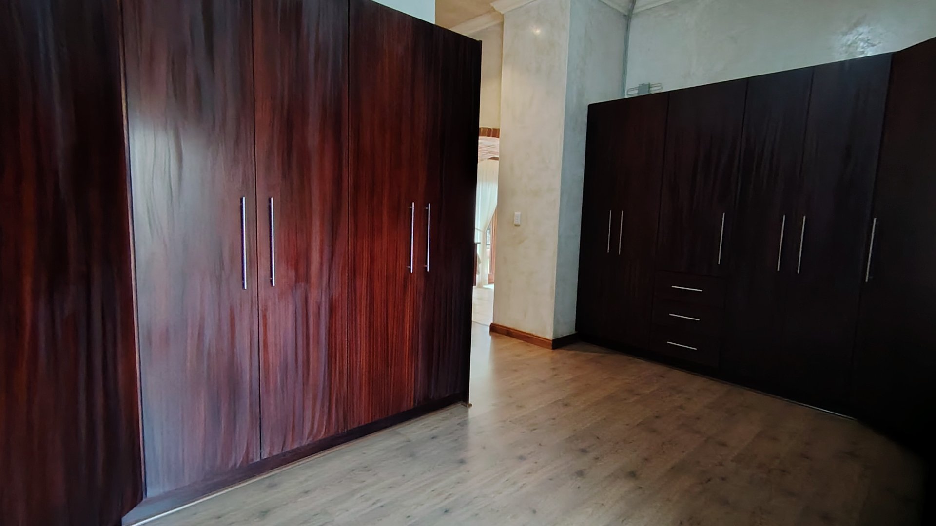 The custom mahogany and granite kitchen is a chef’s dream, featuring a gas hob, breakfast island, prep bowl, and an expansive scullery with space for all appliances. A pantry adds practicality, while the open-plan design ensures the cook remains part of the conversation.