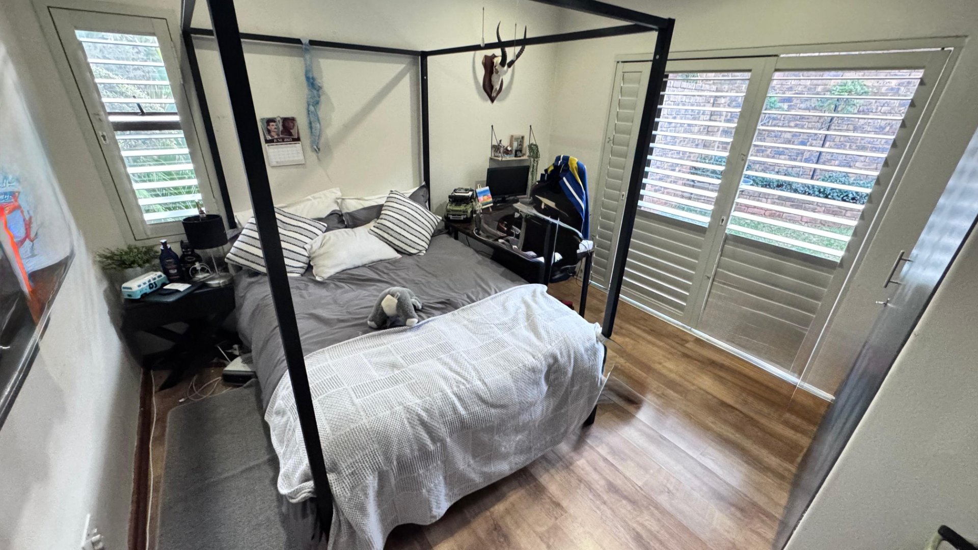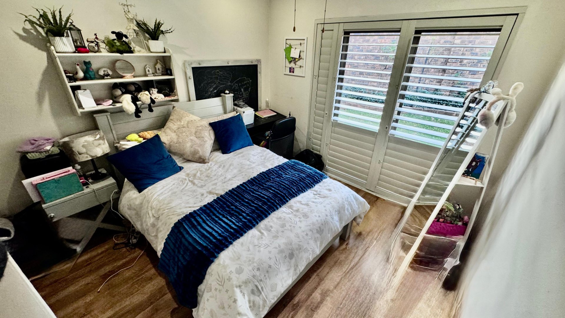 Four bedrooms, each with aluminium sliding doors and shutters opening to the garden