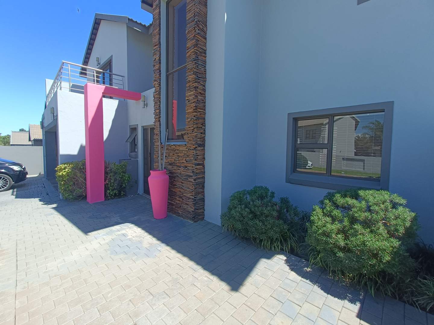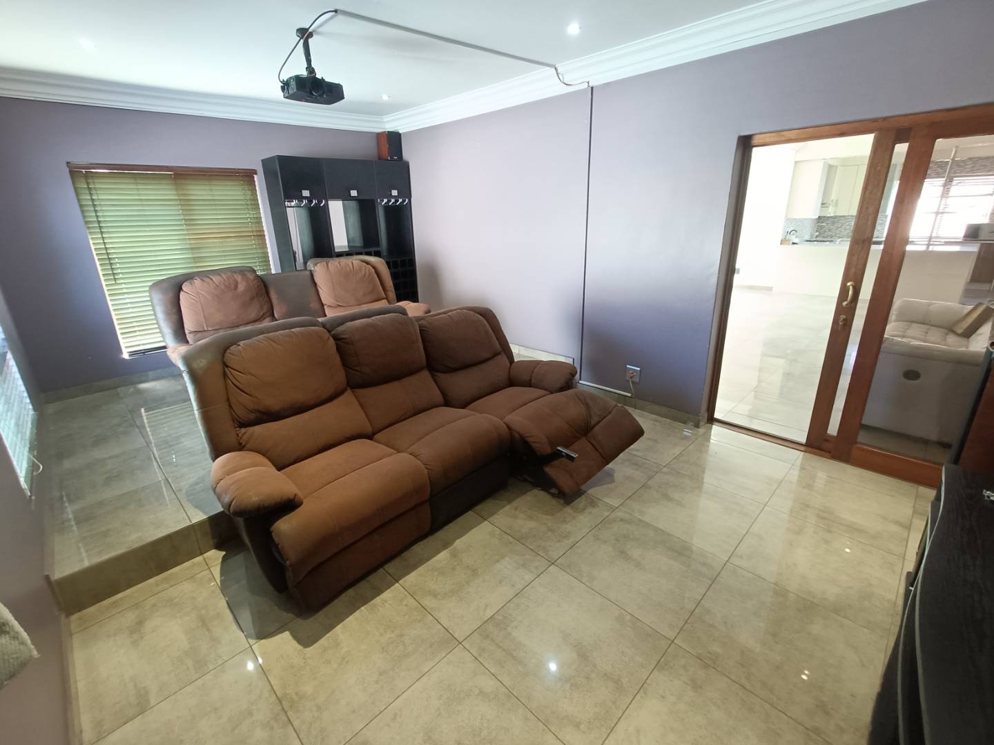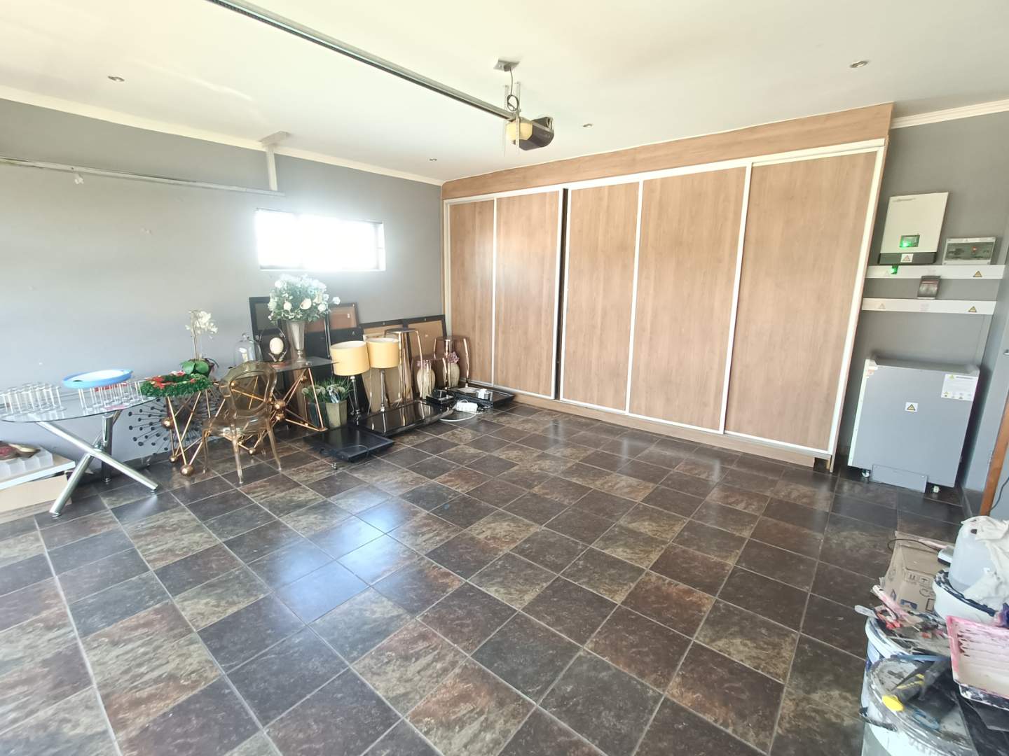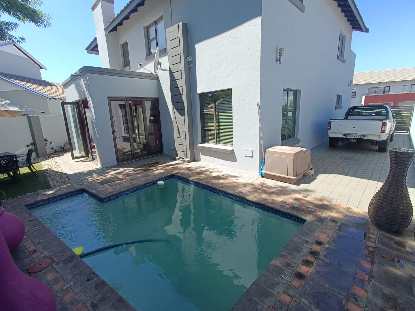 The entertainment area is equipped with a built-in braai and features sliding doors that open to the outdoors, where you’ll find a heated swimming pool ideal for year-round enjoyment. This home is thoughtfully designed to be solar-ready with an inverter system, promoting energy efficiency.