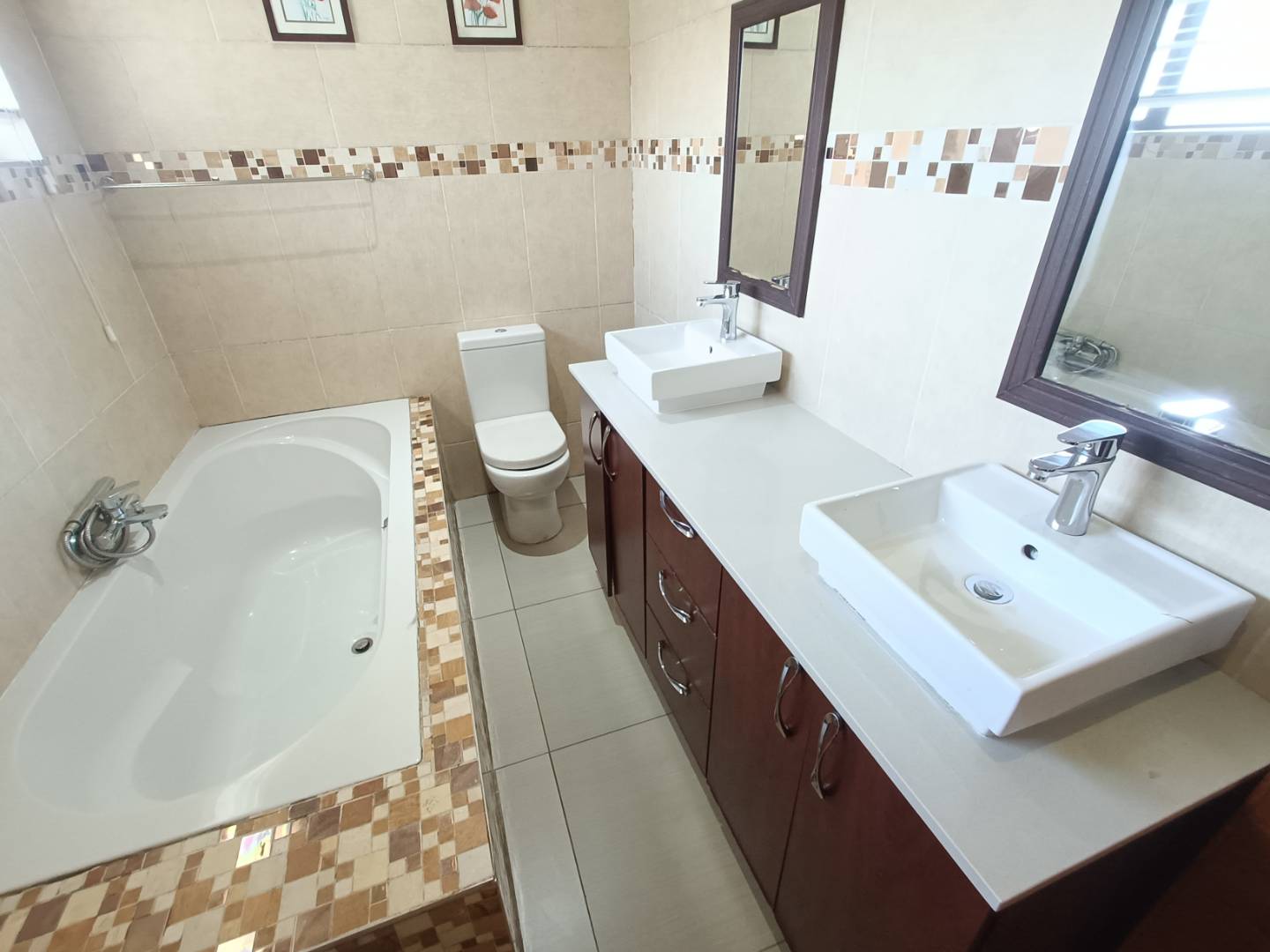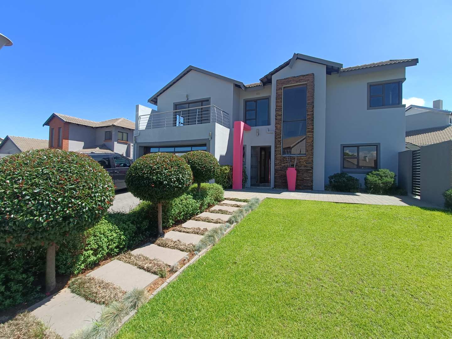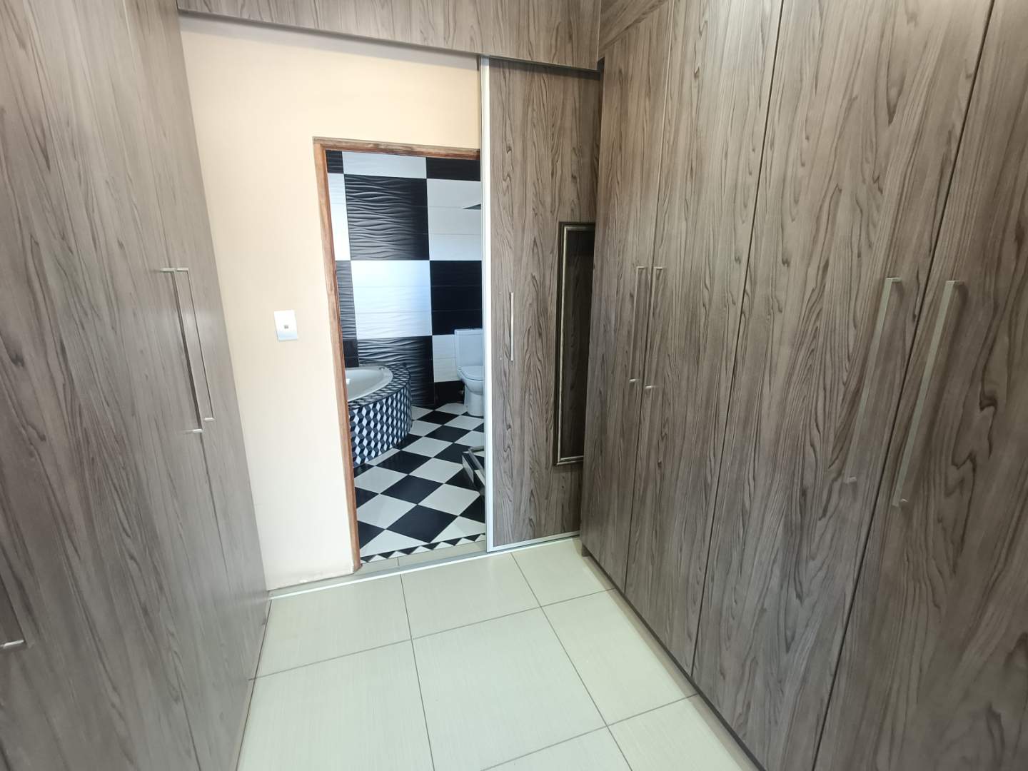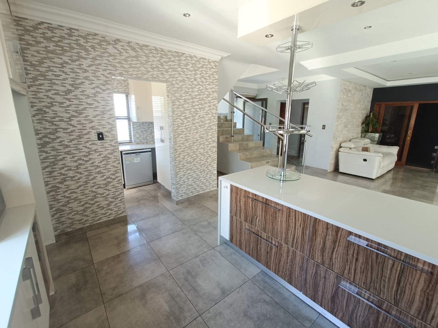The entertainment area is equipped with a built-in braai and features sliding doors that open to the outdoors, where you’ll find a heated swimming pool ideal for year-round enjoyment. This home is thoughtfully designed to be solar-ready with an inverter system, promoting energy efficiency.