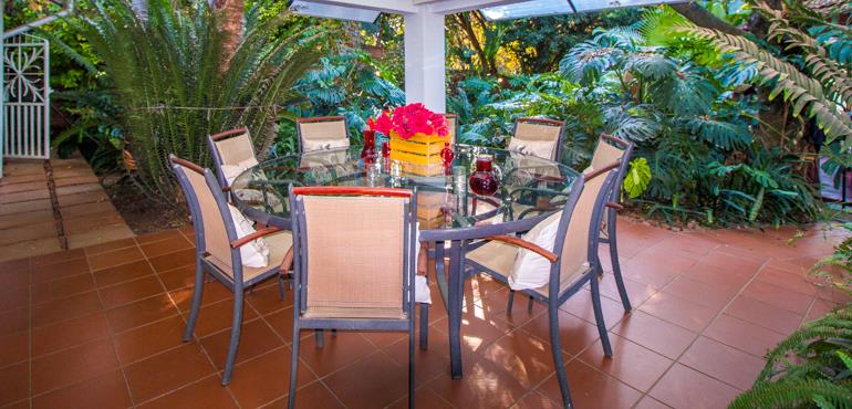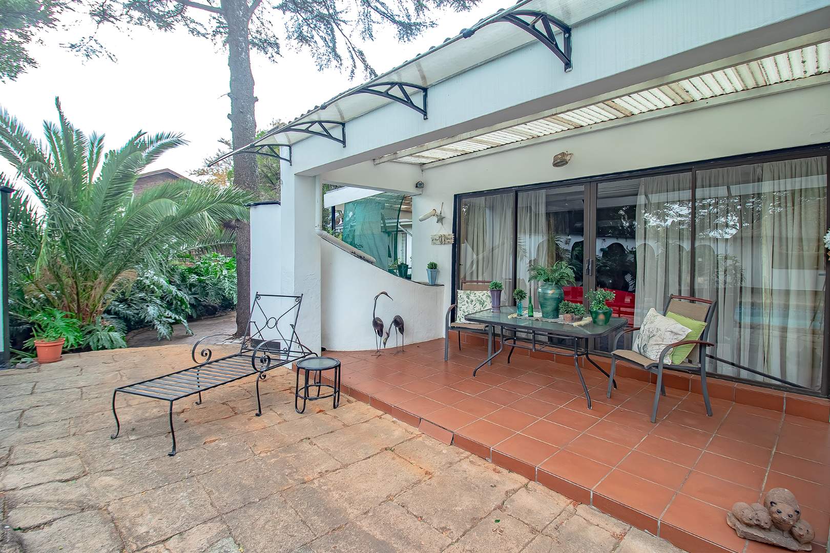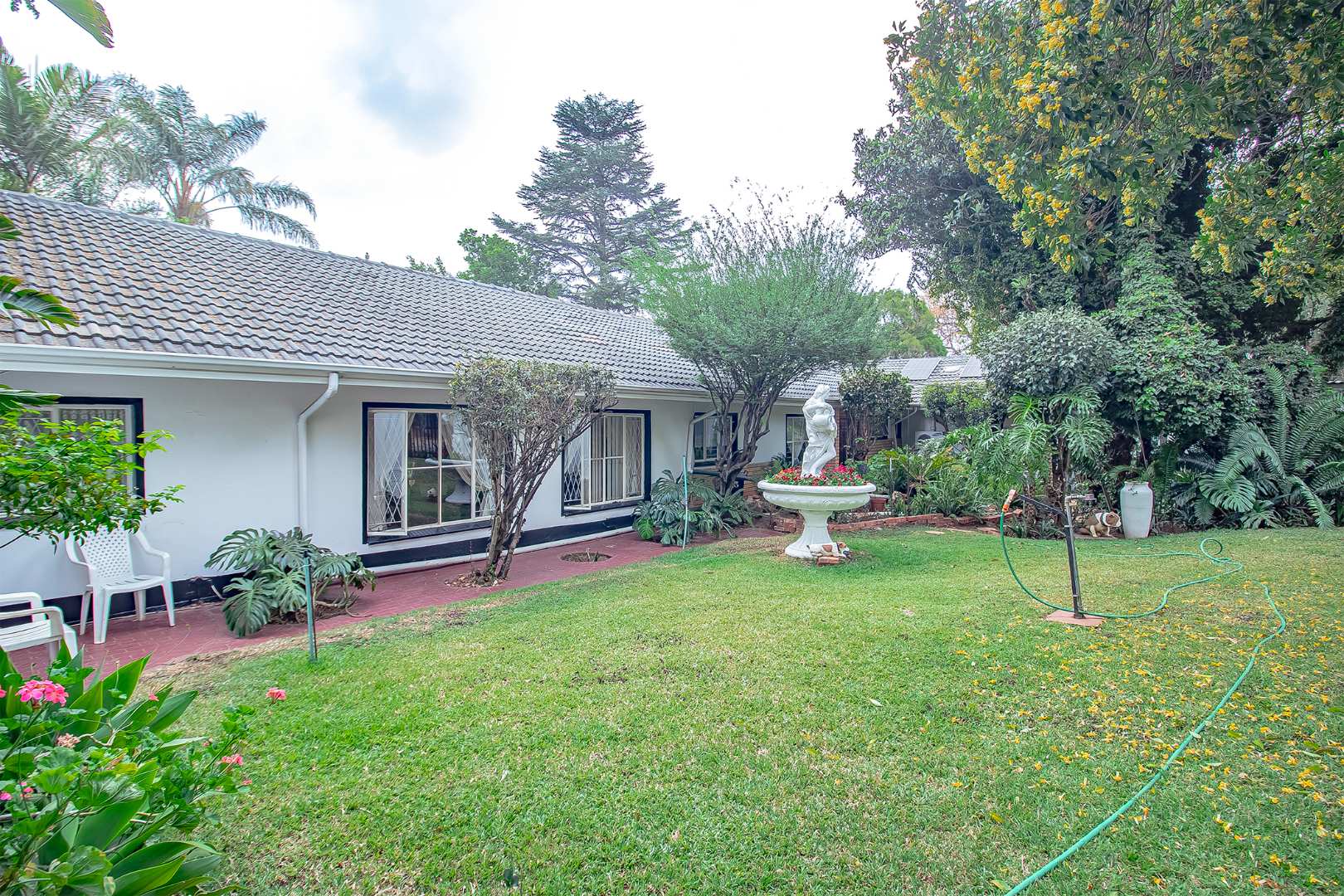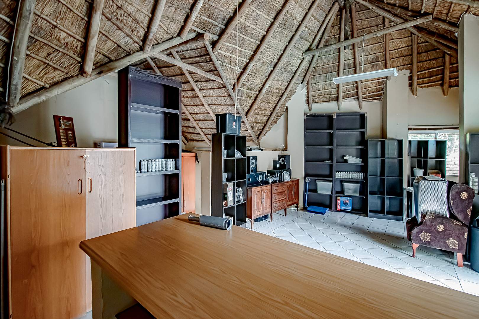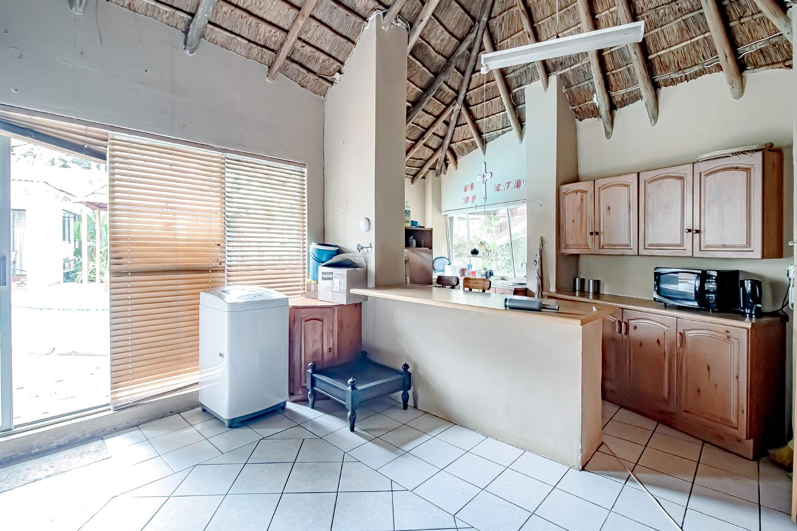 The main residence comsists of four well-sized bedrooms and two bathrooms, along with three exceptionally large living areas, one of which features a built-in fireplace. All living areas flow seamlessly onto covered patios, overlooking a beautifully landscaped garden and a recently renovated swimming pool. and a covered braai area. Adding to the appeal is a charming thatched lapa, complete with two bedrooms, a lounge, dining area, kitchen, and bathroom—ideal for extended family, or over night guests. (There are steps in the lapa so not recommended for persons with walking disabilities)
