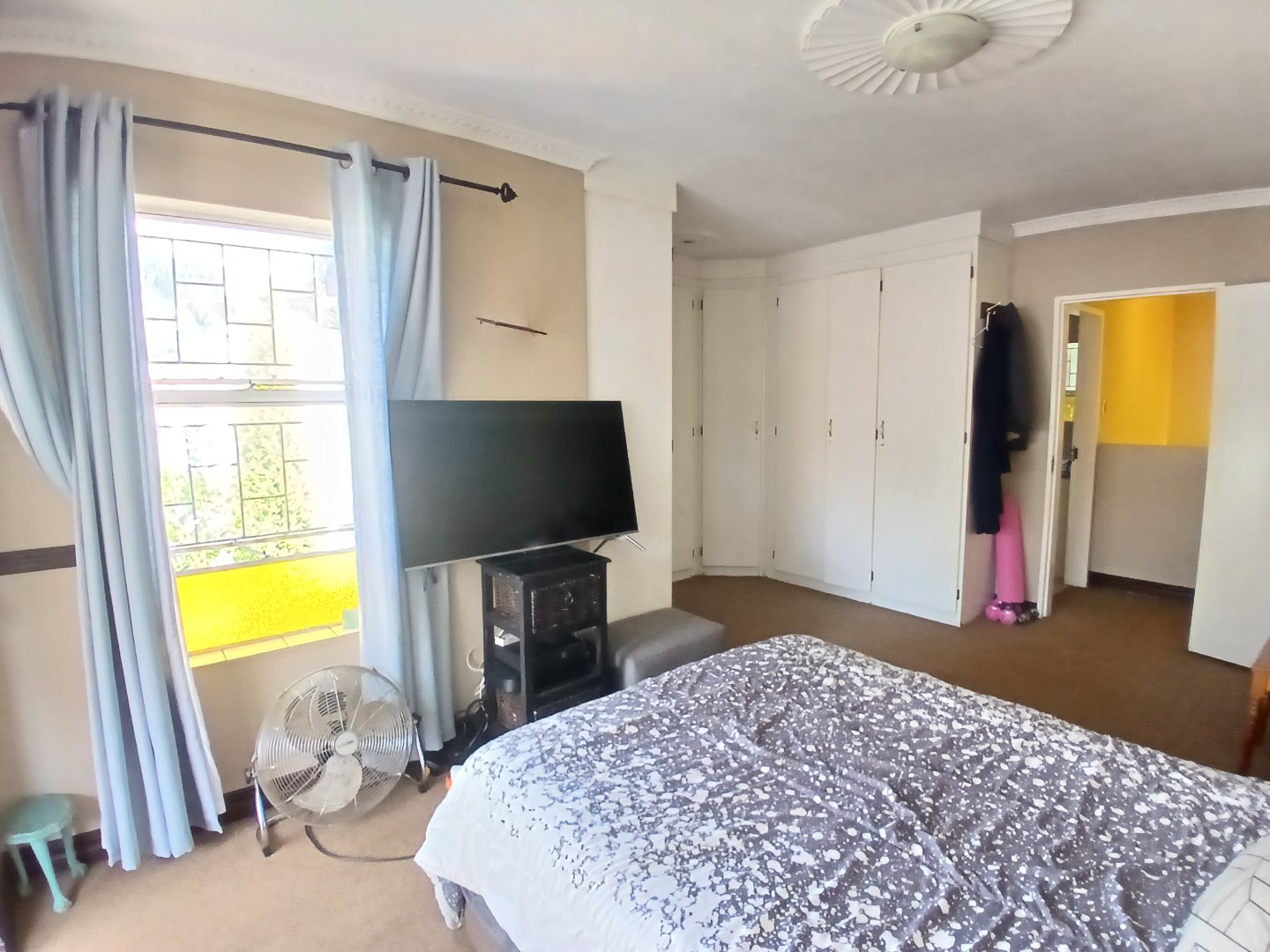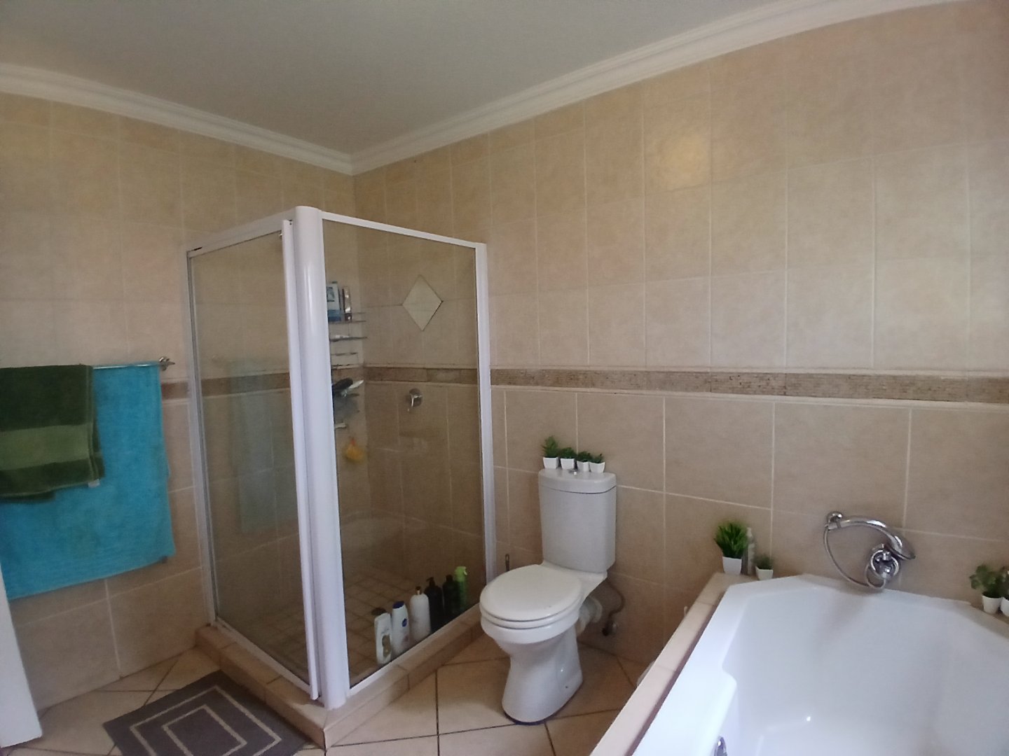 The property boasts three well-sized bedrooms with ample built-in cupboards. The luxurious master suite, located upstairs, is extra spacious and opens onto a private balcony. It features a full en-suite bathroom with a shower, bathtub, toilet, and dual vanity basins.