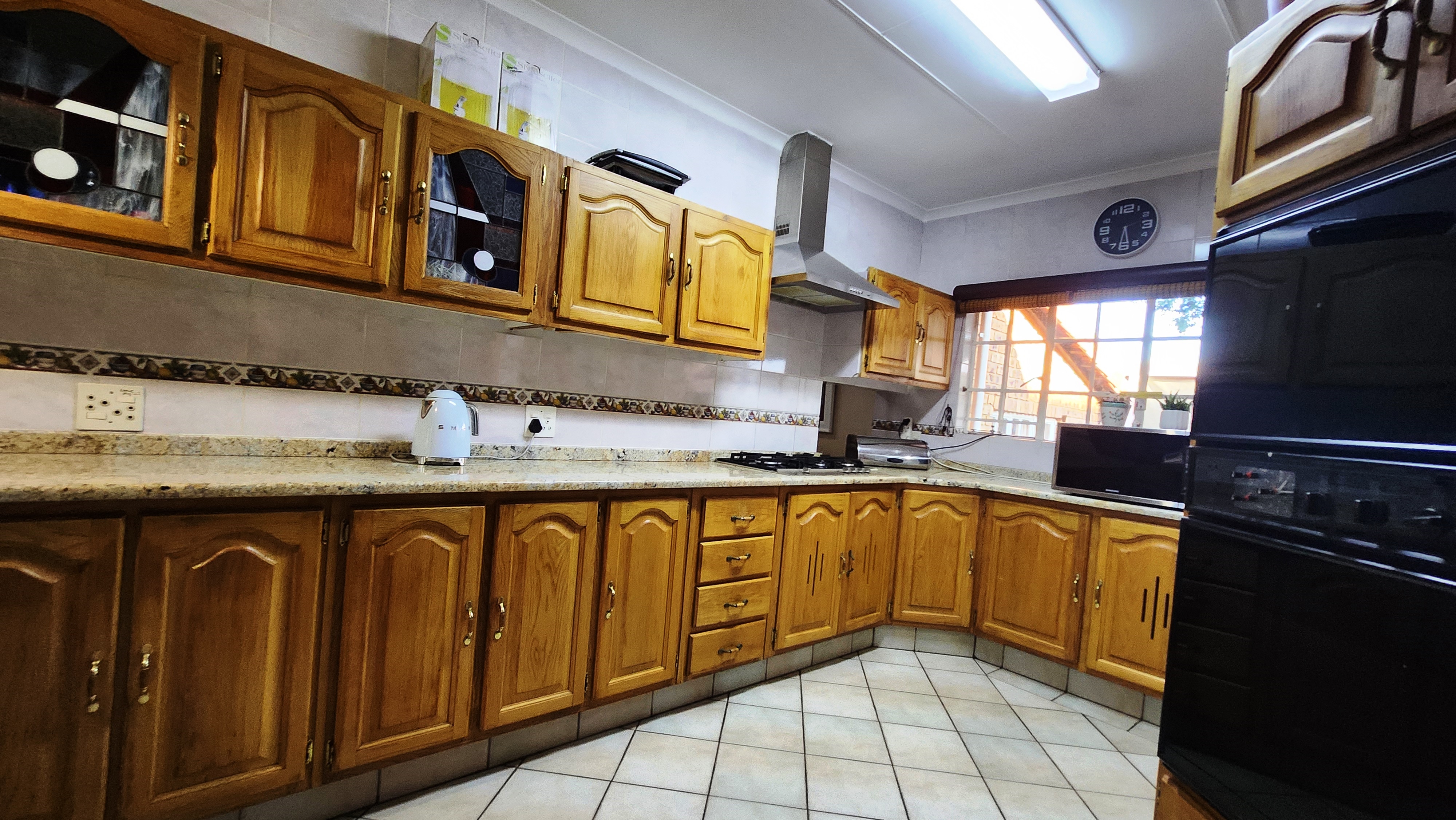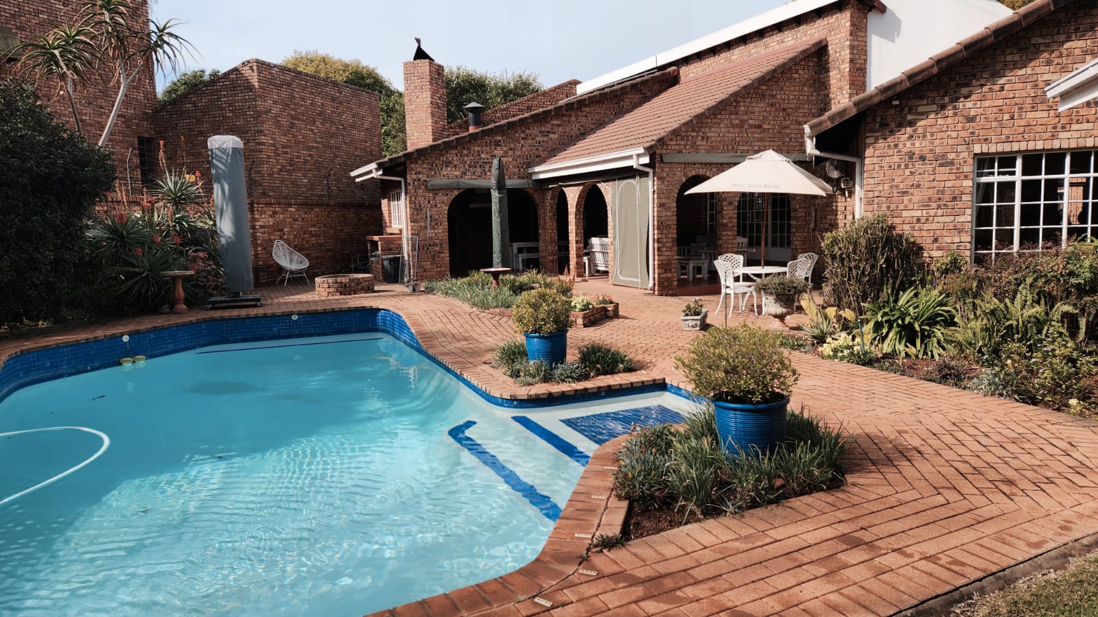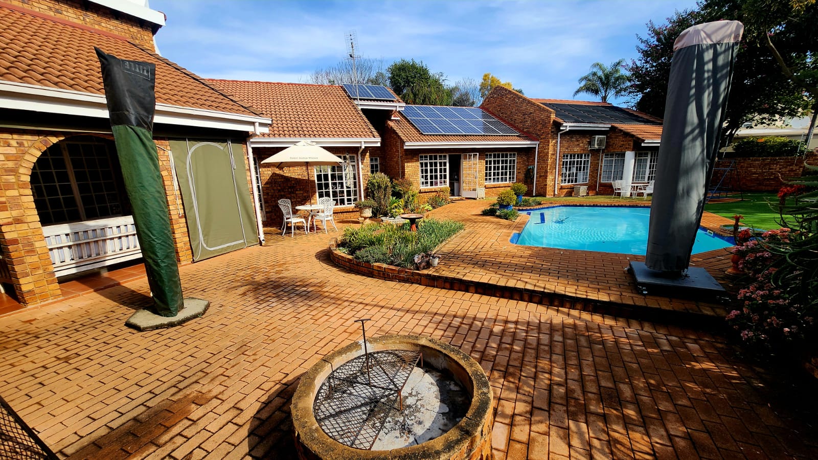 The kitchen, the heart of the home, is beautifully appointed with stunning granite countertops, abundant cupboard space, and a separate scullery and laundry area. An enclosed entertainment space awaits, complete with a stylish bar, a private bathroom with a shower, a gas braai, and a boma area for outdoor enjoyment. Step outside to discover a sparkling heated pool, a trampoline nestled within the beautifully landscaped garden, and convenient staff quarters.