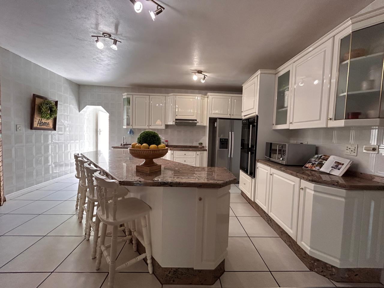 The modern kitchen is equipped with sleek granite countertops, a convenient breakfast nook, a pantry, a scullery, and a laundry area.