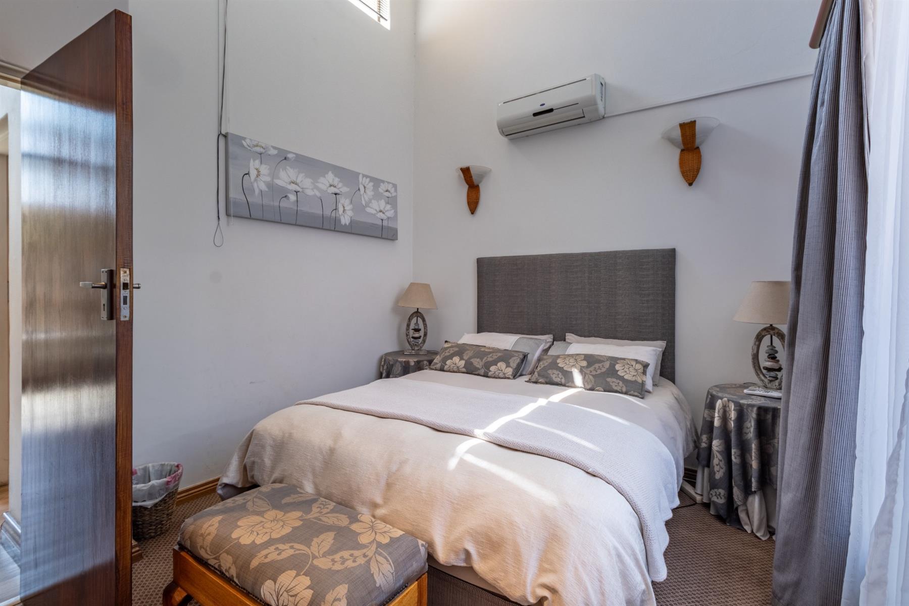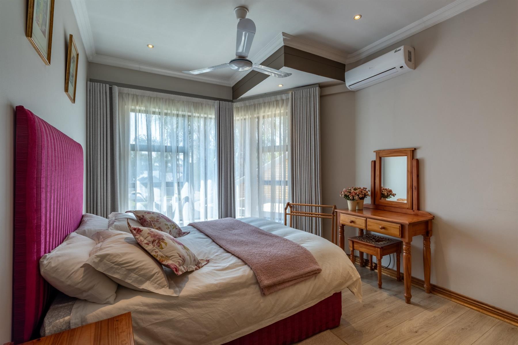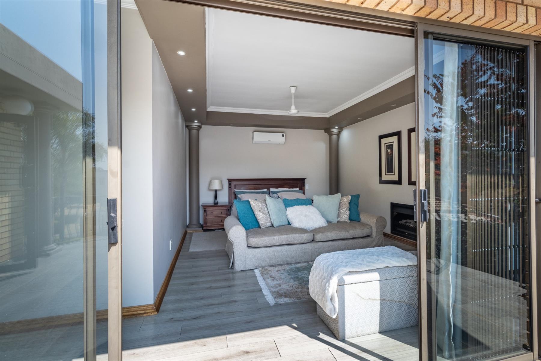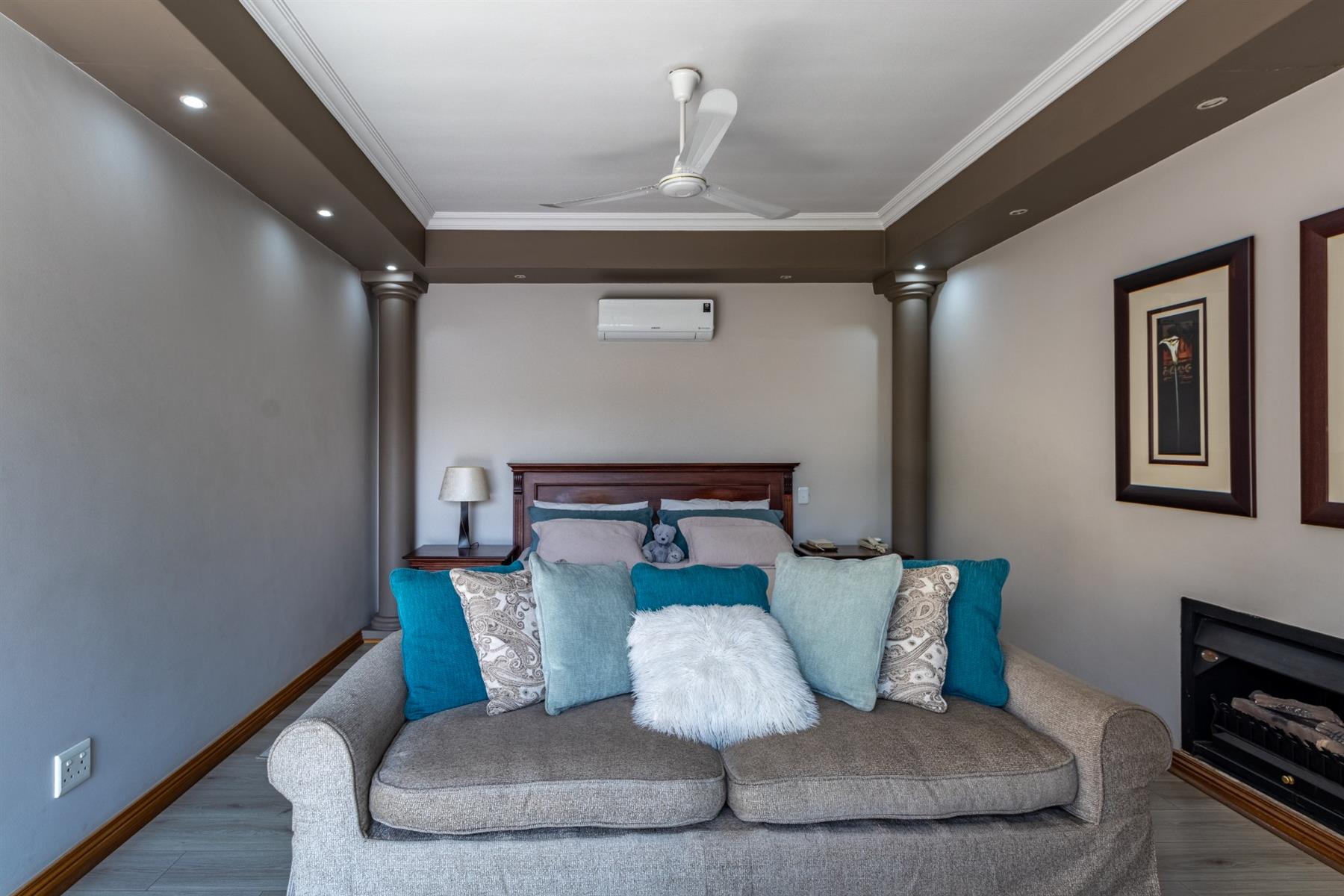 The main house boasts four well-appointed bedrooms, each with built-in cupboards and stylish finishes. The main bedroom includes gas fireplace, walk in closet and en-suite bathroom with a shower, bath, double basin, and toilet, while the additional bathrooms are tastefully tiled with porcelain tiles and quality fittings. The bedrooms are further enhanced with laminated flooring, air-conditioning, downlights, and Rhino ceilings, ensuring both style and practicality.