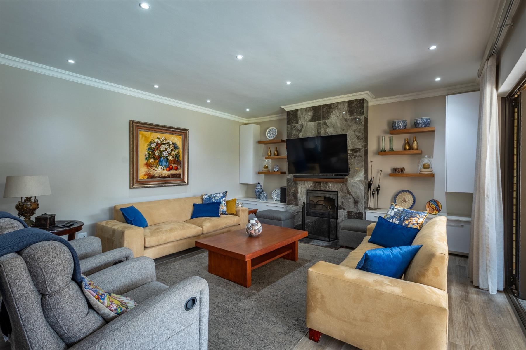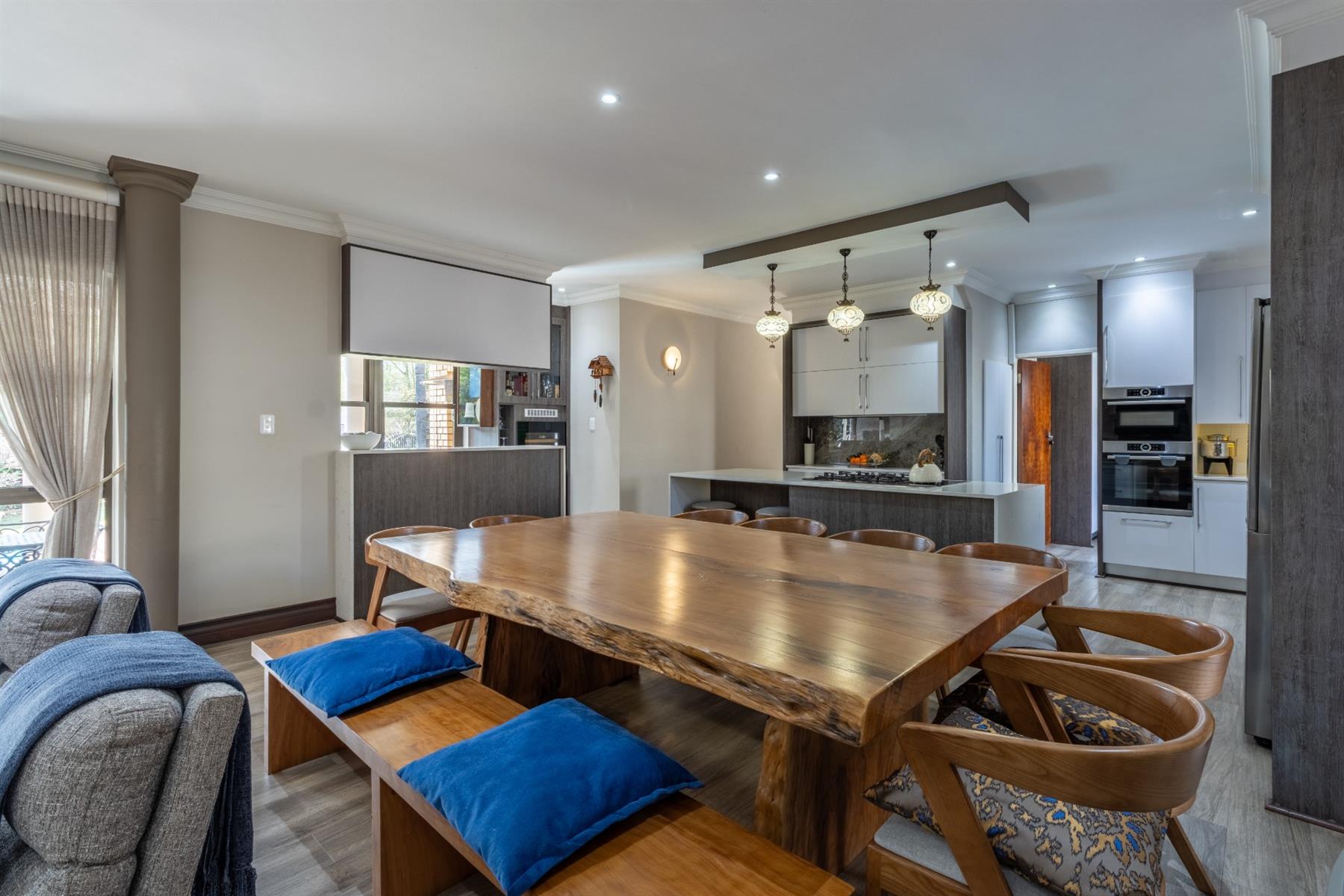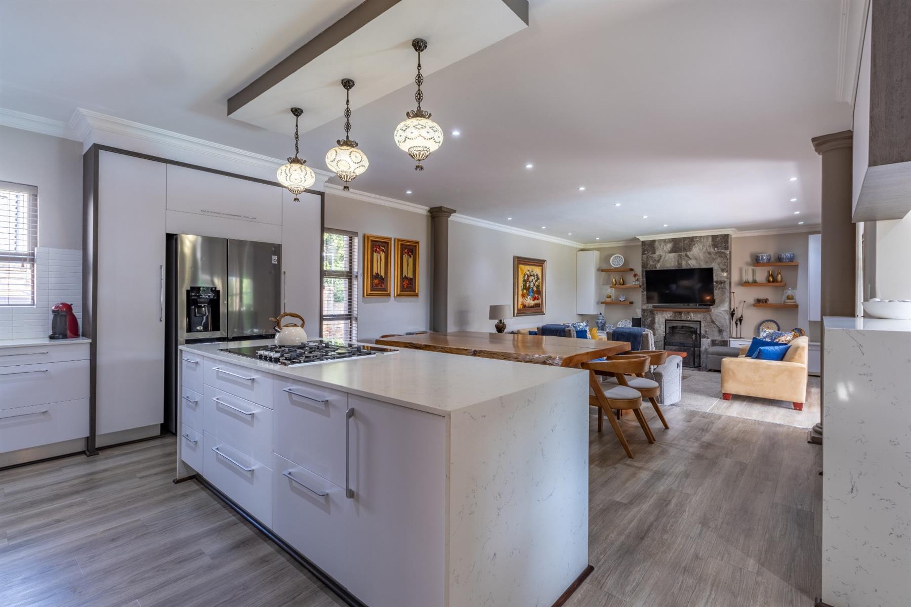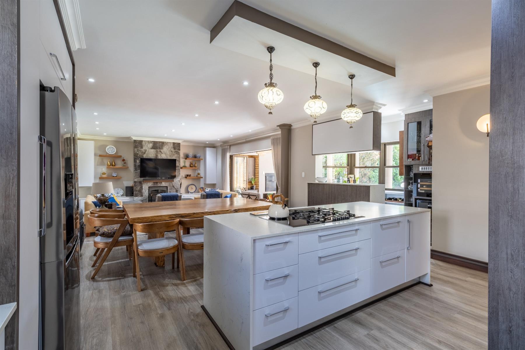 Multiple living areas provide the perfect balance between relaxation and entertainment. The lounge and dining room feature wood fireplaces, while the modern kitchen is fitted with granite countertops, a scullery, double sink, gas stove, oven, microwave, and ample cupboard space. A pantry and linen room add to the convenience, while the bar area with skylights creates the ideal space for entertaining.