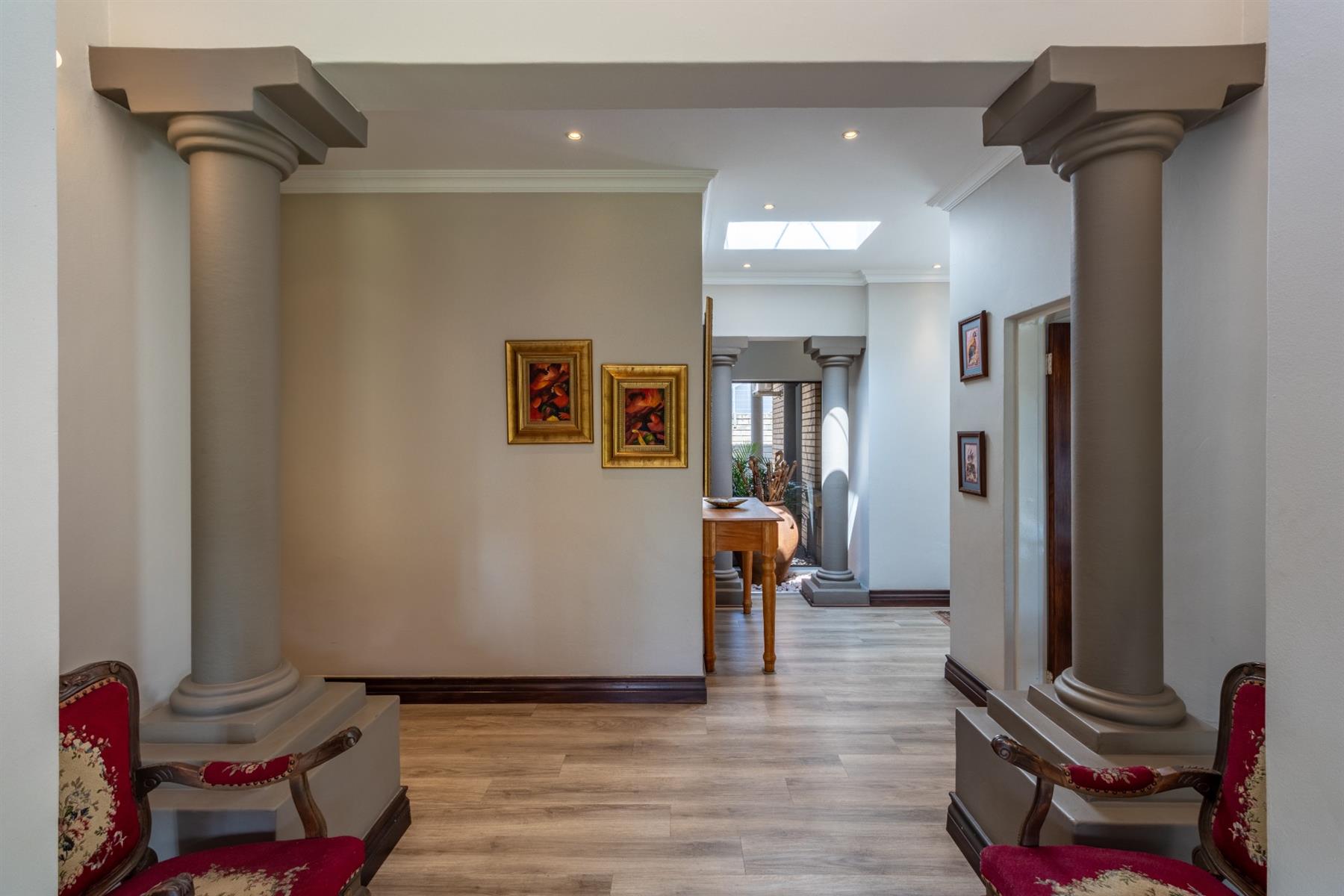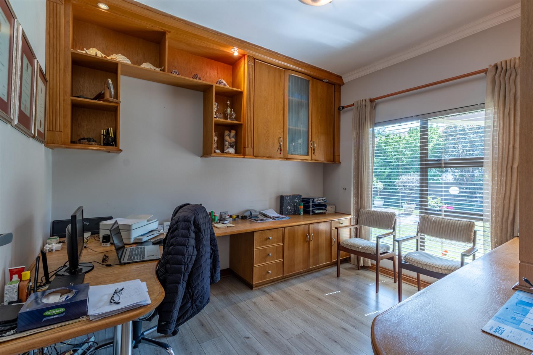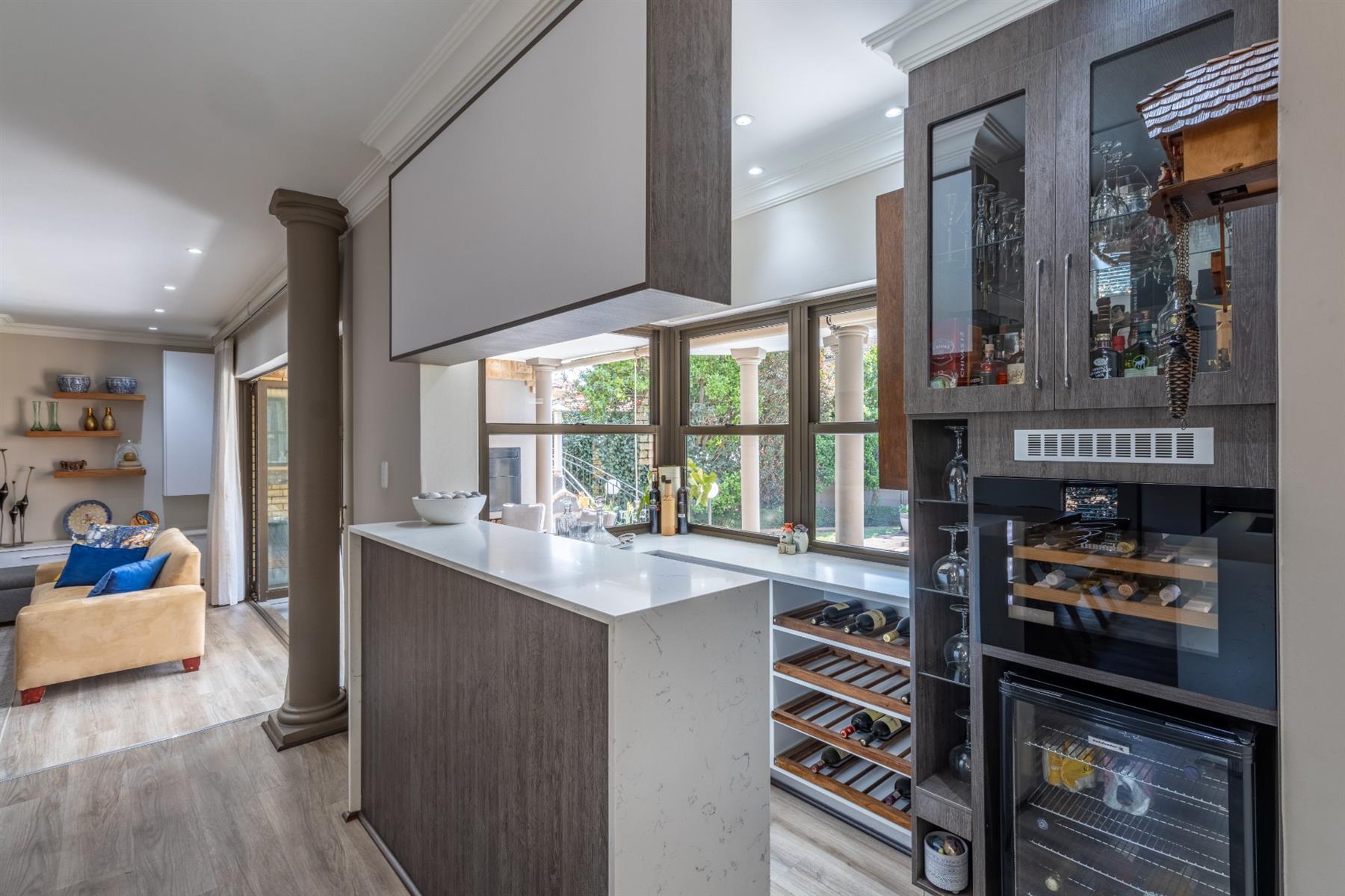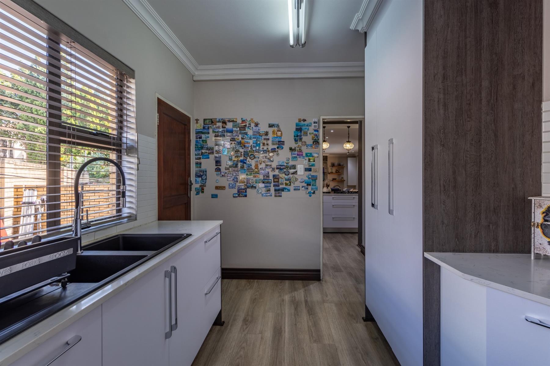 Multiple living areas provide the perfect balance between relaxation and entertainment. The lounge and dining room feature wood fireplaces, while the modern kitchen is fitted with granite countertops, a scullery, double sink, gas stove, oven, microwave, and ample cupboard space. A pantry and linen room add to the convenience, while the bar area with skylights creates the ideal space for entertaining.