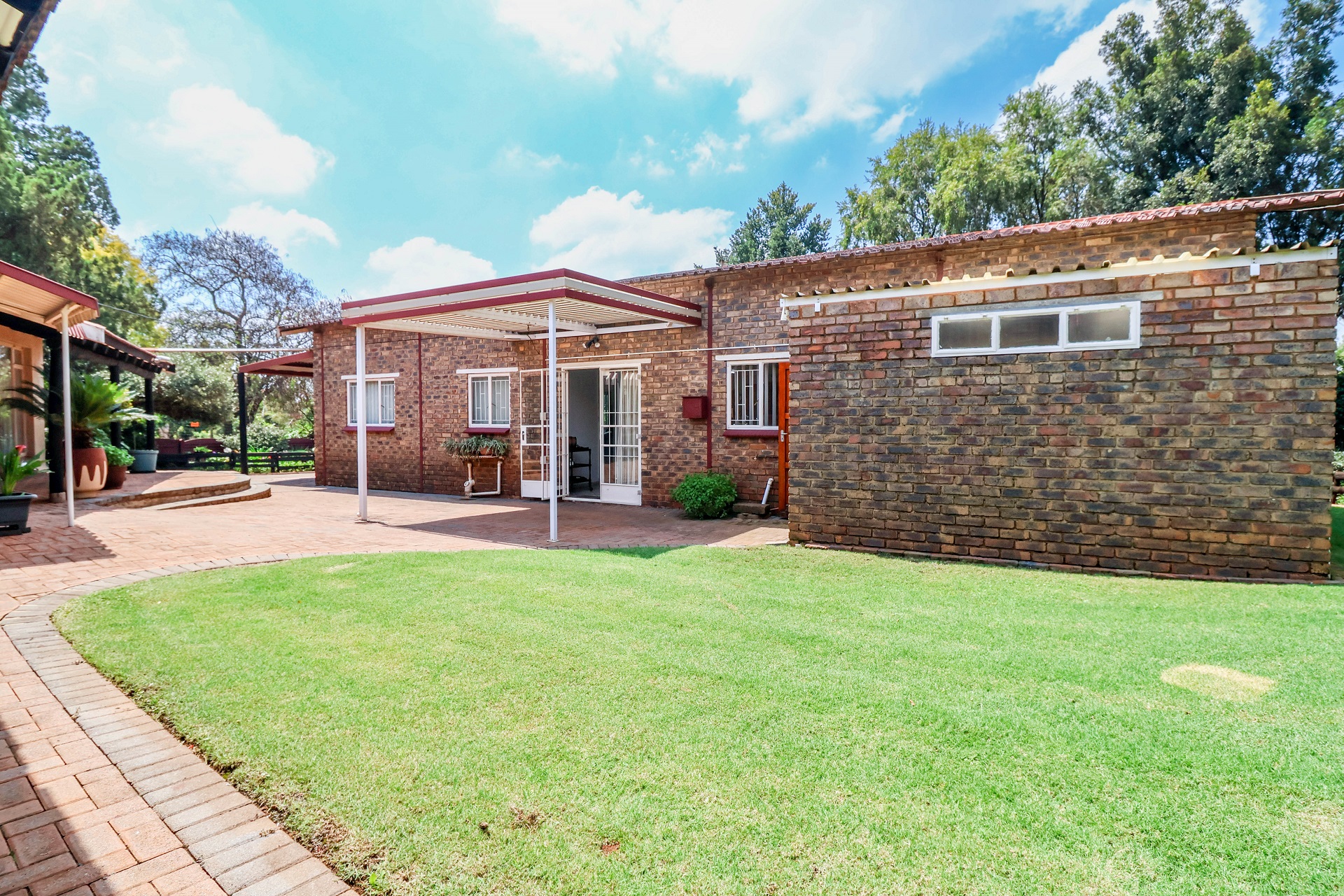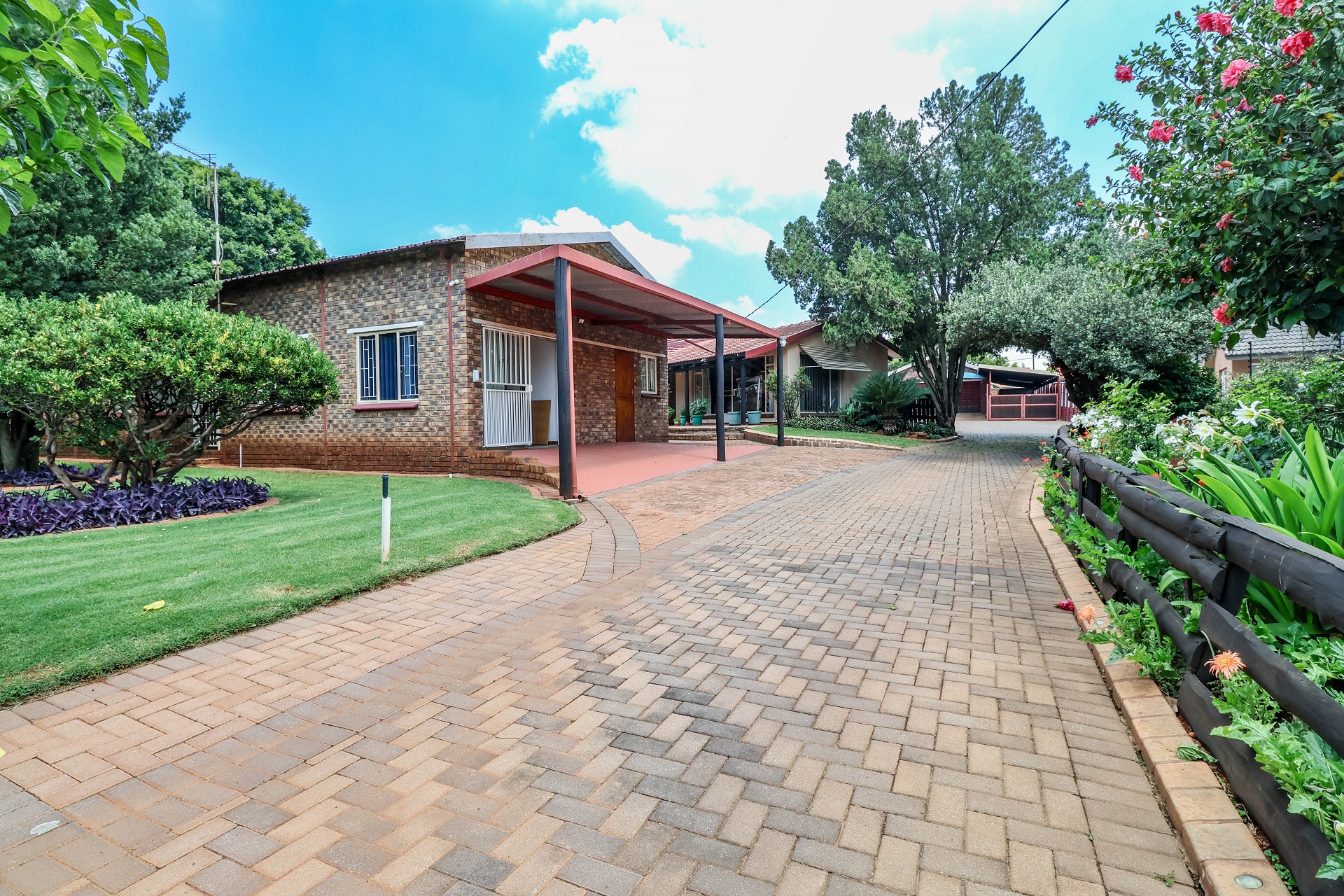 The double garage has a long and sturdy carport (long enough for 3 vehicles) beside it. The staff quarters is behind the garage and has it's own toilet and basin with a small wendy-house that was used as the kitchen for the SQ.