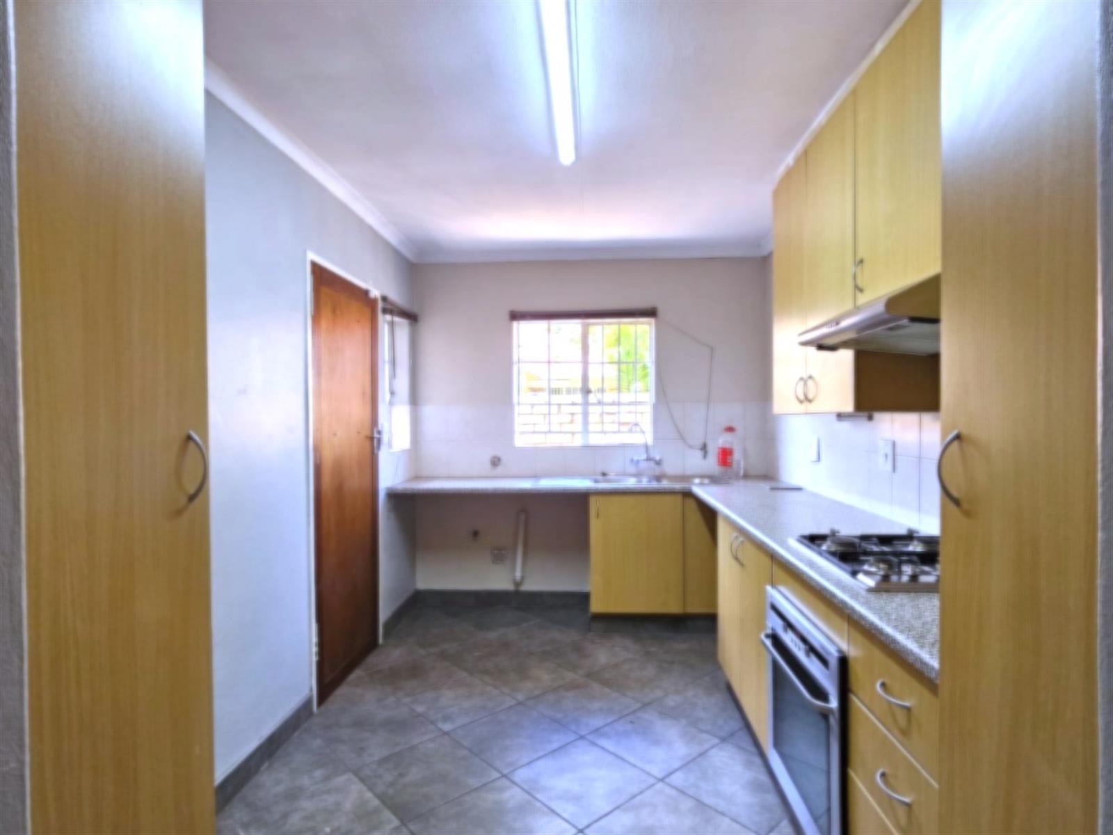 At the rear, a second patio, private garden, and built-in braai area create a perfect outdoor living space. The kitchen is equipped with a Smeg gas stovetop and an electric oven, both well maintained.