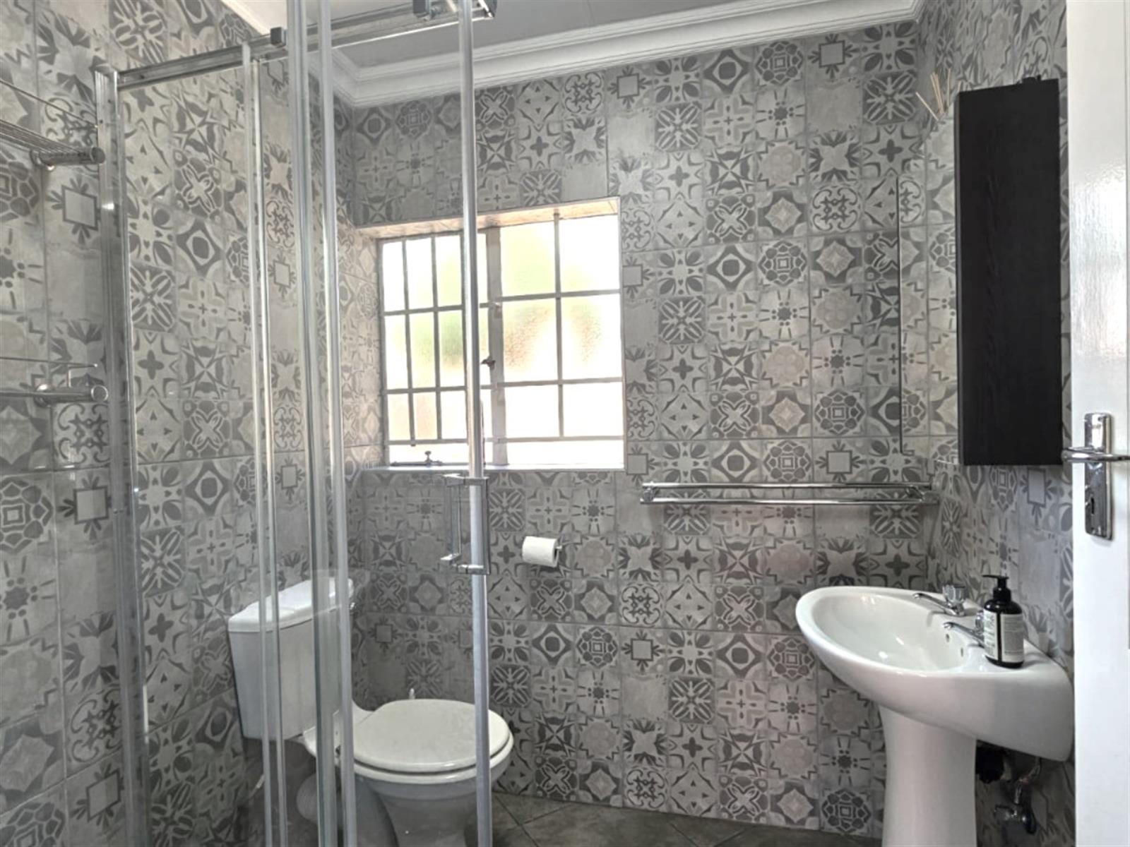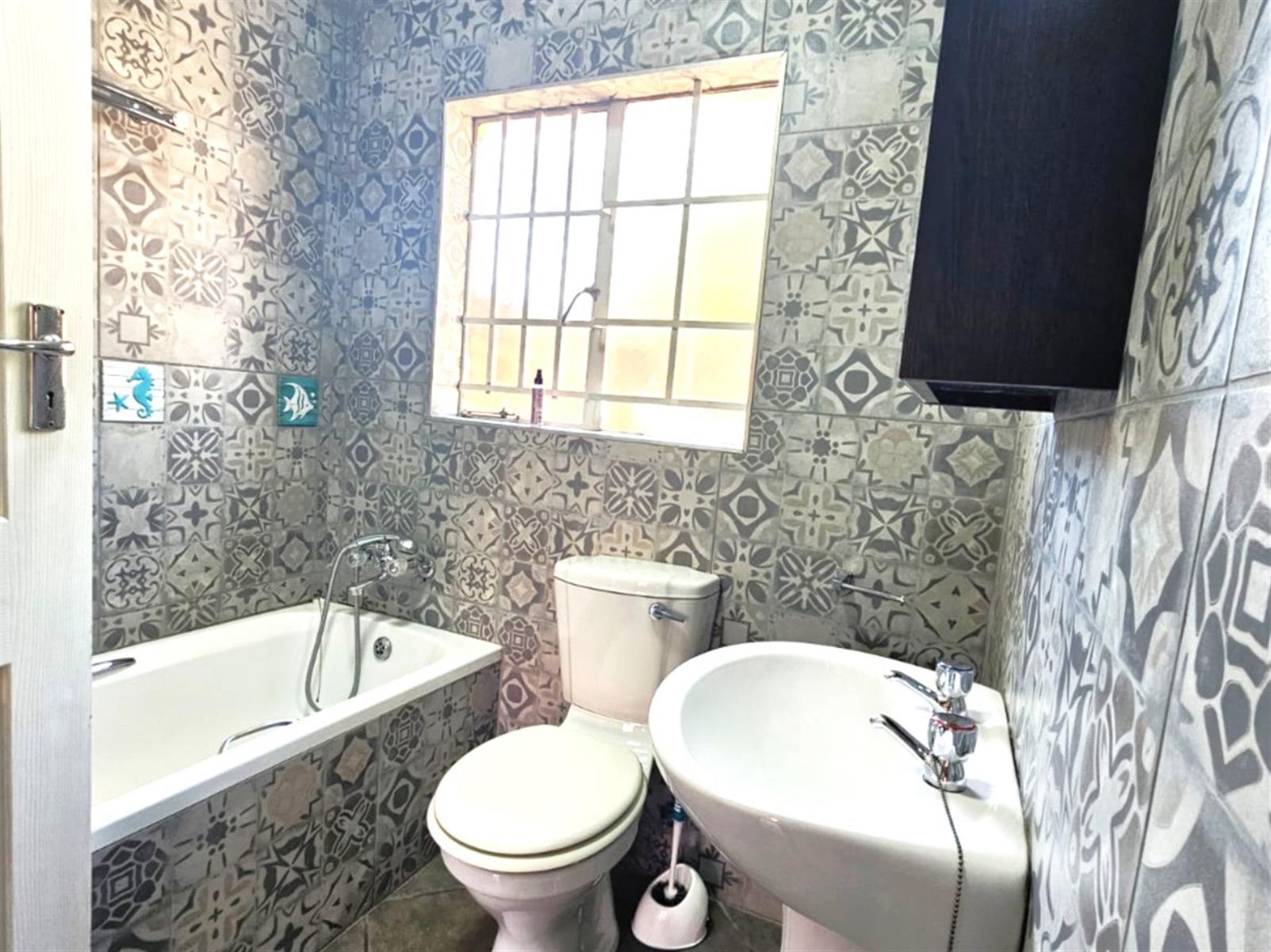 Both bathrooms have been recently renovated with contemporary tile finishes and stylish light-grey patterned flooring. The bedrooms are tastefully decorated with mushroom-toned walls, ample cupboard space, and charming cottage-style windows. The double garage is fitted with automated doors for ease of access.