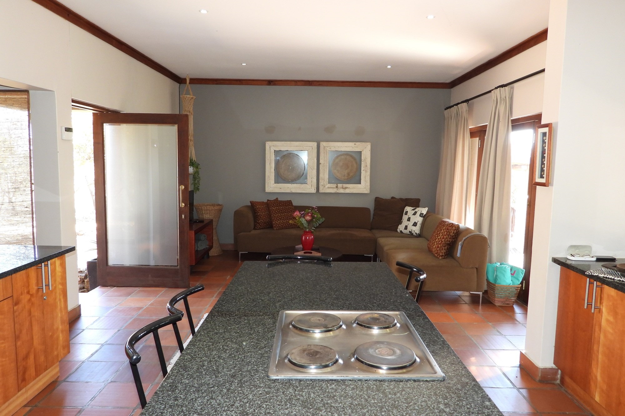Step inside to a spacious open-plan kitchen and lounge where warm tones and natural textures create a relaxed, inviting atmosphere. The living space flows effortlessly onto a generous deck with a built-in braai, perfect for evenings under the stars. Just beyond, a sparkling swimming pool and cozy boma invite you to unwind, with the sights and sounds of the bush as your backdrop.