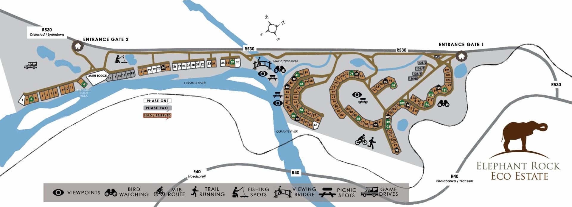 This Estate supports green and eco friendly building structures, has a variety of plains game and birds, picnic spots with boardwalks along the Olifants River, cycling and running trials, catch and release fishing, all set in African bush with Appelblaar and Sycomore trees.