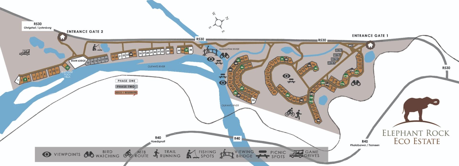 This Estate supports green and eco friendly building structures, has a variety of plains game and birds, picnic spots with boardwalks along the Olifants River, cycling and running trials, catch and release fishing, all set in African bush with Appelblaar and Sycomore trees.
