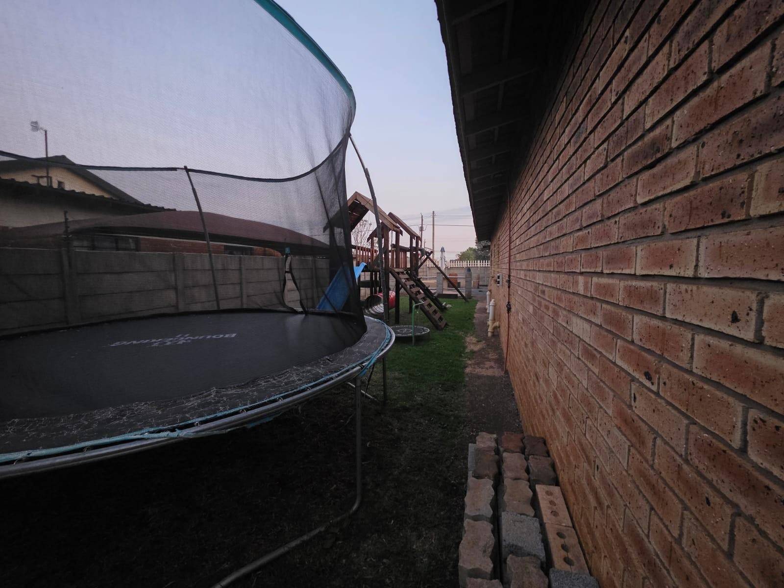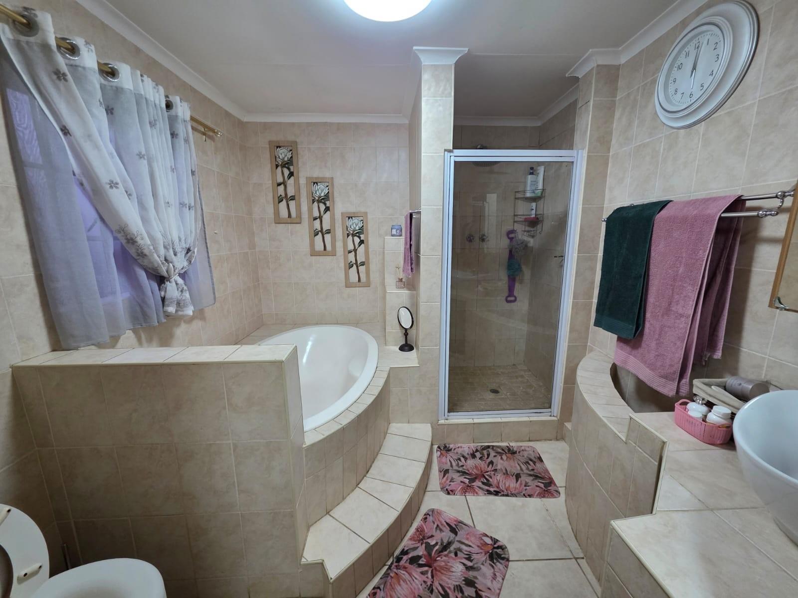 Additional features include automated garage doors leading to double garages, an outside toilet, and a flatlet for extended family or guests. The home is equipped with air conditioning, ensuring comfort year-round, and is secured with an electric fence, burglar bars, and outdoor beams for peace of mind.