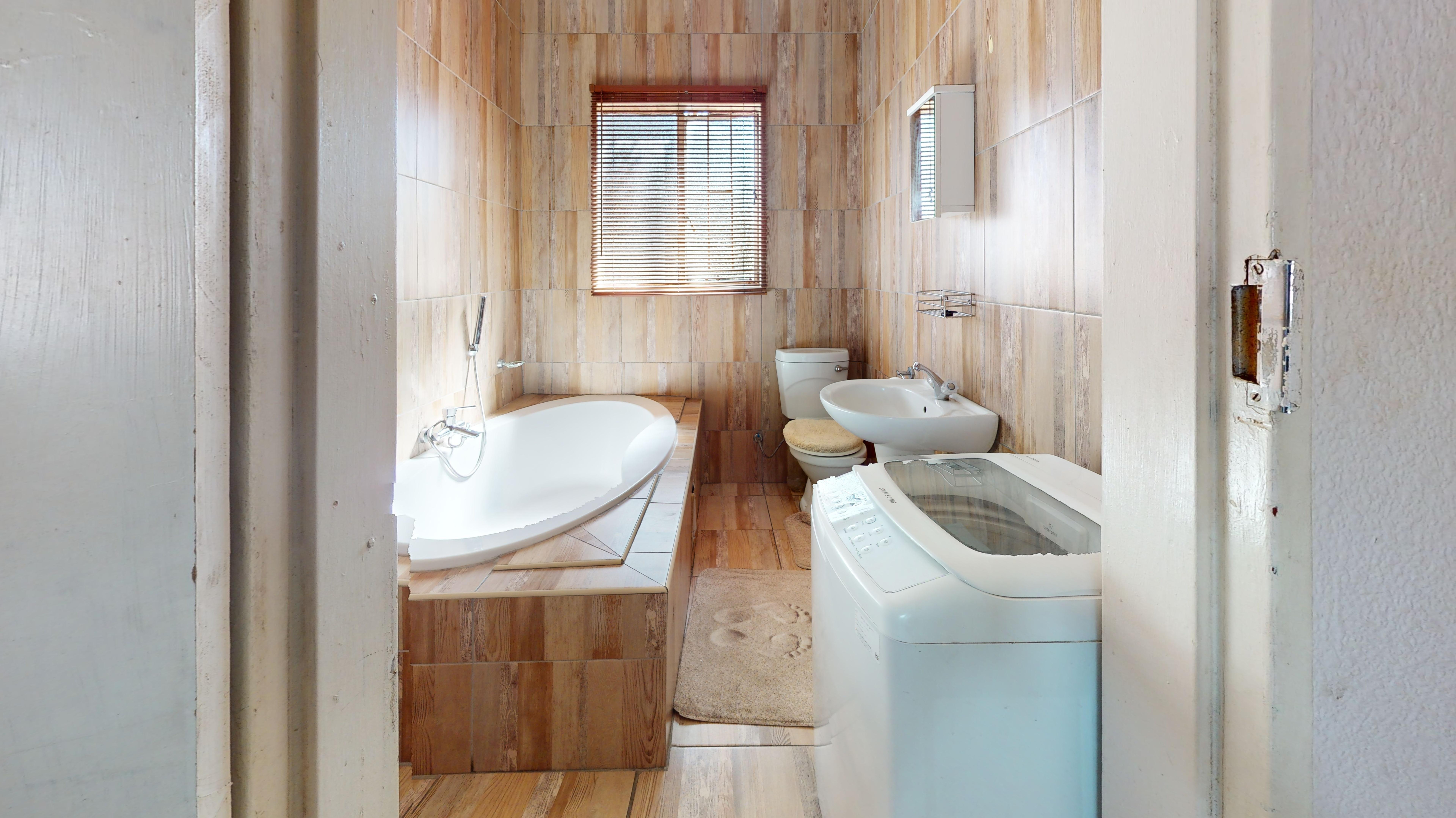 Contemporary Bathroom: Features a bath, toilet, basin, and dedicated space for a washing machine.