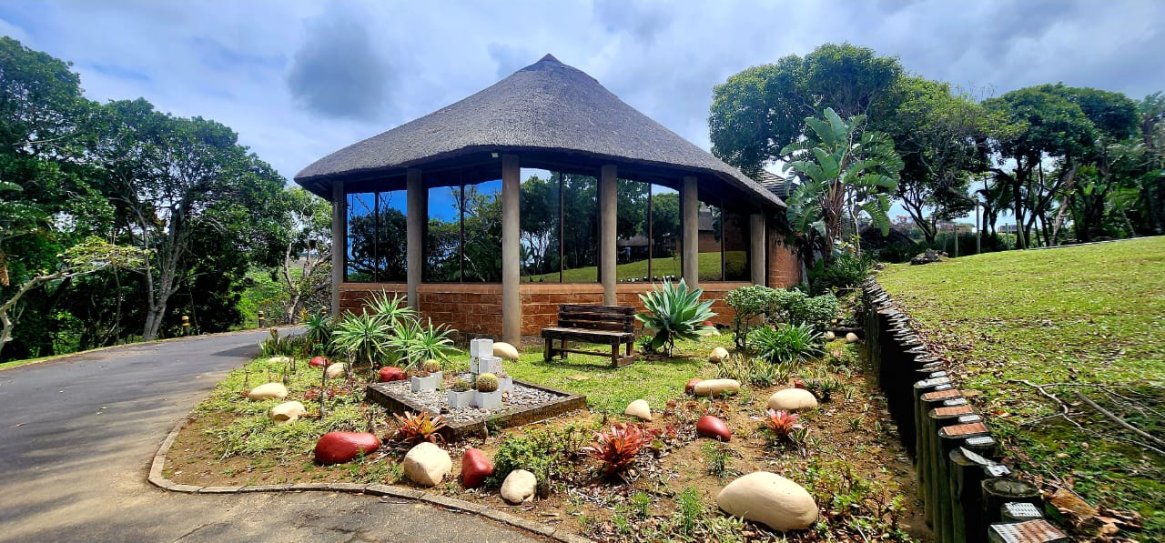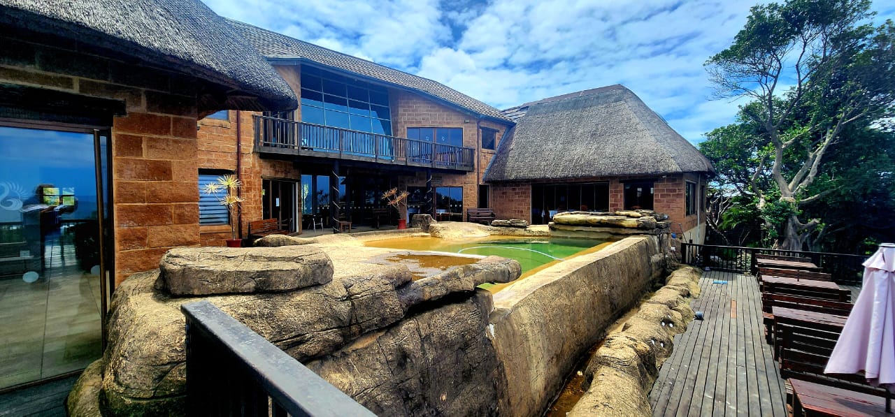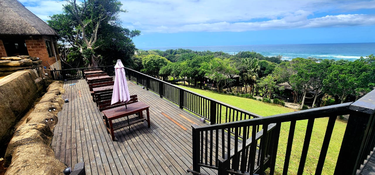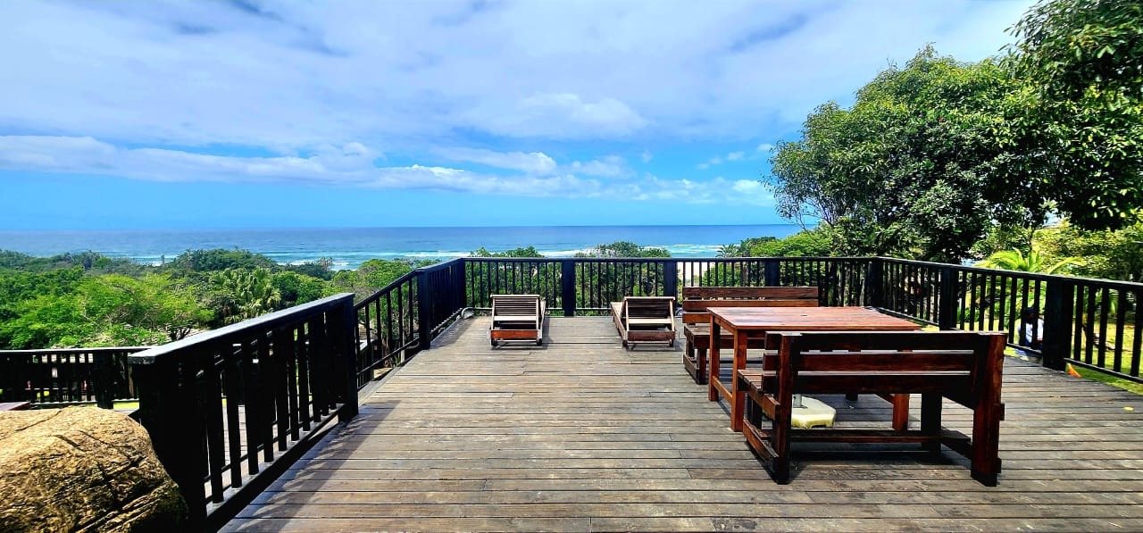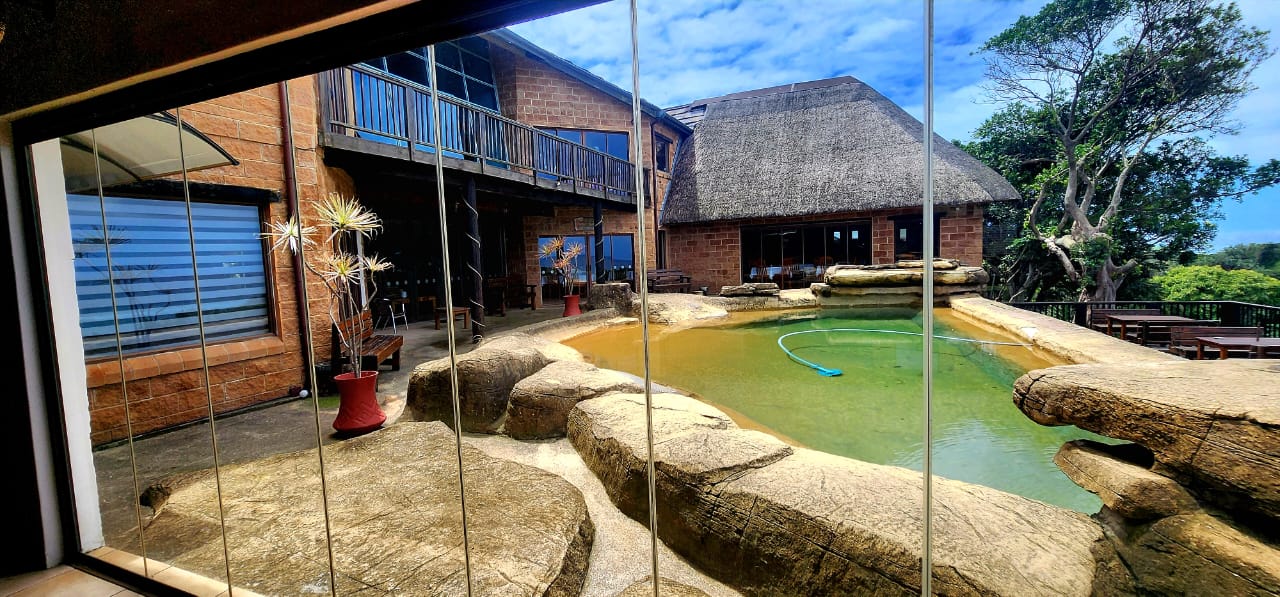 BEACHFRONT...Situated in the coastal village of Elysium adjacent to Ifafa, in a quiet dream location, on a large property of 4,56ha, consisting of large indigenous trees, manicured, rolling lawns and feature flower beds. You are welcomed by an impressive thatched entrance complete with guard house and ablutions, a winding tarred road leads to the main hotel building, perched in the centre of the property, on top of the hill. Drive under the large covered entrance, enter the hotel into a large reception area with double volume vaulted roof, with a dramatic stairway and stunning ocean views through the large pane windows, the reception area has a large seating area for the guests while checking in. This leads to the 20 seater conference room with reception area and ablutions, there is a large games room and a bar (opening to the large viewing deck) with seating area and a fully functional spa. The owners residence is on this wing, consisting of a lounge, 5 bedrooms, 4 bathrooms and the main bedroom has a secluded balcony with incredible views. On the opposite wing of the reception foyer is the 54 seater restaurant with panoramic ocean views, a coffee shop and a large well equipped kitchen with a cold room and freezer room, another large bar and seating area. There is a full scale laundry room with outside enclosed drying area and staff ablutions. In the vast gardens is a large jungle gym to keep the children busy for hours, and a rock feature swimming pool, all with ocean views and some inland views.
