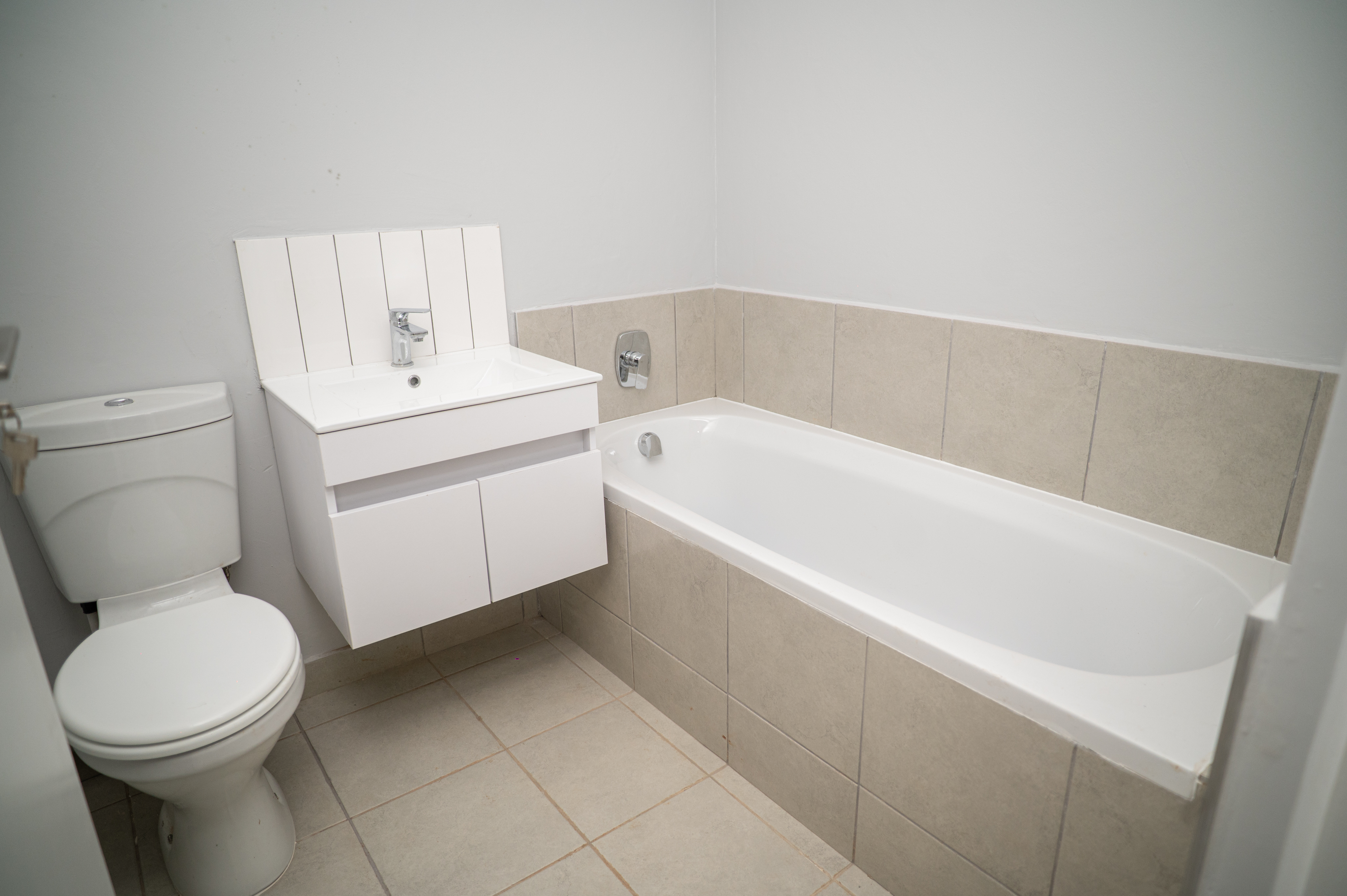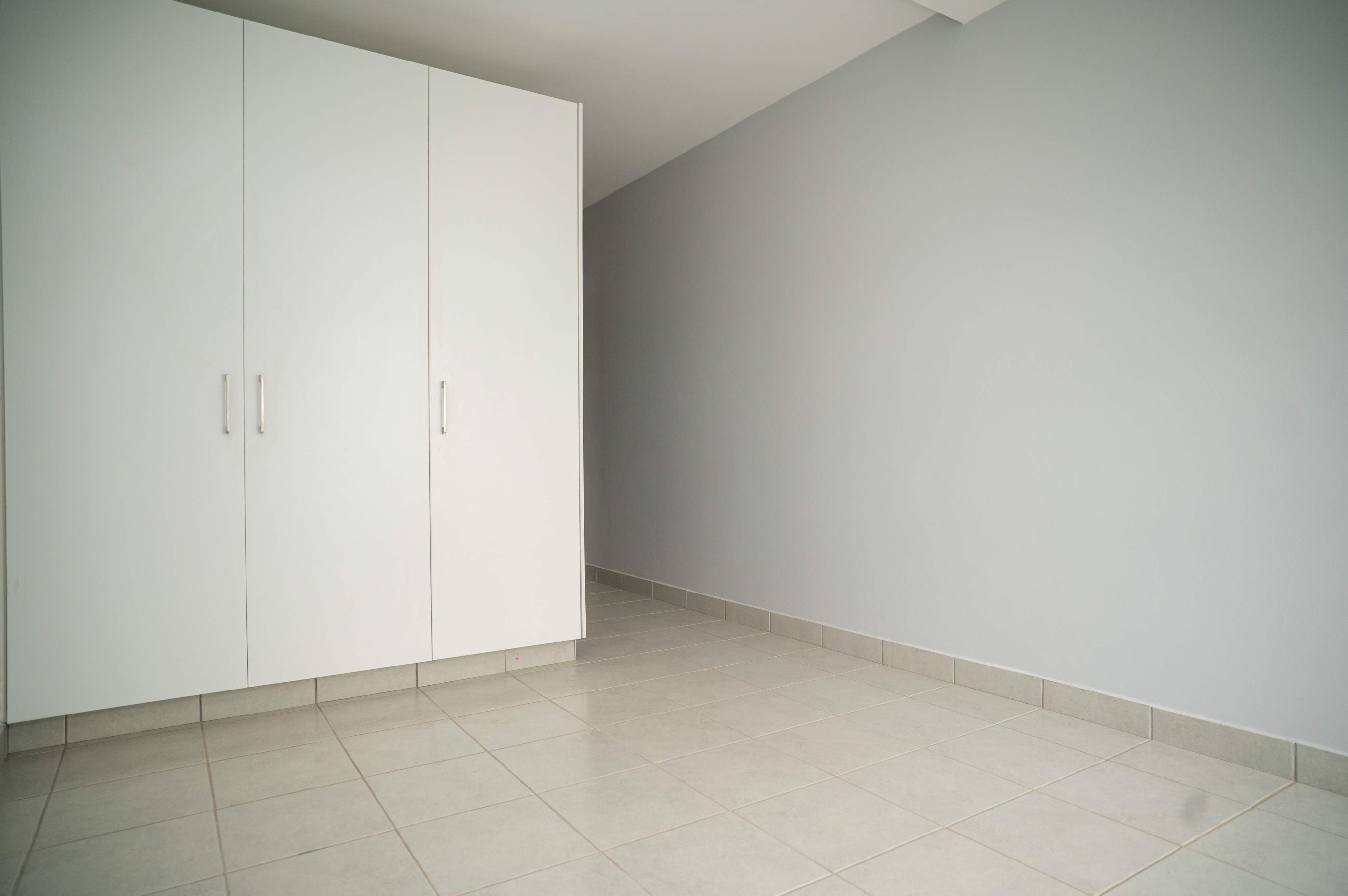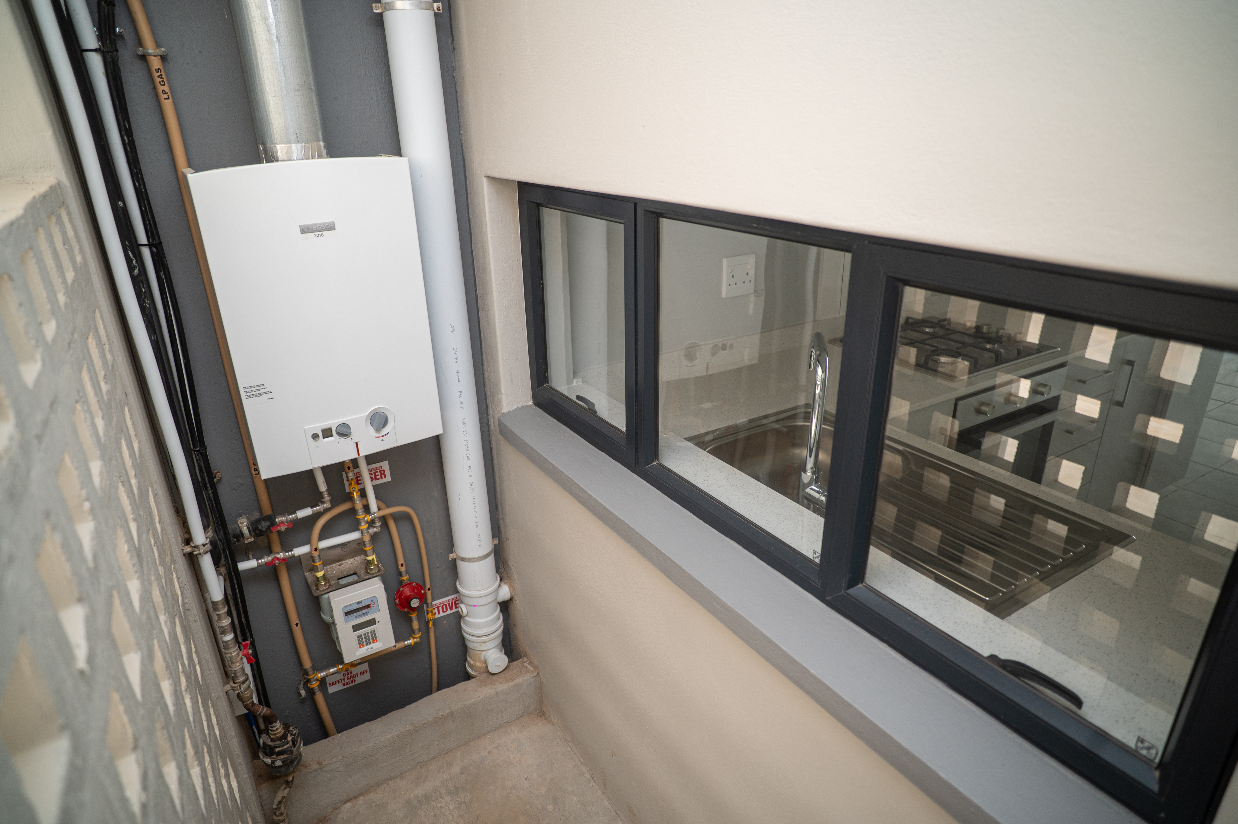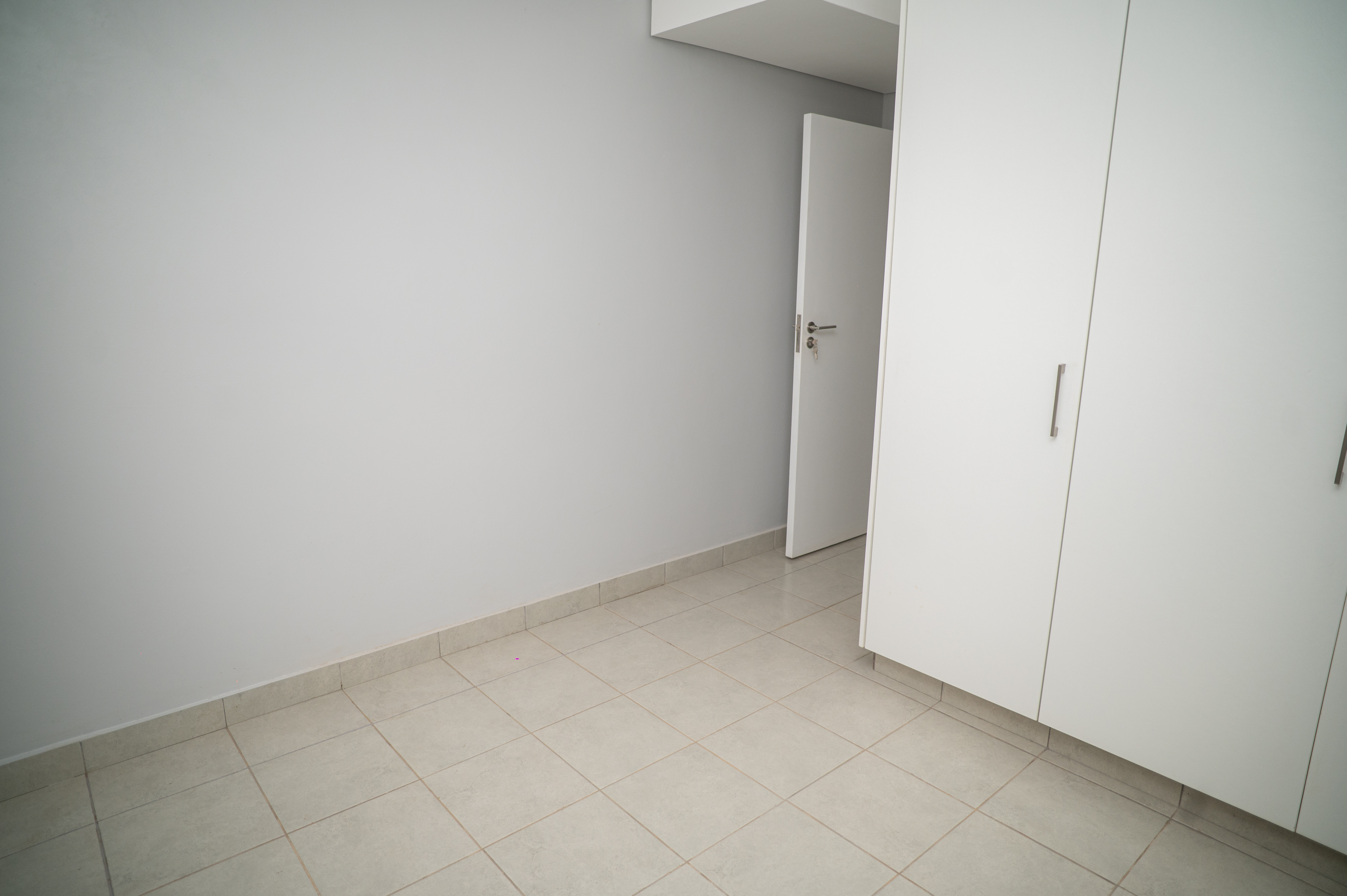 The unit features an open-plan kitchen and lounge area that opens onto a private balcony, where you can enjoy lovely views across the estate. The kitchen is fitted with a gas hob, and the apartment includes a gas geyser with a prepaid system for added convenience and energy efficiency. The entire unit is fully tiled, creating a clean, modern finish throughout.