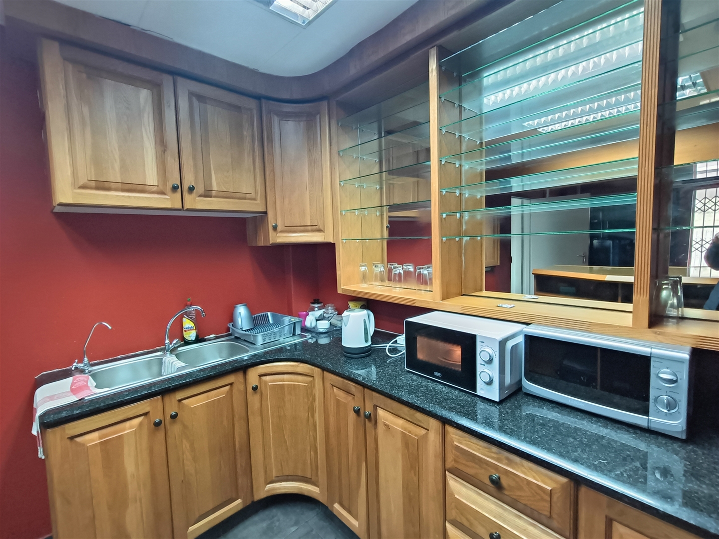 The property boasts an open-plan reception area, five partitioned offices, a kitchenette, a storeroom, and three exclusive-use parking bays in the basement. There is a communal boardroom upstairs as well as communal ablution facilities. There are automated gate access to the yard parking and basement. Other features are CCTV monitoring, an alarm system, LED lights for loadshedding and intercom access control into the main building.
