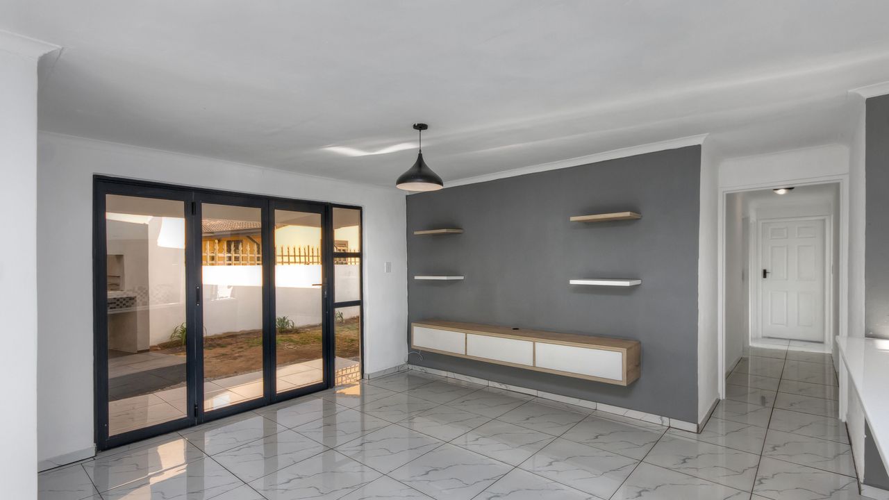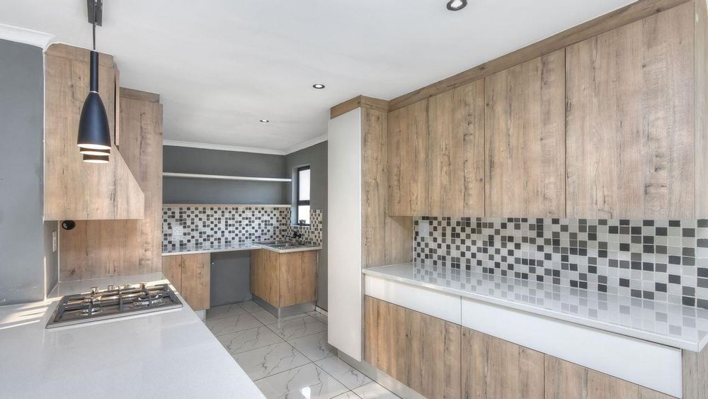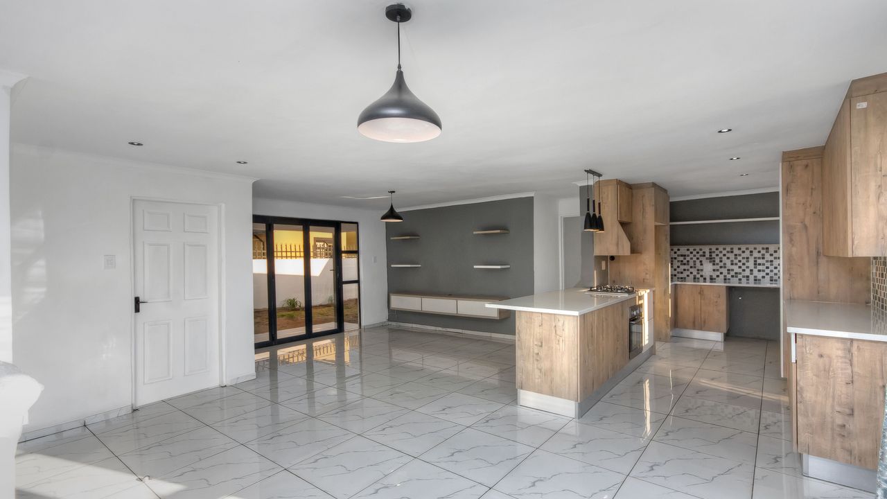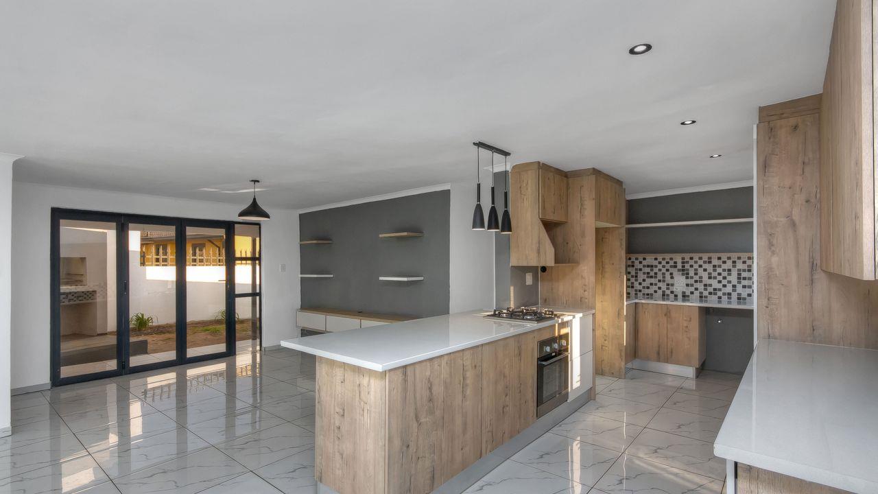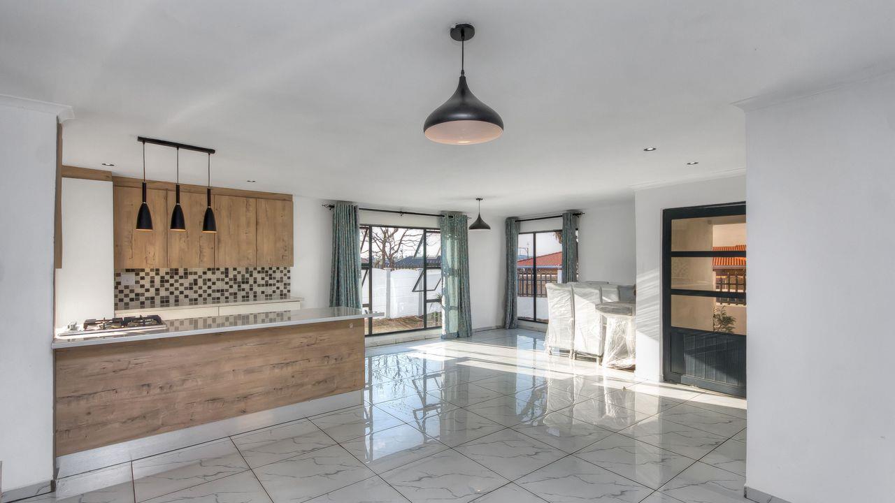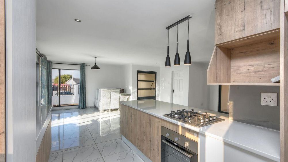 Open plan lounge, dining room and modern kitchen with gas stove.