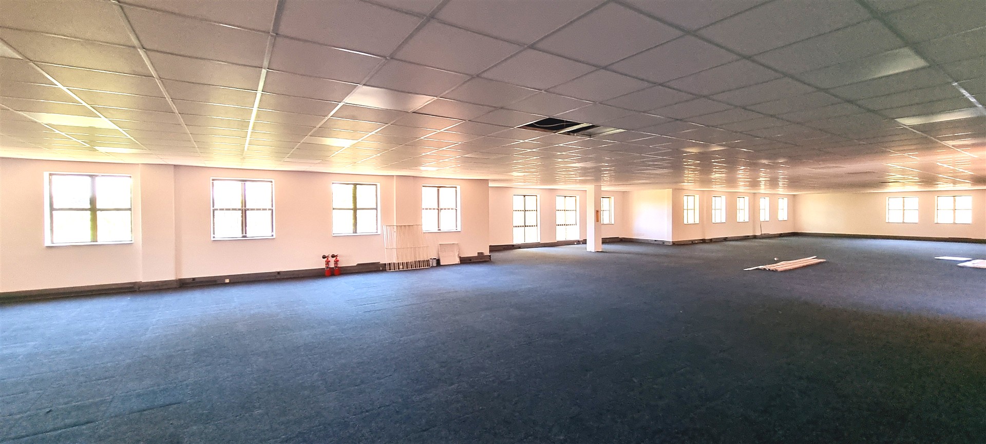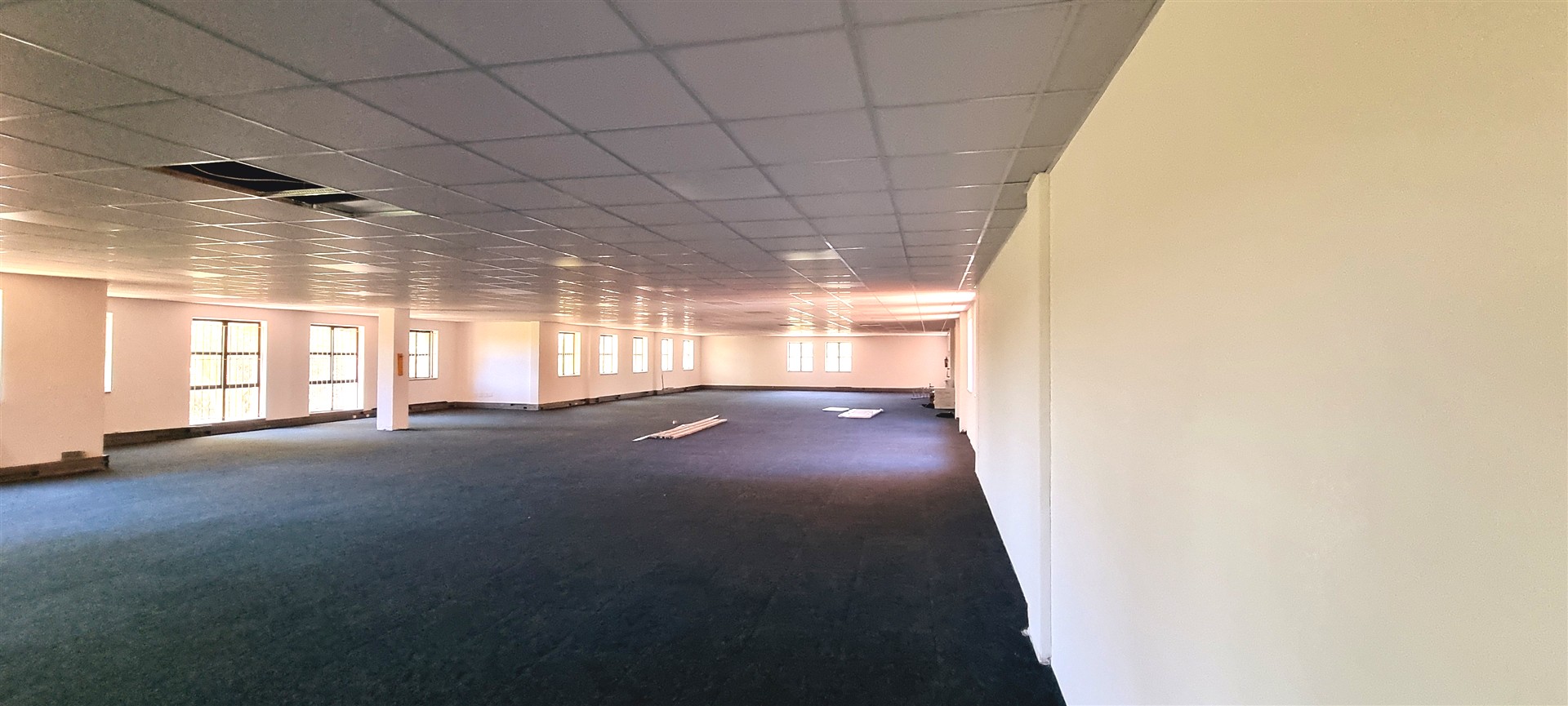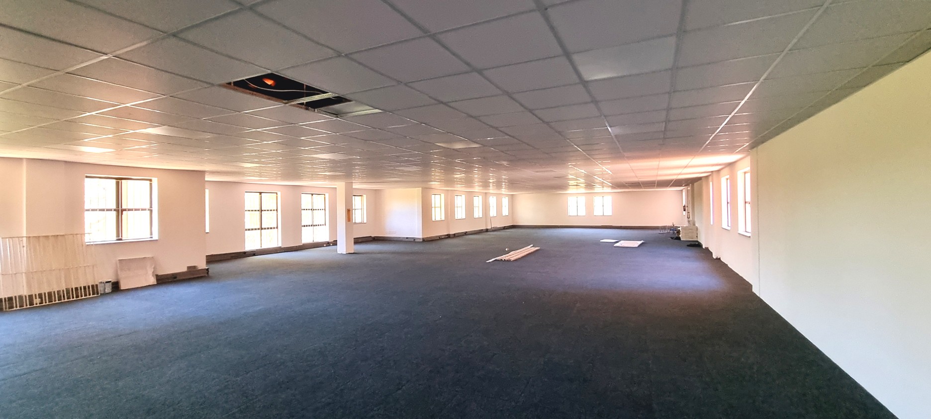 This office space is completely carpeted and open plan, with new ceiling boards.