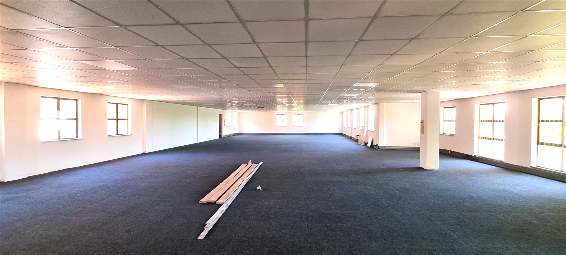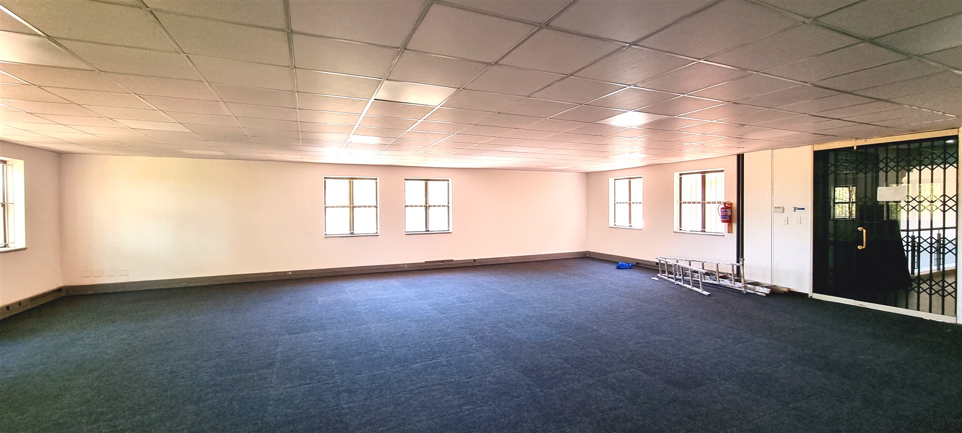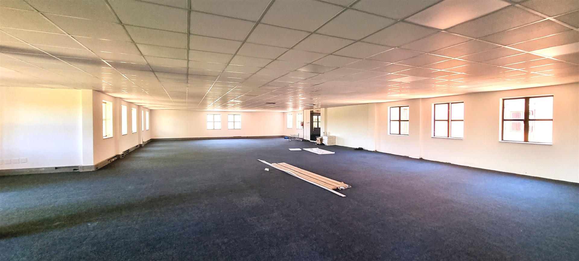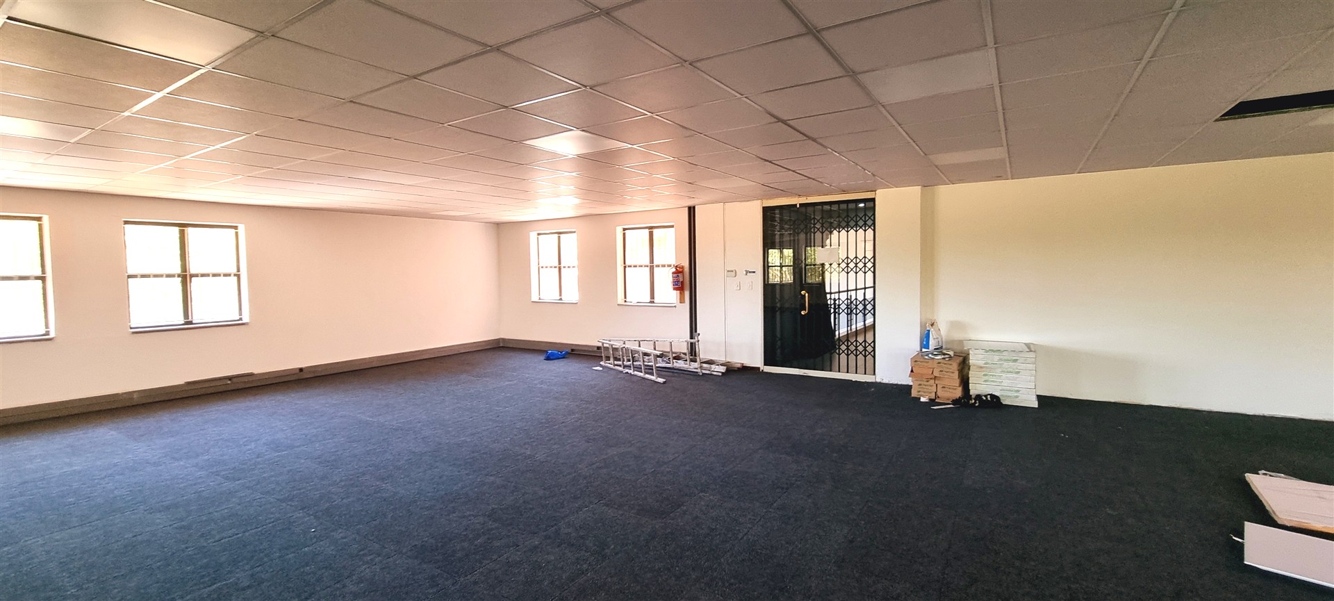 This office space is completely carpeted and open plan, with new ceiling boards.