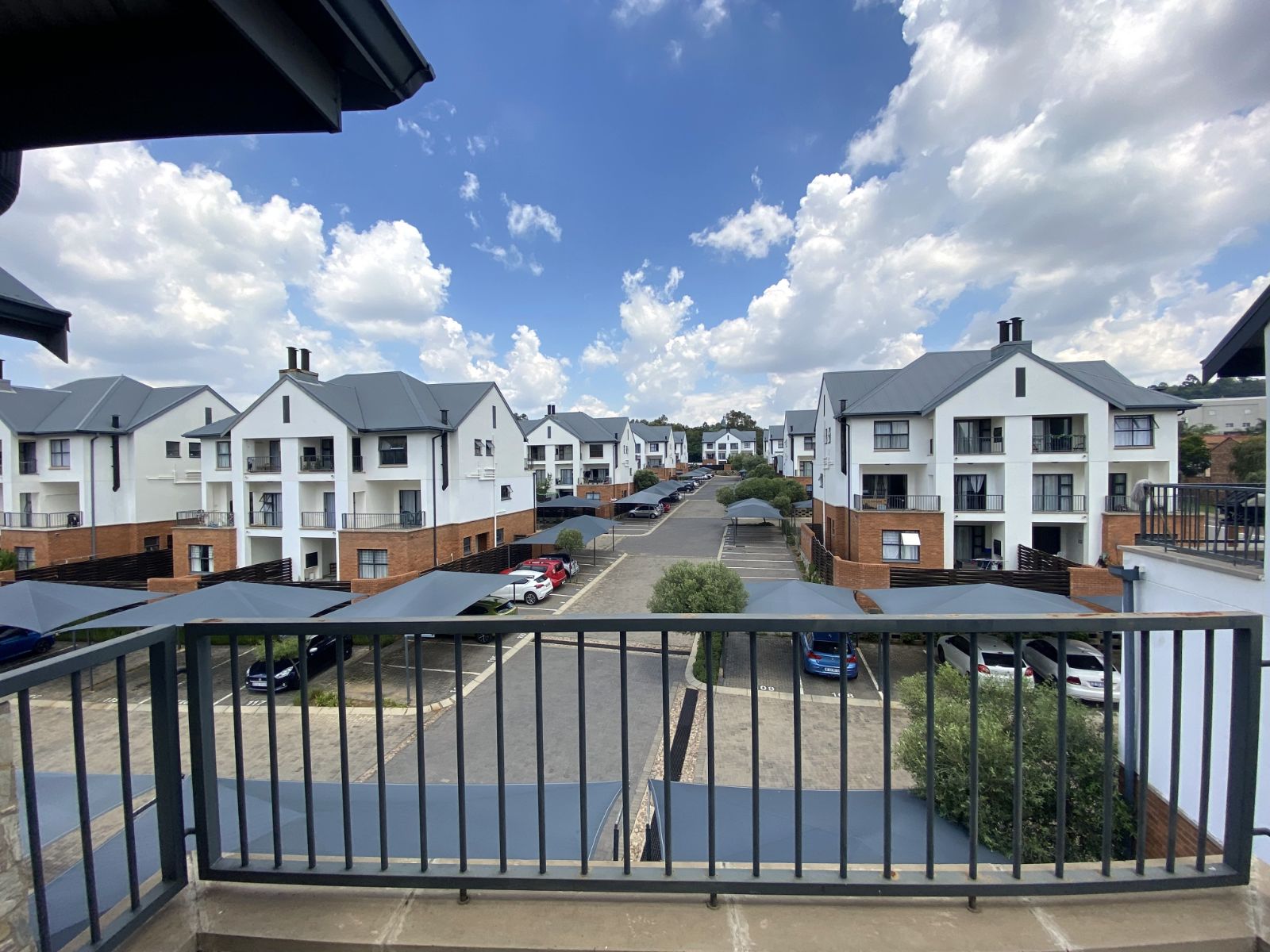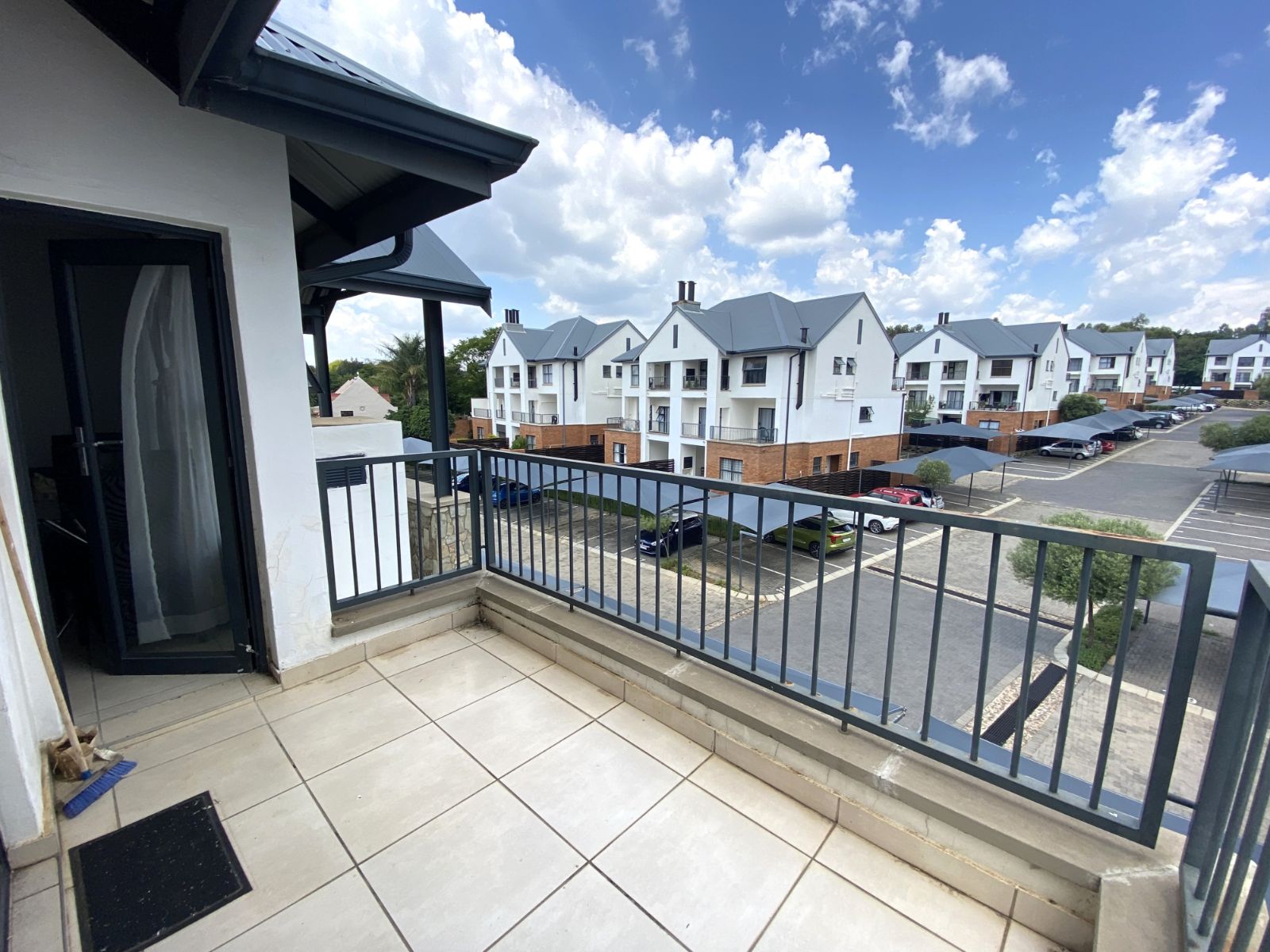 The sizeable bedroom features a door leading to a private balcony, offering a stunning view of the complex. The separate bathroom includes a shower, toilet, and basin for added convenience. The open-plan kitchen and living area create a welcoming and functional space, with the living area also opening onto the shared balcony, making it perfect for relaxation or entertaining.