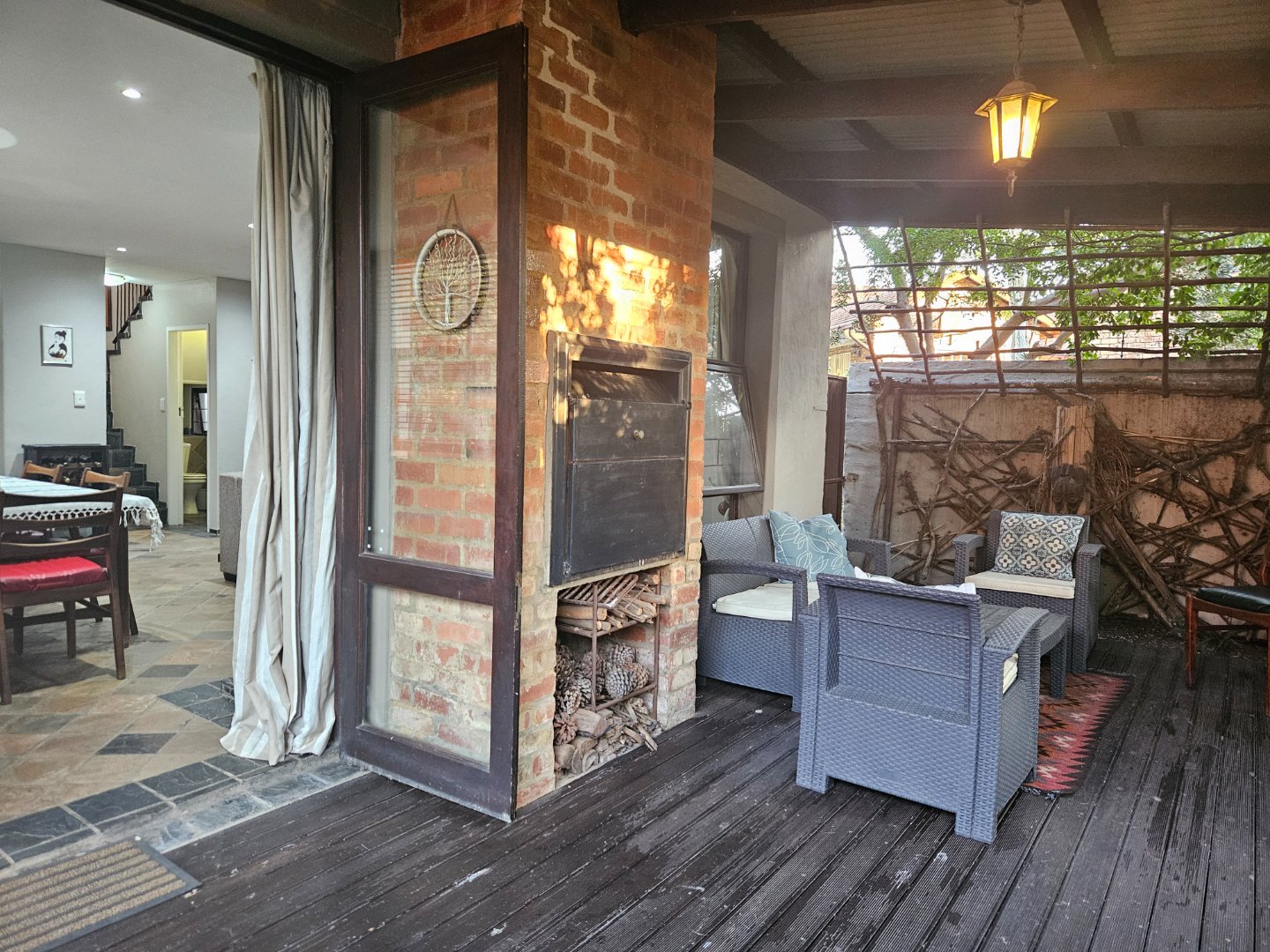 This beautifully appointed freestanding three-bedroom home is located in a secure, French-inspired estate governed by a well-maintained homeowners’ association. Designed with warmth and character, the home features two full bathrooms upstairs and a convenient guest toilet downstairs. The spacious lounge, complete with a cozy fireplace, flows seamlessly to the outdoor entertainment area through elegant French doors. Step onto a wooden deck with a built-in braai, ideal for gatherings and relaxed weekends.