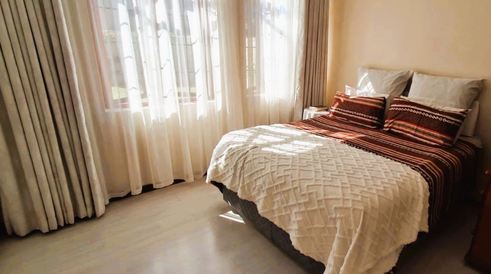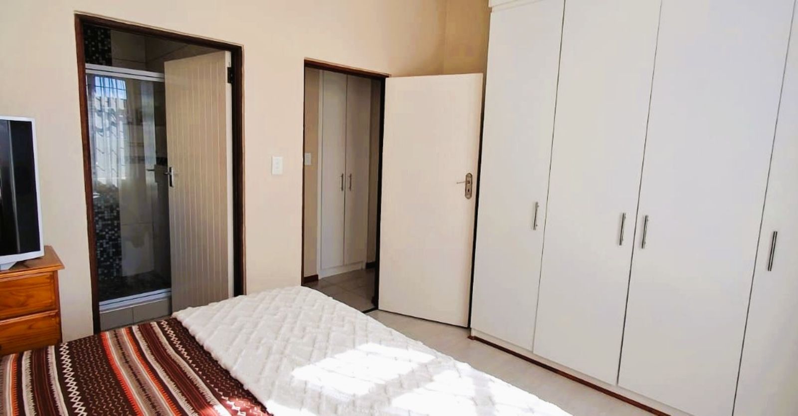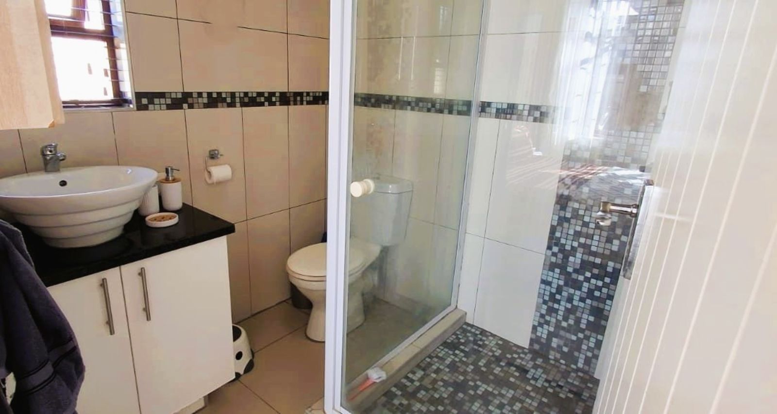 Accommodation includes 3 well-sized bedrooms with built-in cupboards. The main bedroom features an en-suite bathroom, and there’s a second full, stylish bathroom for family or guests.